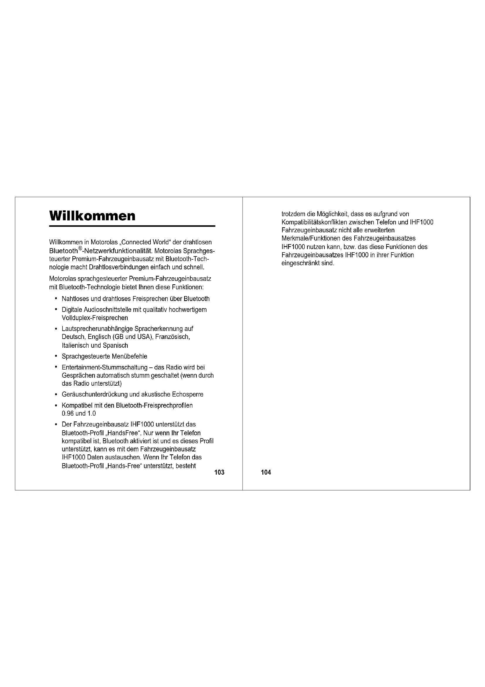 trotzdem die Möglichkeit, dass es aufgrund von Kompatibilitätskonflikten zwischen Telefon und IHF1000 Fahrzeugeinbausatz nicht alle erweiterten Merkmale/Funktionen des Fahrzeugeinbausatzes IHF1000 nutzen kann, bzw. das diese Funktionen des Fahrzeugeinbausatzes IHF1000 in ihrer Funktion eingeschränkt sind.105 Inhalt Willkommen