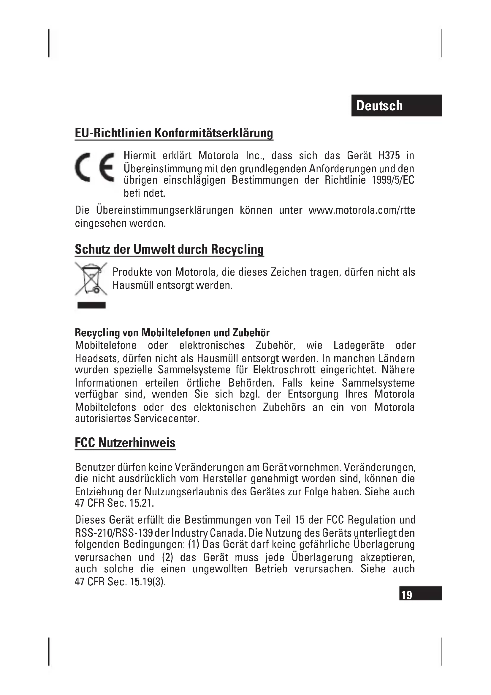 EU-Richtlinien Konformitätserklärung Hiermit erklärt Motorola Inc., dass sich das Gerät H375 in Übereinstimmung mit den grundlegenden Anforderungen und den übrigen einschlägigen Bestimmungen der Richtlinie 1999/5/EC befi ndet. Die Übereinstimmungserklärungen können unter www.motorola.com/rtte eingesehen werden. Schutz der Umwelt durch Recycling Produkte von Motorola, die dieses Zeichen tragen, dürfen nicht als Hausmüll entsorgt werden. Recycling von Mobiltelefonen und Zubehör Mobiltelefone oder elektronisches Zubehör, wie Ladegeräte oder Headsets, dürfen nicht als Hausmüll entsorgt werden. In manchen Ländern wurden spezielle Sammelsysteme für Elektroschrott eingerichtet. Nähere Informationen erteilen örtliche Behörden. Falls keine Sammelsysteme verfügbar sind, wenden Sie sich bzgl. der Entsorgung Ihres Motorola Mobiltelefons oder des elektonischen Zubehörs an ein von Motorola autorisiertes Servicecenter. FCC Nutzerhinweis Benutzer dürfen keine Veränderungen am Gerät vornehmen. Veränderungen, die nicht ausdrücklich vom Hersteller genehmigt worden sind, können die Entziehung der Nutzungserlaubnis des Gerätes zur Folge haben. Siehe auch 47 CFR Sec. 15.21. Dieses Gerät erfüllt die Bestimmungen von Teil 15 der FCC Regulation und RSS-210/RSS-139 der Industry Canada. Die Nutzung des Geräts unterliegt den folgenden Bedingungen: (1) Das Gerät darf keine gefährliche Überlagerung verursachen und (2) das Gerät muss jede Überlagerung akzeptieren, auch solche die einen ungewollten Betrieb verursachen. Siehe auch 47 CFR Sec. 15.19(3).Deutsch