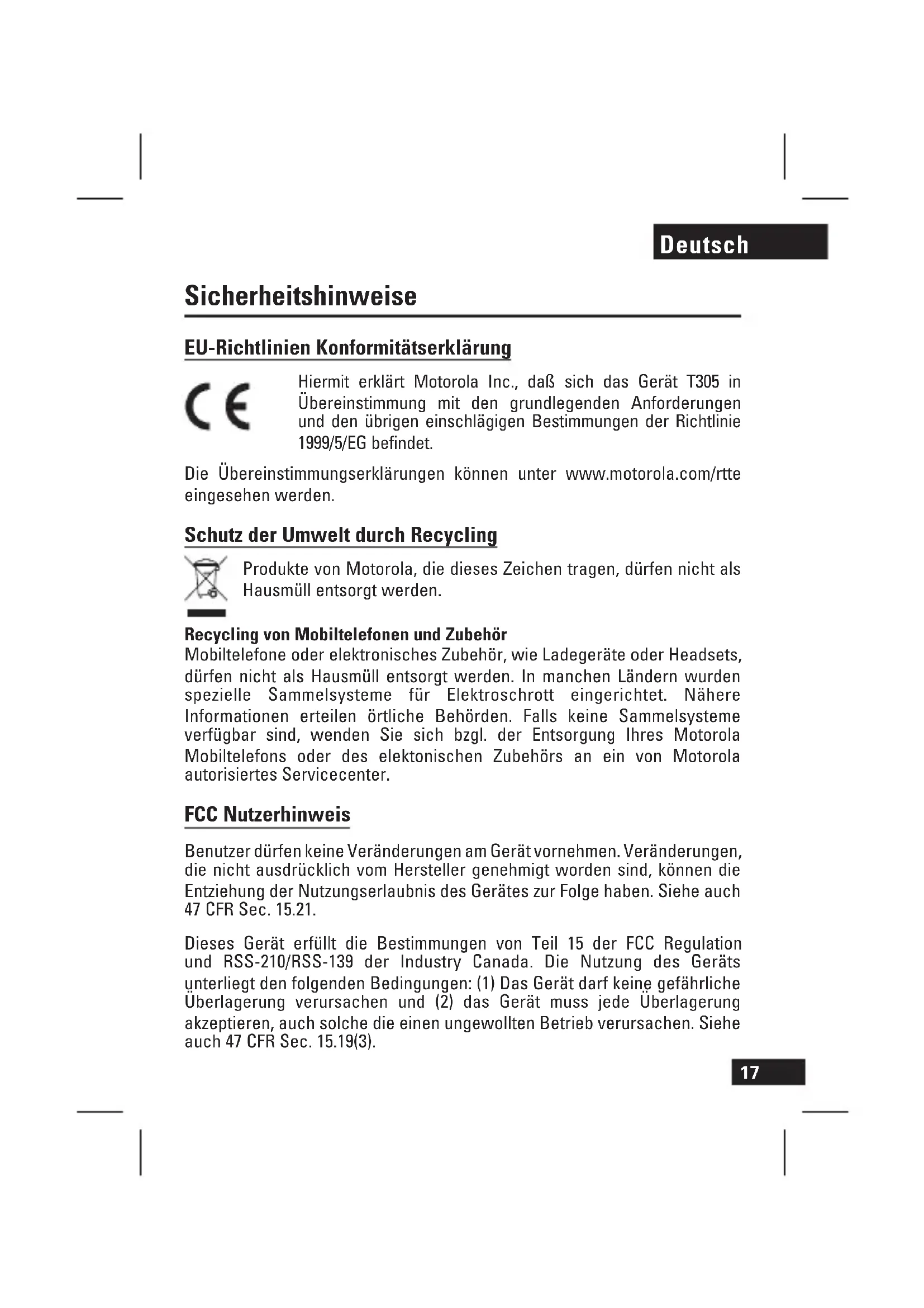 Deutsch Sicherheitshinweise EU-Richtlinien Konformitätserklärung Hiermit erklärt Motorola Inc., daß sich das Gerät T305 in Übereinstimmung mit den grundlegenden Anforderungen und den übrigen einschlägigen Bestimmungen der Richtlinie 1999/5/EG befindet. Die Übereinstimmungserklärungen können unter www.motorola.com/rtte eingesehen werden. Schutz der Umwelt durch Recycling Produkte von Motorola, die dieses Zeichen tragen, dürfen nicht als Hausmüll entsorgt werden. Recycling von Mobiltelefonen und Zubehör Mobiltelefone oder elektronisches Zubehör, wie Ladegeräte oder Headsets, dürfen nicht als Hausmüll entsorgt werden. In manchen Ländern wurden spezielle Sammelsysteme für Elektroschrott eingerichtet. Nähere Informationen erteilen örtliche Behörden. Falls keine Sammelsysteme verfügbar sind, wenden Sie sich bzgl. der Entsorgung Ihres Motorola Mobiltelefons oder des elektonischen Zubehörs an ein von Motorola autorisiertes Servicecenter. FCC Nutzerhinweis Benutzer dürfen keine Veränderungen am Gerät vornehmen. Veränderungen, die nicht ausdrücklich vom Hersteller genehmigt worden sind, können die Entziehung der Nutzungserlaubnis des Gerätes zur Folge haben. Siehe auch 47 CFR Sec. 15.21. Dieses Gerät erfüllt die Bestimmungen von Teil 15 der FCC Regulation und RSS-210/RSS-139 der Industry Canada. Die Nutzung des Geräts unterliegt den folgenden Bedingungen: (1) Das Gerät darf keine gefährliche Überlagerung verursachen und (2) das Gerät muss jede Überlagerung akzeptieren, auch solche die einen ungewollten Betrieb verursachen. Siehe auch 47 CFR Sec. 15.19(3).18 Deutsch Grundeinstellungen Willkommen in der Welt der digitalen Mobilkommunikation von Motorola! Wir freuen uns, dass Sie sich für die tragbare Bluetooth® Freisprecheinrichtung T305 von Motorola entschieden haben. Vorbereitungen Machen Sie sich zunächst mit dem Aufbau der Freisprecheinrichtung T305 vertraut. Siehe dazu Abbildung 1 auf Seite 1. 1 Lautsprecher 2 Farbcodierte LED-Anzeige und Anruftaste 3 Lautstärkeregler (+) zum Steigern der Lautstärke 4 Lautstärkeregler (-) zum Verringern der Lautstärke 5 Einschalttaste 6 Mikrofon Freisprecheinrichtung aufladen Siehe dazu Abbildung 2 auf Seite 2. Die LED-Anzeige leuchtet dauerhaft rot, wenn der Akku geladen wird und die Freisprecheinrichtung ausgeschaltet ist. Es kann bis zu einer Minute dauern, bis die LED-Anzeige zu leuchten beginnt. Wenn der Akku der Freisprecheinrichtung vollständig geladen ist (nach etwa zwei Stunden), leuchtet die LED-Anzeige durchgängig blau. Hinweis: Während des Ladevorgangs sollte die Freisprecheinrichtung nicht mit dem dafür vorgesehenen Clip an der Sonnenblende befestigt werden. Die Freisprecheinrichtung ist während des Ladevorgangs voll funktionstüchtig. Der Akku, der zum Betrieb dieses Produkts verwendet wird, muss ordnungsgemäß entsorgt und eventuell dem Recycling-System zugeführt werden. Hinweise zum ordnungsgemäßen Entsorgen erhalten Sie bei einer Recycling-Stelle in Ihrer Nähe. Akkus niemals verbrennen, da sie explodieren können.19 Deutsch