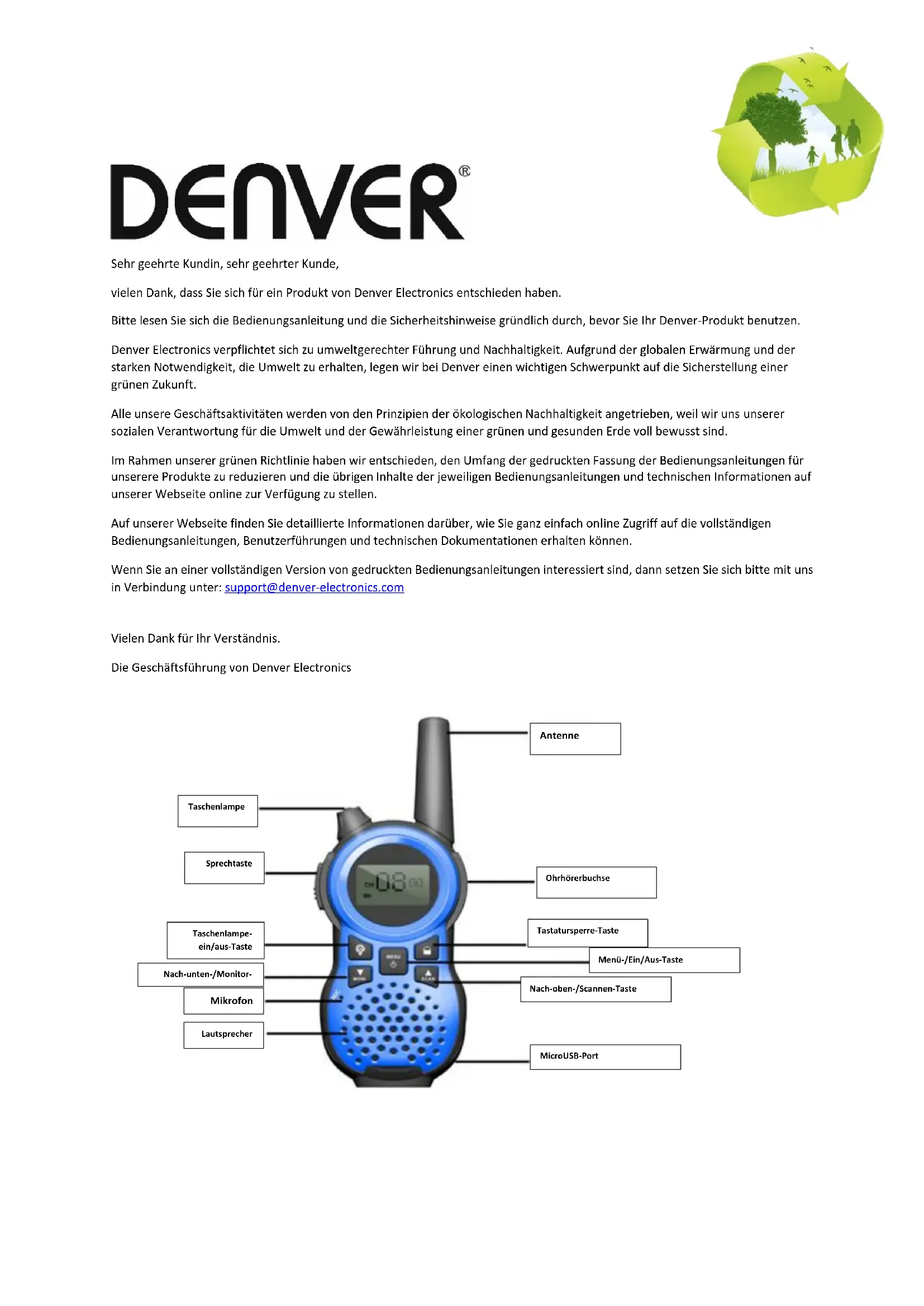 Sehr geehrte Kundin, sehr geehrter Kunde, vielen Dank, dass Sie sich für ein Produkt von Denver Electronics entschieden haben. Bitte lesen Sie sich die Bedienungsanleitung und die Sicherheitshinweise gründlich durch, bevor Sie Ihr Denver-Produkt benutzen. Denver Electronics verpflichtet sich zu umweltgerechter Führung und Nachhaltigkeit. Aufgrund der globalen Erwärmung und der starken Notwendigkeit, die Umwelt zu erhalten, legen wir bei Denver einen wichtigen Schwerpunkt auf die Sicherstellung einer grünen Zukunft. Alle unsere Geschäftsaktivitäten werden von den Prinzipien der ökologischen Nachhaltigkeit angetrieben, weil wir uns unserer sozialen Verantwortung für die Umwelt und der Gewährleistung einer grünen und gesunden Erde voll bewusst sind. Im Rahmen unserer grünen Richtlinie haben wir entschieden, den Umfang der gedruckten Fassung der Bedienungsanleitungen für unserere Produkte zu reduzieren und die übrigen Inhalte der jeweiligen Bedienungsanleitungen und technischen Informationen auf unserer Webseite online zur Verfügung zu stellen. Auf unserer Webseite finden Sie detaillierte Informationen darüber, wie Sie ganz einfach online Zugriff auf die vollständigen Bedienungsanleitungen, Benutzerführungen und technischen Dokumentationen erhalten können. Wenn Sie an einer vollständigen Version von gedruckten Bedienungsanleitungen interessiert sind, dann setzen Sie sich bitte mit uns in Verbindung unter: support@denver-electronics.com Vielen Dank für Ihr Verständnis. Die Geschäftsführung von Denver Electronics