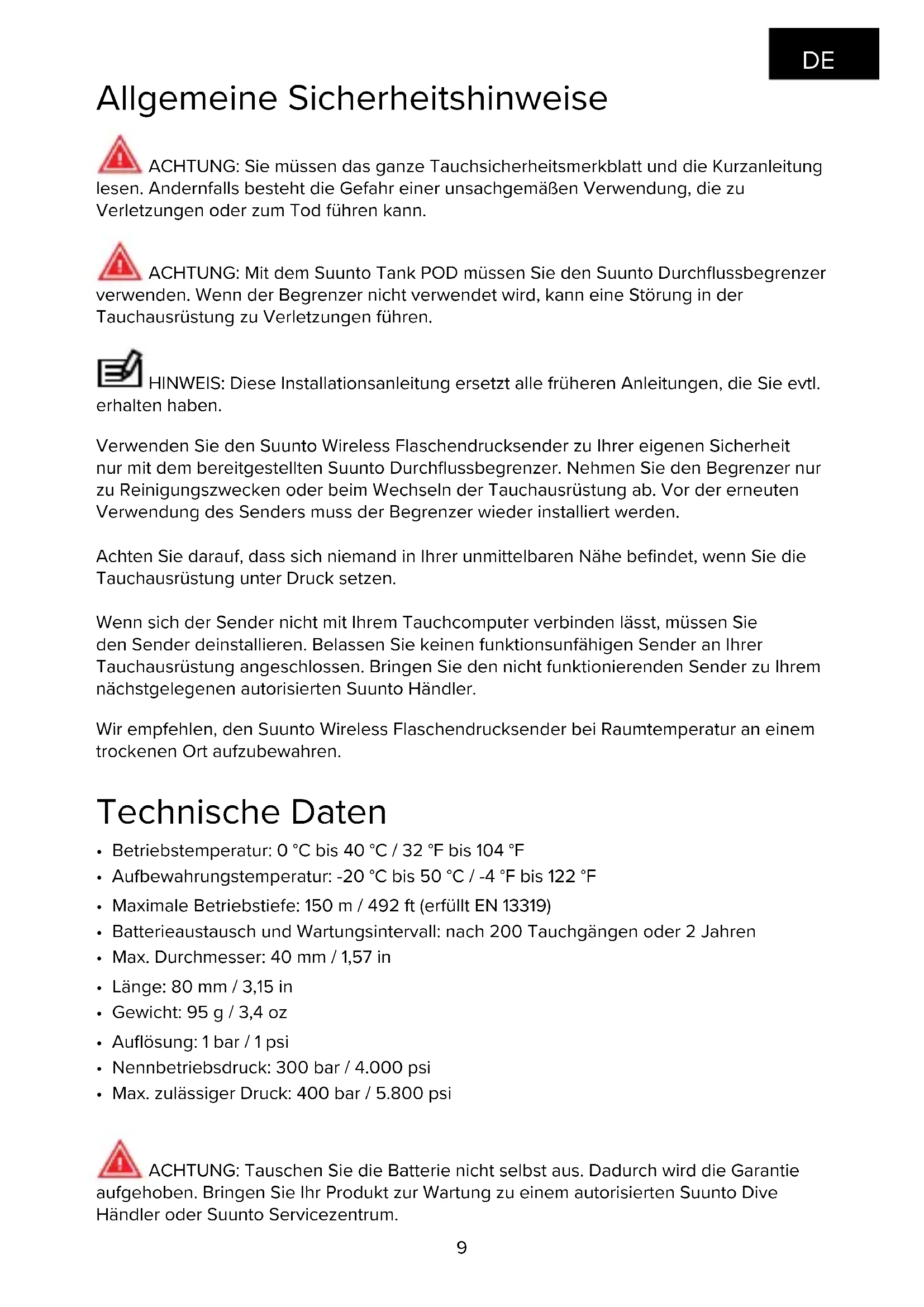 confirm connection. NOTE: Older Transmitter devices do not have the LED.9 Allgemeine Sicherheitshinweise ACHTUNG: Sie müssen das ganze Tauchsicherheitsmerkblatt und die Kurzanleitung lesen. Andernfalls besteht die Gefahr einer unsachgemäßen Verwendung, die zu Verletzungen oder zum Tod führen kann. ACHTUNG: Mit dem Suunto Tank POD müssen Sie den Suunto Durchflussbegrenzer verwenden. Wenn der Begrenzer nicht verwendet wird, kann eine Störung in der Tauchausrüstung zu Verletzungen führen. HINWEIS: Diese Installationsanleitung ersetzt alle früheren Anleitungen, die Sie evtl. erhalten haben. Verwenden Sie den Suunto Wireless Flaschendrucksender zu Ihrer eigenen Sicherheit nur mit dem bereitgestellten Suunto Durchflussbegrenzer. Nehmen Sie den Begrenzer nur zu Reinigungszwecken oder beim Wechseln der Tauchausrüstung ab. Vor der erneuten Verwendung des Senders muss der Begrenzer wieder installiert werden. Achten Sie darauf, dass sich niemand in Ihrer unmittelbaren Nähe befindet, wenn Sie die Tauchausrüstung unter Druck setzen. Wenn sich der Sender nicht mit Ihrem Tauchcomputer verbinden lässt, müssen Sie den Sender deinstallieren. Belassen Sie keinen funktionsunfähigen Sender an Ihrer Tauchausrüstung angeschlossen. Bringen Sie den nicht funktionierenden Sender zu Ihrem nächstgelegenen autorisierten Suunto Händler. Wir empfehlen, den Suunto Wireless Flaschendrucksender bei Raumtemperatur an einem trockenen Ort aufzubewahren. Technische Daten