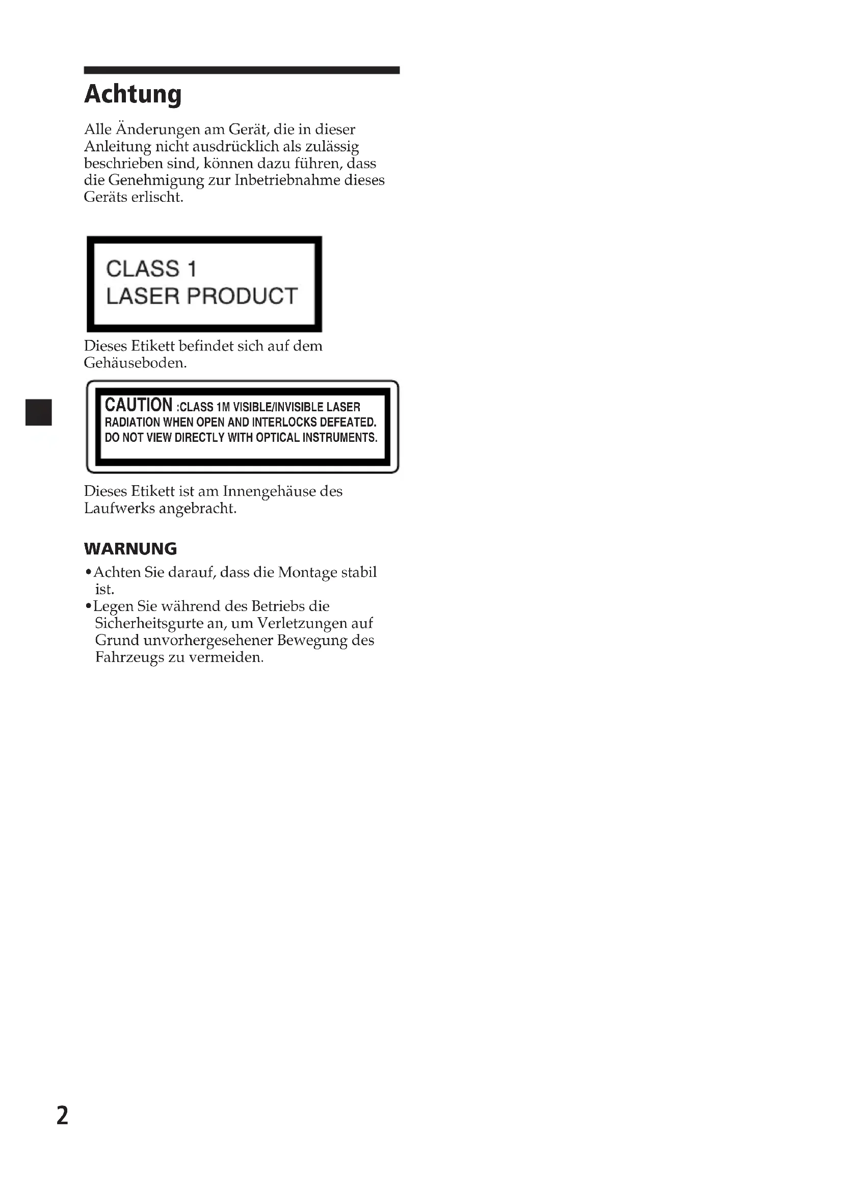 - Während der Fahrt — Der Fahrer darf weder auf den Player schauen noch ihn bedienen. Andernfalls könnte er abgelenkt werden und einen Unfall verursachen. — Der Fahrer darf keine Kopfhörer tragen. Andernfalls könnte er abgelenkt werden und einen Unfall verursachen. Parken Sie das Fahrzeug an einem sicheren Ort, wenn der Fahrer den Player ansieht und bedient oder die Kopfhörer benutzt.