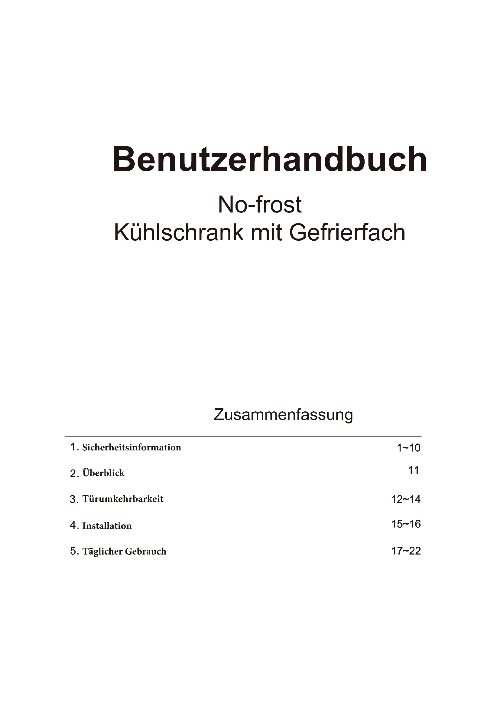 12~14 15~16 17~22 Benutzerhandbuch No-frost Kühlschrank mit GefrierfachVielen Dank für den Kauf dieses Produkts. Bevor Sie den Kühlschrank benutzen, lesen Sie bitte aufmerksam diese Bedienungsanleitung, um das Gerät optimal zu nutzen. Bewahren Sie alle Unterlagen für spätere Zwecke oder Nachbesitzer auf. Dieses Produkt ist nur für Privathaushalte oder ähnliche Anwendungszwecke vorgesehen: - Personalküche in Geschäften, Büros und anderen Arbeitsumgebungen - landwirtschaftliche Betriebe, Hotels, Motels und andere Wohnumgebungen - Frühstückspensionen - Party-Servicedienste und ähnliche nicht dem Einzelverkauf dienende Anwendungen. Dies es Gerät darf nur zur Lagerung von Lebensmitteln benutzt werden. Jede andere Benutzung gilt als gefährlich und führt zum Haftungsausschluss des Herstellers. Darüber hinaus sollten Sie die Garantiebedingungen beachten. SICHERHEITSHINWEISE Bitte lesen Sie die Bedienungs- und Installationsanleitung sorgfältig durch! Sie enthalten wichtige Informationen, wie das Gerät installiert, verwendet und gewartet werden soll. Der Hersteller haftet nicht, wenn Sie die Anweisungen und Warnungen nicht beachten. Bewahren Sie die gesamte Dokumentation zum Nachschlagen oder für einen eventuellen späteren Besitzer auf.