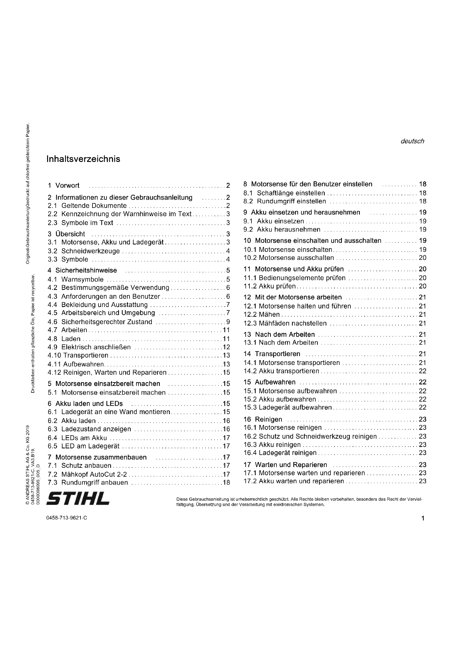 Druckfarben enthalten pflanzliche Öle, Papier ist recycelbar. © ANDREAS STIHL AG & Co. KG 2019 0458-713-9621-C. VA3.B19. 0000008095_005_D 0458-713-9621-C deutsch