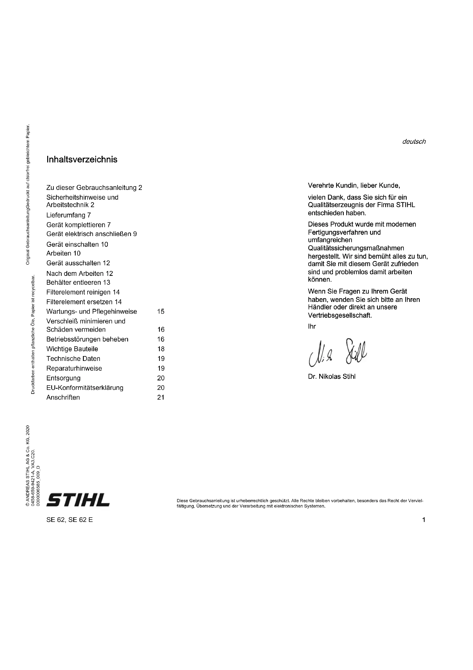 Diese Gebrauchsanleitung ist urheberrechtlich geschützt. Alle Rechte bleiben vorbehalten, besonders das Recht der Verviel- fältigung, Übersetzung und der Verarbeitung mit elektronischen Systemen. Inhaltsverzeichnis Verehrte Kundin, lieber Kunde, vielen Dank, dass Sie sich für ein Qualitätserzeugnis der Firma STIHL entschieden haben. Dieses Produkt wurde mit modernen Fertigungsverfahren und umfangreichen Qualitätssicherungsmaßnahmen hergestellt. Wir sind bemüht alles zu tun, damit Sie mit diesem Gerät zufrieden sind und problemlos damit arbeiten können. Wenn Sie Fragen zu Ihrem Gerät haben, wenden Sie sich bitte an Ihren Händler oder direkt an unsere Vertriebsgesellschaft. Ihr Dr. Nikolas Stihl Zu dieser Gebrauchsanleitung 2 Sicherheitshinweise und Arbeitstechnik 2 Lieferumfang 7 Gerät komplettieren 7 Gerät elektrisch anschließen 9 Gerät einschalten 10 Arbeiten 10 Gerät ausschalten 12 Nach dem Arbeiten 12 Behälter entleeren 13 Filterelement reinigen 14 Filterelement ersetzen 14 Wartungs- und Pflegehinweise 15 Verschleiß minimieren und Schäden vermeiden 16 Betriebsstörungen beheben 16 Wichtige Bauteile 18 Technische Daten 19 Reparaturhinweise 19 Entsorgung 20 EU-Konformitätserklärung 20 Anschriften 21SE 62, SE 62 E deutsch