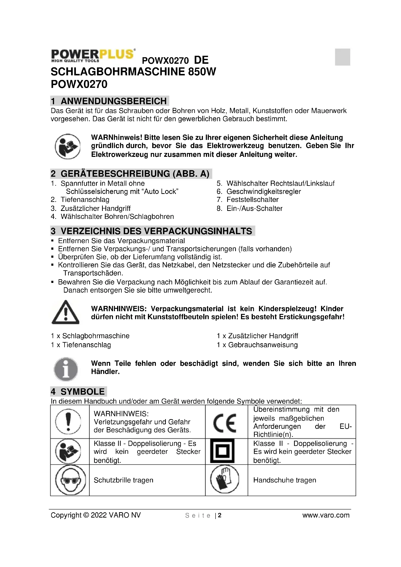 Copyright © 2022 VARO NV S e i t e | 2 www.varo.com SCHLAGBOHRMASCHINE 850W POWX0270 1 ANWENDUNGSBEREICH Das Gerät ist für das Schrauben oder Bohren von Holz, Metall, Kunststoffen oder Mauerwerk vorgesehen. Das Gerät ist nicht für den gewerblichen Gebrauch bestimmt. WARNhinweis! Bitte lesen Sie zu Ihrer eigenen Sicherheit diese Anleitung gründlich durch, bevor Sie das Elektrowerkzeug benutzen. Geben Sie Ihr Elektrowerkzeug nur zusammen mit dieser Anleitung weiter. 2 GERÄTEBESCHREIBUNG (ABB. A)