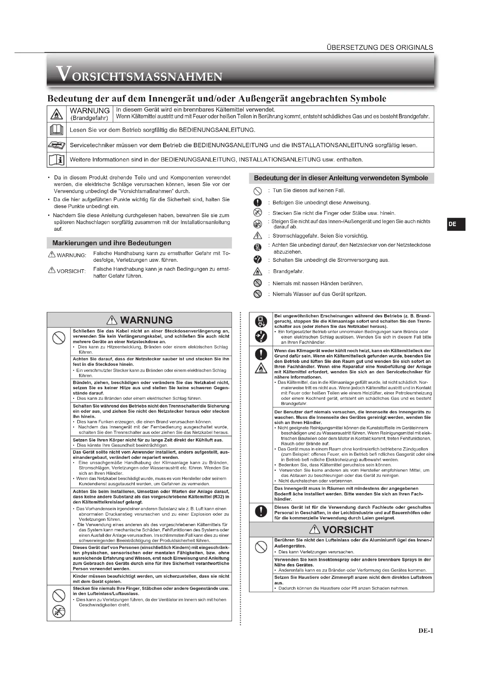 - Da in diesem Produkt drehende Teile und und Komponenten verwendet werden, die elektrische Schläge verursachen können, lesen Sie vor der Verwendung unbedingt die “Vorsichtsmaßnahmen” durch.• Da die hier aufgeführten Punkte wichtig für die Sicherheit sind, halten Sie diese Punkte unbedingt ein.• Nachdem Sie diese Anleitung durchgelesen haben, bewahren Sie sie zum späteren Nachschlagen sorgfältig zusammen mit der Installationsanleitung auf. Markierungen und ihre Bedeutungen WARNUNG:Falsche Handhabung kann zu ernsthafter Gefahr mit To-desfolge, Verletzungen usw. führen. VORSICHT:Falsche Handhabung kann je nach Bedingungen zu ernst-hafter Gefahr führen. VORSICHTSMASSNAHMEN WARNUNG Schließen Sie das Kabel nicht an einer Steckdosenverlängerung an, verwenden Sie kein Verlängerungskabel, und schließen Sie auch nicht mehrere Geräte an einer Netzsteckdose an.• Dies kann zu Hitzeentwicklung, Bränden oder einem elektrischen Schlag führen.Achten Sie darauf, dass der Netzstecker sauber ist und stecken Sie ihn fest in die Steckdose hinein.• Ein verschmutzter Stecker kann zu Bränden oder einem elektrischen Schlag führen.Bündeln, ziehen, beschädigen oder verändern Sie das Netzkabel nicht, setzen Sie es keiner Hitze aus und stellen Sie keine schweren Gegen-stände darauf.• Dies kann zu Bränden oder einem elektrischen Schlag führen.Schalten Sie während des Betriebs nicht den Trennschalter/die Sicherung ein oder aus, und ziehen Sie nicht den Netzstecker heraus oder stecken ihn hinein.• Dies kann Funken erzeugen, die einen Brand verursachen können.• Nachdem das Innengerät mit der Fernbedienung ausgeschaltet wurde, schalten Sie den Trennschalter aus oder ziehen Sie das Netzkabel heraus. Setzen Sie Ihren Körper nicht für zu lange Zeit direkt der Kühlluft aus.• Dies könnte Ihre Gesundheit beeinträchtigen.Das Gerät sollte nicht vom Anwender installiert, anders aufgestellt, aus-einandergebaut, verändert oder repariert werden.• Eine unsachgemäße Handhabung der Klimaanlage kann zu Bränden, Stromschlägen, Verletzungen oder Wasseraustritt etc. führen. Wenden Sie sich an Ihren Händler.• Wenn das Netzkabel beschädigt wurde, muss es vom Hersteller oder seinem Kundendienst ausgetauscht werden, um Gefahren zu vermeiden.Achten Sie beim Installieren, Umsetzen oder Warten der Anlage darauf, dass keine andere Substanz als das vorgeschriebene Kältemittel (R32) in den Kältemittelkreislauf gelangt.• Das Vorhandensein irgendeiner anderen Substanz wie z. B. Luft kann einen abnormalen Druckanstieg verursachen und zu einer Explosion oder zu Verletzungen führen.• Die Verwendung eines anderen als des vorgeschriebenen Kältemittels für das System kann mechanische Schäden, Fehlfunktionen des Systems oder einen Ausfall der Anlage verursachen. Im schlimmsten Fall kann dies zu einer schwerwiegenden Beeinträchtigung der Produktsicherheit führen.Dieses Gerät darf von Personen (einschließlich Kindern) mit eingeschränk-ten physischen, sensorischen oder mentalen Fähigkeiten, bzw. ohne ausreichende Erfahrung und Wissen, erst nach Einweisung und Anleitung zum Gebrauch des Geräts durch eine für ihre Sicherheit verantwortliche Person verwendet werden.Kinder müssen beaufsichtigt werden, um sicherzustellen, dass sie nicht mit dem Gerät spielen. Stecken Sie niemals Ihre Finger, Stäbchen oder andere Gegenstände usw. in den Lufteinlass/Luftauslass.• Dies kann zu Verletzungen führen, da der Ventilator im Innern sich mit hohen Geschwindigkeiten dreht. Bei ungewöhnlichen Erscheinungen während des Betriebs (z. B. Brand-geruch), stoppen Sie die Klimaanlage sofort und schalten Sie den Trenn-schalter aus (oder ziehen Sie das Netzkabel heraus).• Ein fortgesetzter Betrieb unter unnormalen Bedingungen kann Brände oder einen elektrischen Schlag auslösen. Wenden Sie sich in diesem Fall bitte an Ihren Fachhändler. Wenn das Klimagerät weder kühlt noch heizt, kann ein Kältemittelleck der Grund dafür sein. Wenn ein Kältemittelleck gefunden wurde, beenden Sie den Betrieb und lüften Sie den Raum gut und wenden Sie sich sofort an Ihren Fachhändler. Wenn eine Reparatur eine Neubefüllung der Anlage mit Kältemittel erfordert, wenden Sie sich an den Servicetechniker für nähere Informationen.• Das Kältemittel, das in die Klimaanlage gefüllt wurde, ist nicht schädlich. Nor-malerweise tritt es nicht aus. Wenn jedoch Kältemittel austritt und in Kontakt mit Feuer oder heißen Teilen wie einem Heizlüfter, einer Petroleumheizung oder einem Kochherd gerät, entsteht ein schädliches Gas und es besteht Brandgefahr.Der Benutzer darf niemals versuchen, die Innenseite des Innengeräts zu waschen. Muss die Innenseite des Gerätes gereinigt werden, wenden Sie sich an Ihren Händler.• Nicht geeignete Reinigungsmittel können die Kunststoffteile im Geräteinnern beschädigen und zu Wasseraustritt führen. Wenn Reinigungsmittel mit elek-trischen Bauteilen oder dem Motor in Kontakt kommt, treten Fehlfunktionen, Rauch oder Brände auf.• Das Gerät muss in einem Raum ohne kontinuierlich betriebene Zündquellen (zum Beispiel: offenes Feuer, ein in Betrieb befi ndliches Gasgerät oder eine in Betrieb befi ndliche Elektroheizung) aufbewahrt werden.• Bedenken Sie, dass Kältemittel geruchslos sein können.• Verwenden Sie keine anderen als vom Hersteller empfohlenen Mittel, um das Abtauen zu beschleunigen oder das Gerät zu reinigen. • Nicht durchstechen oder verbrennen.Das Innengerät muss in Räumen mit mindestens der angegebenen Bodenfl äche installiert werden. Bitte wenden Sie sich an Ihren Fach-händler.Dieses Gerät ist für die Verwendung durch Fachleute oder geschultes Personal in Geschäften, in der Leichtindustrie und auf Bauernhöfen oder für die kommerzielle Verwendung durch Laien geeignet. VORSICHT Berühren Sie nicht den Lufteinlass oder die Aluminiumfl ügel des Innen-/Außengerätes.• Dies kann Verletzungen verursachen.Verwenden Sie kein Insektenspray oder an