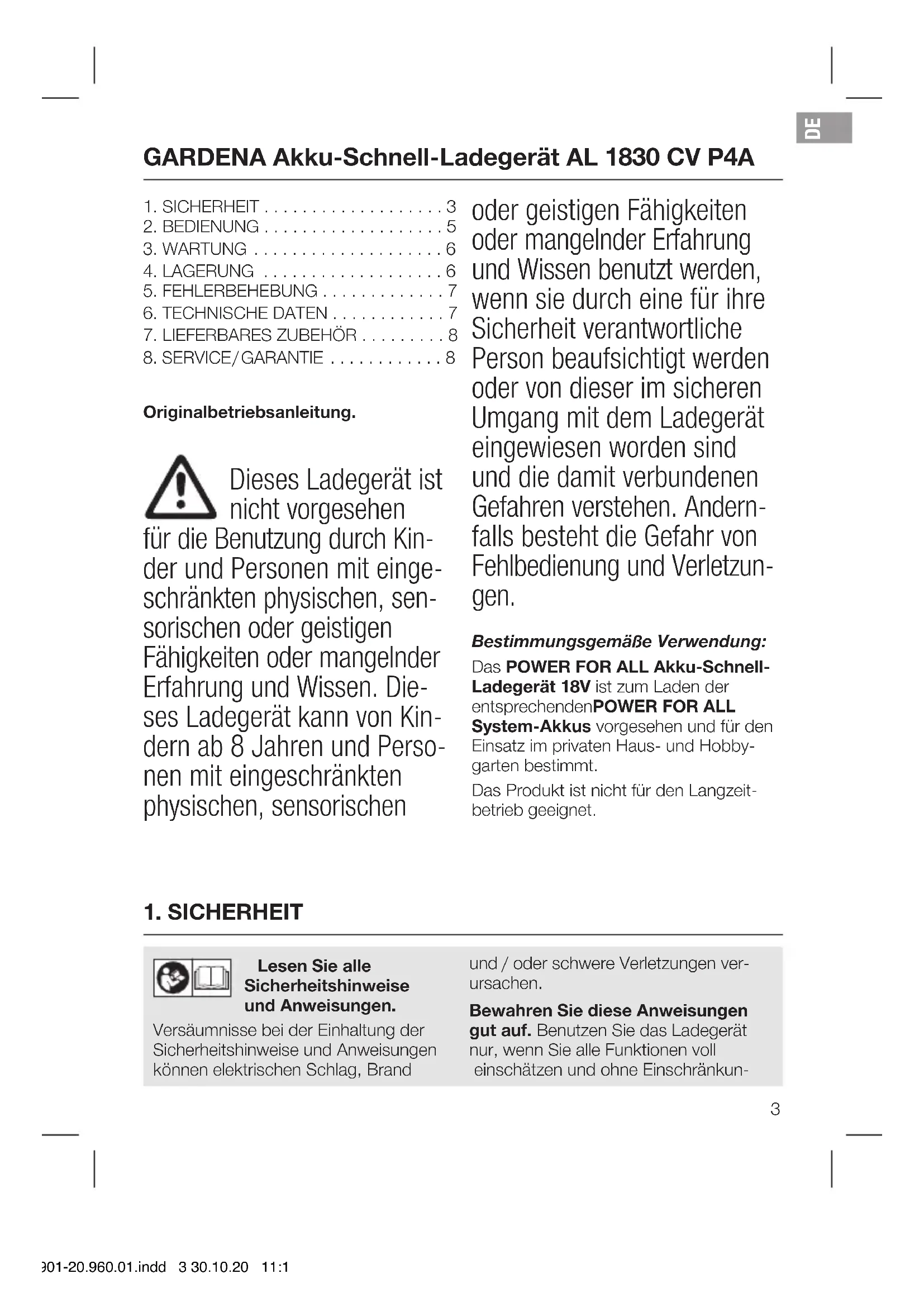 14901-20.960.01.indd 2 30.10.20 11:121. SICHERHEIT Lesen Sie alle Sicherheits hinweise und Anweisungen. Versäumnisse bei der Einhaltung der Sicherheitshinweise und Anweisungen können elektrischen Schlag, Brand und / oder schwere Verletzungen ver- ursachen. Bewahren Sie diese Anweisungen gut auf. Benutzen Sie das Ladegerät nur, wenn Sie alle Funktionen voll einschätzen und ohne Einschränkun- GARDENA Akku-Schnell-Ladegerät AL 1830 CV P4A
