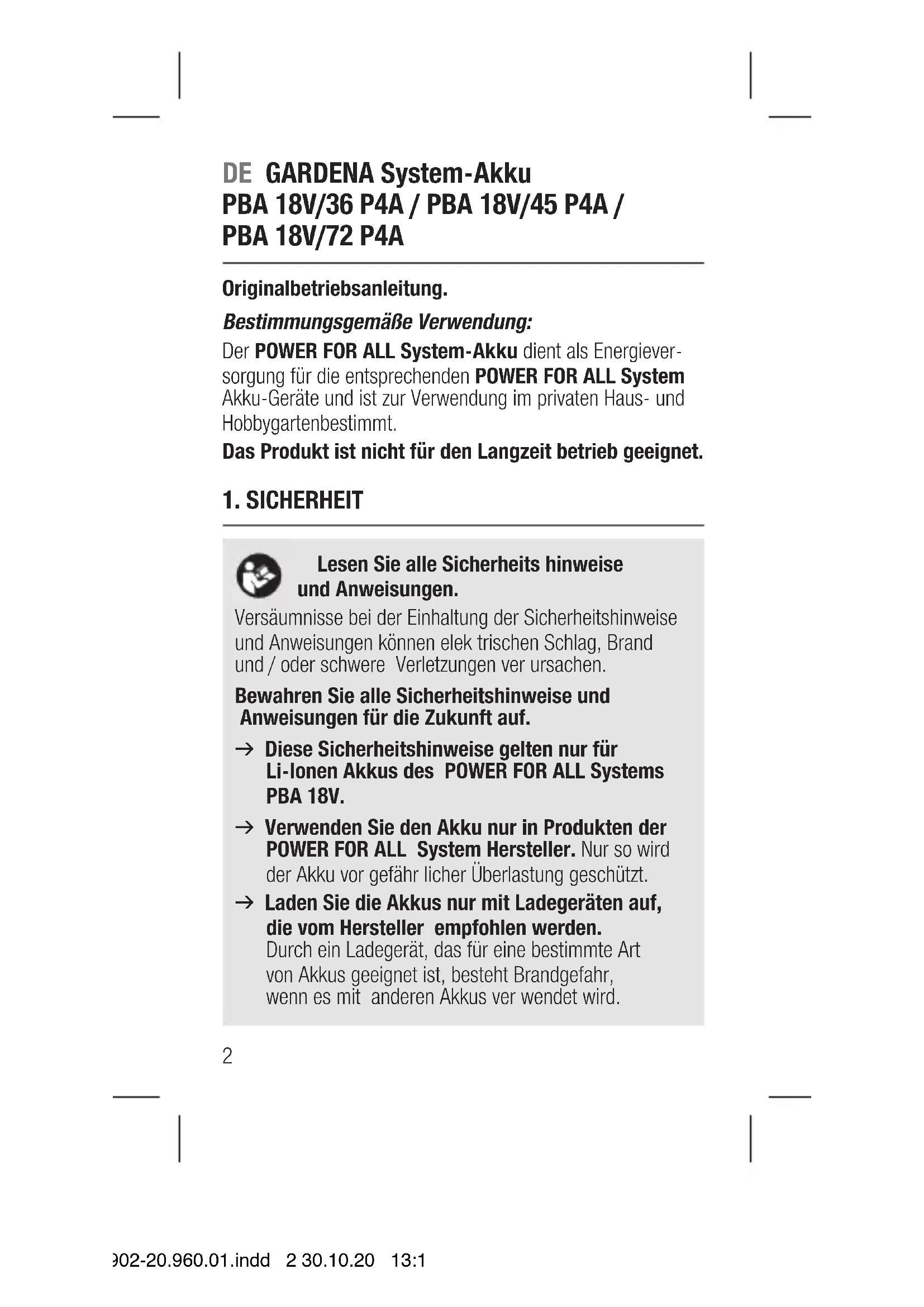 PBA 18V45 P4A - Batterie GARDENA - Kostenlose Bedienungsanleitung