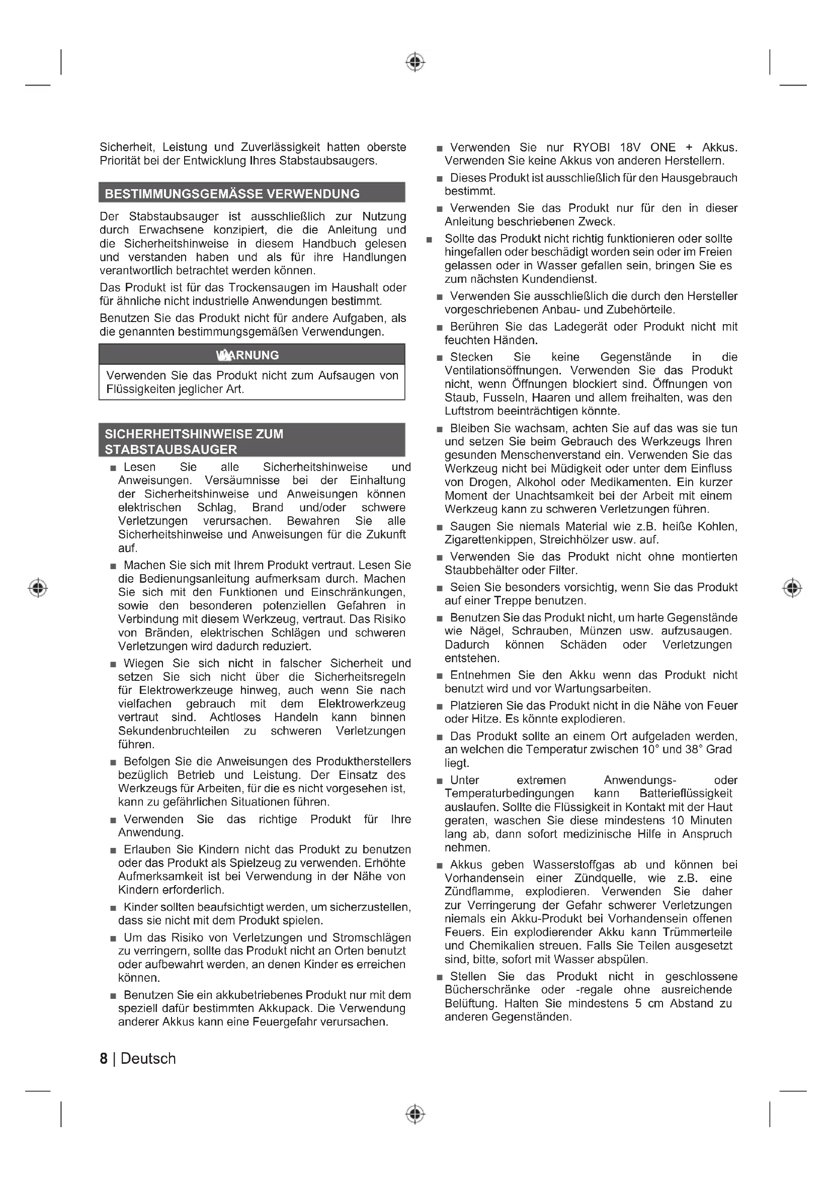Der Stabstaubsauger ist ausschließlich zur Nutzung durch Erwachsene konzipiert, die die Anleitung und die Sicherheitshinweise in diesem Handbuch gelesen und verstanden haben und als für ihre Handlungen verantwortlich betrachtet werden können. Das Produkt ist für das Trockensaugen im Haushalt oder für ähnliche nicht industrielle Anwendungen bestimmt. Benutzen Sie das Produkt nicht für andere Aufgaben, als die genannten bestimmungsgemäßen Verwendungen. WARNUNG Verwenden Sie das Produkt nicht zum Aufsaugen von Flüssigkeiten jeglicher Art. SICHERHEITSHINWEISE ZUM STABSTAUBSAUGER ■ Lesen Sie alle Sicherheitshinweise und Anweisungen. Versäumnisse bei der Einhaltung der Sicherheitshinweise und Anweisungen können elektrischen Schlag, Brand und/oder schwere Verletzungen verursachen. Bewahren Sie alle Sicherheitshinweise und Anweisungen für die Zukunft auf. ■ Machen Sie sich mit Ihrem Produkt vertraut. Lesen Sie die Bedienungsanleitung aufmerksam durch. Machen Sie sich mit den Funktionen und Einschränkungen, sowie den besonderen potenziellen Gefahren in Verbindung mit diesem Werkzeug, vertraut. Das Risiko von Bränden, elektrischen Schlägen und schweren Verletzungen wird dadurch reduziert. ■ Wiegen Sie sich nicht in falscher Sicherheit und setzen Sie sich nicht über die Sicherheitsregeln für Elektrowerkzeuge hinweg, auch wenn Sie nach vielfachen gebrauch mit dem Elektrowerkzeug vertraut sind. Achtloses Handeln kann binnen Sekundenbruchteilen zu schweren Verletzungen führen. ■ Befolgen Sie die Anweisungen des Produktherstellers bezüglich Betrieb und Leistung. Der Einsatz des Werkzeugs für Arbeiten, für die es nicht vorgesehen ist, kann zu gefährlichen Situationen führen. ■ Verwenden Sie das richtige Produkt für Ihre Anwendung. ■ Erlauben Sie Kindern nicht das Produkt zu benutzen oder das Produkt als Spielzeug zu verwenden. Erhöhte Aufmerksamkeit ist bei Verwendung in der Nähe von Kindern erforderlich. ■ Kinder sollten beaufsichtigt werden, um sicherzustellen, dass sie nicht mit dem Produkt spielen. ■ Um das Risiko von Verletzungen und Stromschlägen zu verringern, sollte das Produkt nicht an Orten benutzt oder aufbewahrt werden, an denen Kinder es erreichen können. ■ Benutzen Sie ein akkubetriebenes Produkt nur mit dem speziell dafür bestimmten Akkupack. Die Verwendung anderer Akkus kann eine Feuergefahr verursachen. ■ Verwenden Sie nur RYOBI 18V ONE + Akkus. Verwenden Sie keine Akkus von anderen Herstellern. ■ Dieses Produkt ist ausschließlich für den Hausgebrauch bestimmt. ■ Verwenden Sie das Produkt nur für den in dieser Anleitung beschriebenen Zweck. ■ Sollte das Produkt nicht richtig funktionieren oder sollte hingefallen oder beschädigt worden sein oder im Freien gelassen oder in Wasser gefallen sein, bringen Sie es zum nächsten Kundendienst. ■ Verwenden Sie ausschließlich die durch den Hersteller vorgeschriebenen Anbau- und Zubehörteile. ■ Berühren Sie das Ladegerät oder Produkt nicht mit feuchten Händen. ■ Stecken Sie keine Gegenstände in die Ventilationsöffnungen. Verwenden Sie das Produkt nicht, wenn Öffnungen blockiert sind. Öffnungen von Staub, Fusseln, Haaren und allem freihalten, was den Luftstrom beeinträchtigen könnte. ■ Bleiben Sie wachsam, achten Sie auf das was sie tun und setzen Sie beim Gebrauch des Werkzeugs Ihren gesunden Menschenverstand ein. Verwenden Sie das Werkzeug nicht bei Müdigkeit oder unter dem Einfluss von Drogen, Alkohol oder Medikamenten. Ein kurzer Moment der Unachtsamkeit bei der Arbeit mit einem Werkzeug kann zu schweren Verletzungen führen. ■ Saugen Sie niemals Material wie z.B. heiße Kohlen, Zigarettenkippen, Streichhölzer usw. auf. ■ Verwenden Sie das Produkt nicht ohne montierten Staubbehälter oder Filter. ■ Seien Sie besonders vorsichtig, wenn Sie das Produkt auf einer Treppe benutzen. ■ Benutzen Sie das Produkt nicht, um harte Gegenstände wie Nägel, Schrauben, Münzen usw. aufzusaugen. Dadurch können Schäden oder Verletzungen entstehen. ■ Entnehmen Sie den Akku wenn das Produkt nicht benutzt wird und vor Wartungsarbeiten. ■ Platzieren Sie das Produkt nicht in die Nähe von Feuer oder Hitze. Es könnte explodieren. ■ Das Produkt sollte an einem Ort aufgeladen werden, an welchen die Temperatur zwischen 10° und 38° Grad liegt. ■ Unter extremen Anwendungs- oder Temperaturbedingungen kann Batterieflüssigkeit auslaufen. Sollte die Flüssigkeit in Kontakt mit der Haut geraten, waschen Sie diese mindestens 10 Minuten lang ab, dann sofort medizinische Hilfe in Anspruch nehmen. ■ Akkus geben Wasserstoffgas ab und können bei Vorhandensein einer Zündquelle, wie z.B. eine Zündflamme, explodieren. Verwenden Sie daher zur Verringerung der Gefahr schwerer Verletzungen niemals ein Akku-Produkt bei Vorhandensein offenen Feuers. Ein explodierender Akku kann Trümmerteile und Chemikalien streuen. Falls Sie Teilen ausgesetzt sind, bitte, sofort mit Wasser abspülen. ■ Stellen Sie das Produkt nicht in geschlossene Bücherschränke oder -regale ohne ausreichende Belüftung. Halten Sie mindestens 5 cm Abstand zu anderen Gegenständen.9 Deutsch |