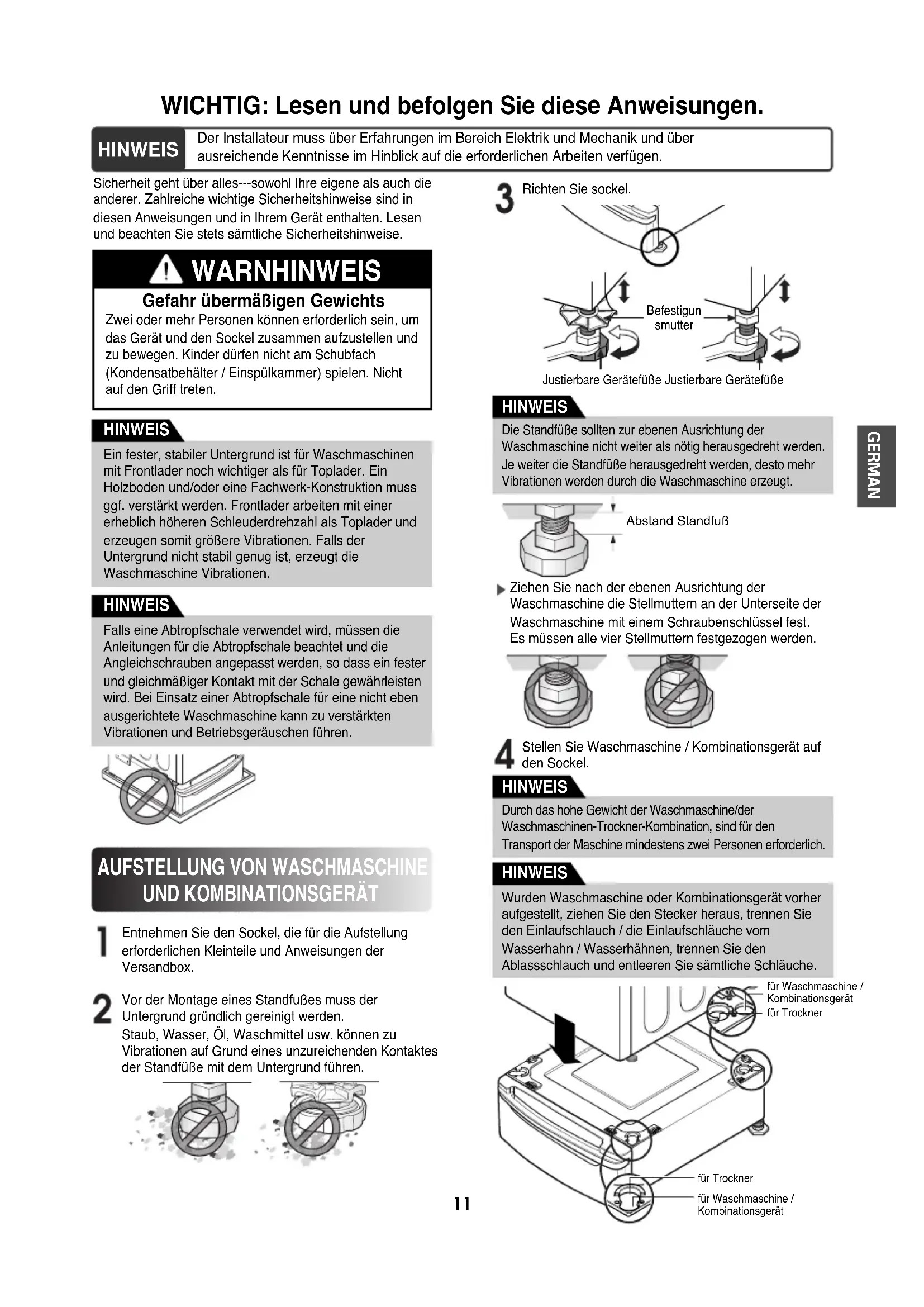 Vor der Montage eines Standfußes muss derUntergrund gründlich gereinigt werden. Staub, Wasser, Öl, Waschmittel usw. können zuVibrationen auf Grund eines unzureichenden Kontaktesder Standfüße mit dem Untergrund führen.Ziehen Sie nach der ebenen Ausrichtung derWaschmaschine die Stellmuttern an der Unterseite derWaschmaschine mit einem Schraubenschlüssel fest. Es müssen alle vier Stellmuttern festgezogen werden.Richten Sie sockel.HINWEISFalls eine Abtropfschale verwendet wird, müssen dieAnleitungen für die Abtropfschale beachtet und dieAngleichschrauben angepasst werden, so dass ein festerund gleichmäßiger Kontakt mit der Schale gewährleistenwird. Bei Einsatz einer Abtropfschale für eine nicht ebenausgerichtete Waschmaschine kann zu verstärktenVibrationen und Betriebsgeräuschen führen.HINWEISDie Standfüße sollten zur ebenen Ausrichtung derWaschmaschine nicht weiter als nötig herausgedreht werden.Je weiter die Standfüße herausgedreht werden, desto mehrVibrationen werden durch die Waschmaschine erzeugt.HINWEISDurch das hohe Gewicht der Waschmaschine/derWaschmaschinen-Trockner-Kombination, sind für denTransport der Maschine mindestens zwei Personen erforderlich.HINWEISWurden Waschmaschine oder Kombinationsgerät vorheraufgestellt, ziehen Sie den Stecker heraus, trennen Sieden Einlaufschlauch / die Einlaufschläuche vomWasserhahn / Wasserhähnen, trennen Sie denAblassschlauch und entleeren Sie sämtliche Schläuche.HINWEISEin fester, stabiler Untergrund ist für Waschmaschinenmit Frontlader noch wichtiger als für Toplader. EinHolzboden und/oder eine Fachwerk-Konstruktion mussggf. verstärkt werden. Frontlader arbeiten mit einererheblich höheren Schleuderdrehzahl als Toplader underzeugen somit größere Vibrationen. Falls derUntergrund nicht stabil genug ist, erzeugt dieWaschmaschine Vibrationen.GERMAN12 Stellen Sie sicher, dass die Öffnungen am Standfuß mit den Öffnungen im Gerät abschließen und montieren Sie vier Schrauben an jeder Ecke, um das Gerät ausreichend am Standfuß zu befestigen. Richten Sie Waschmaschine / Kombinationsgerät auf dem Sockel durch Einregulierung der Füße aus. Stellen Sie Waschmaschine / Kombinationsgerät am gewünschten Platrz auf. Diagonalprüfung Beim Herunterdrücken der diagonal gegenüberliegenden Ecken der Waschmaschine sollte sich die Maschine nicht nach oben bzw. nach unten neigen können. (Bitte in beide Richtungen prüfen.) Falls die Maschine beim diagonalen Herunterdrücken der oberen Abdeckung wackelt, justieren Sie die Füße erneut. HINWEIS Um die ebene Ausrichtung der Waschmaschine nochmals zu überprüfen, starten Sie die Waschmaschine mit einer Testladung: geben Sie etwa drei Kilo Wäsche in die Maschine. Drücken Sie den NETZSCHALTER sowie die Tasten RINSE+SPIN, gefolgt von der Taste START/PAUSE. Weitere Hinweise zur Auswahl der Waschgänge zum Betrieb finden Sie in den folgenden Abschnitten Stellen Sie sicher, dass die Waschmaschine während des Schleudergangs nicht übermäßig wackelt oder vibriert. Sollte die Waschmaschine vibrieren oder wackeln, justieren Sie die Einstellfüße unter der Waschmaschine und wiederholen Sie den Test. HINWEIS Falls die Schrauben nicht fest installiert sind, können Lärm und Vibrationen verursacht werden. HINWEIS Gerät und Sockel müssen auf einem festen und bündigen Untergrund stehen, der für den Einsatz geeignet ist. Regulieren Sie die Füße des Geräts und Sockels mit Schraubenschlüssel. Danach justieren Sie die Sicherungsmutter in Richtung Sockel, während Sie den Sockelfuß unter Einsatz eines Schraubenschlüssels halten. HINWEIS Befestigun smutter Justierbare Gerätefüße Justierbare Gerätefüße Befestigun smutter Justierbare Gerätefüße Justierbare Gerätefüße GERMAN13 Aufgrund des Gewichts von Trockner können zwei oder mehr Personen erforderlich sein. HINWEIS Entnehmen Sie den Sockel, die für die Aufstellung erforderlichen Kleinteile und Anweisungen der Versandbox. Stellen Sie sicher, dass die Öffnungen am Standfuß mit den Öffnungen im Gerät abschließen und montieren Sie zwei Schrauben an jeder Ecke, um das Gerät ausreichend am Standfuß zu befestigen.