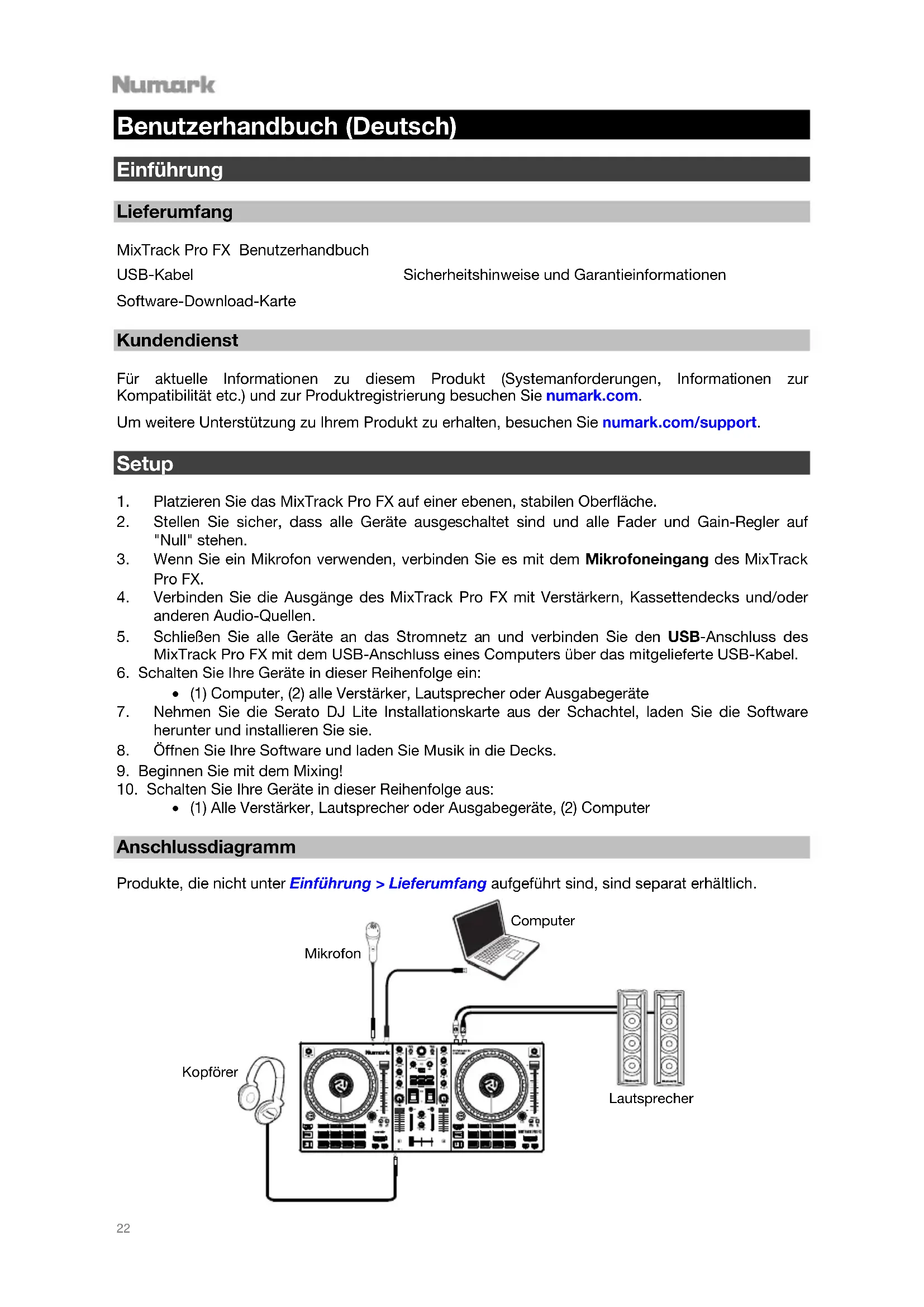 Benutzerhandbuch (Deutsch) Einführung Lieferumfang MixTrack Pro FX Benutzerhandbuch USB-Kabel Sicherheitshinweise und Garantieinformationen Software-Download-Karte Kundendienst Für aktuelle Informationen zu diesem Produkt (Systemanforderungen, Informationen zur Kompatibilität etc.) und zur Produktregistrierung besuchen Sie numark.com. Um weitere Unterstützung zu Ihrem Produkt zu erhalten, besuchen Sie numark.com/support. Setup