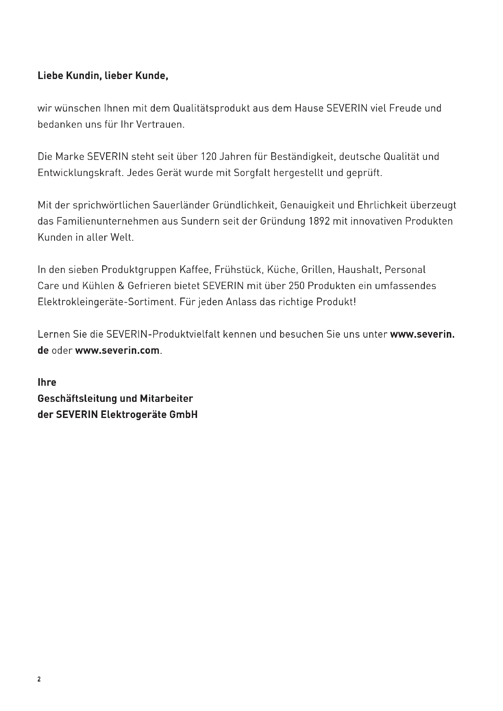 DE Gebrauchsanweisung GB Instructions for use FR Mode d’emploi NL Gebruiksaanwijzing ES Instrucciones de uso IT Manuale d’uso DK Brugsanvisning SE Bruksanvisning FI Käyttöohje PT Manual de instruções PL Instrukcja obsługi GR Oδηγίες χρήσεως Mikrowelle 3 Microwave oven 18 Four à micro-ondes 32 Microwave oven 47 Microondas 62 Forno a microonde 77 Mikrobølgeovn 92 Mikrovågsugn 106 Mikroaaltouuni 121 Micro-ondas 135 Kuchenka mikrofalowa 150 Φούρνος μικροκυμάτων 1662 Liebe Kundin, lieber Kunde, wir wünschen Ihnen mit dem Qualitätsprodukt aus dem Hause SEVERIN viel Freude und bedanken uns für Ihr Vertrauen. Die Marke SEVERIN steht seit über 120 Jahren für Beständigkeit, deutsche Qualität und Entwicklungskraft. Jedes Gerät wurde mit Sorgfalt hergestellt und geprüft. Mit der sprichwörtlichen Sauerländer Gründlichkeit, Genauigkeit und Ehrlichkeit überzeugt das Familienunternehmen aus Sundern seit der Gründung 1892 mit innovativen Produkten Kunden in aller Welt. In den sieben Produktgruppen Kaffee, Frühstück, Küche, Grillen, Haushalt, Personal Care und Kühlen & Gefrieren bietet SEVERIN mit über 250 Produkten ein umfassendes Elektrokleingeräte-Sortiment. Für jeden Anlass das richtige Produkt! Lernen Sie die SEVERIN-Produktvielfalt kennen und besuchen Sie uns unter www.severin. de oder www.severin.com. Ihre Geschäftsleitung und Mitarbeiter der SEVERIN Elektrogeräte GmbH3 Mikrowelle Liebe Kundin, lieber Kunde, die Gebrauchsanweisung sorgfältig vor der Benutzung des Mikrowellengerätes durchlesen und für den weiteren Gebrauch auf. Das Gerät darf nur von Personen benutzt werden, die mit den Sicherheitsanweisungen vertraut sind. Aufbau Gerät
