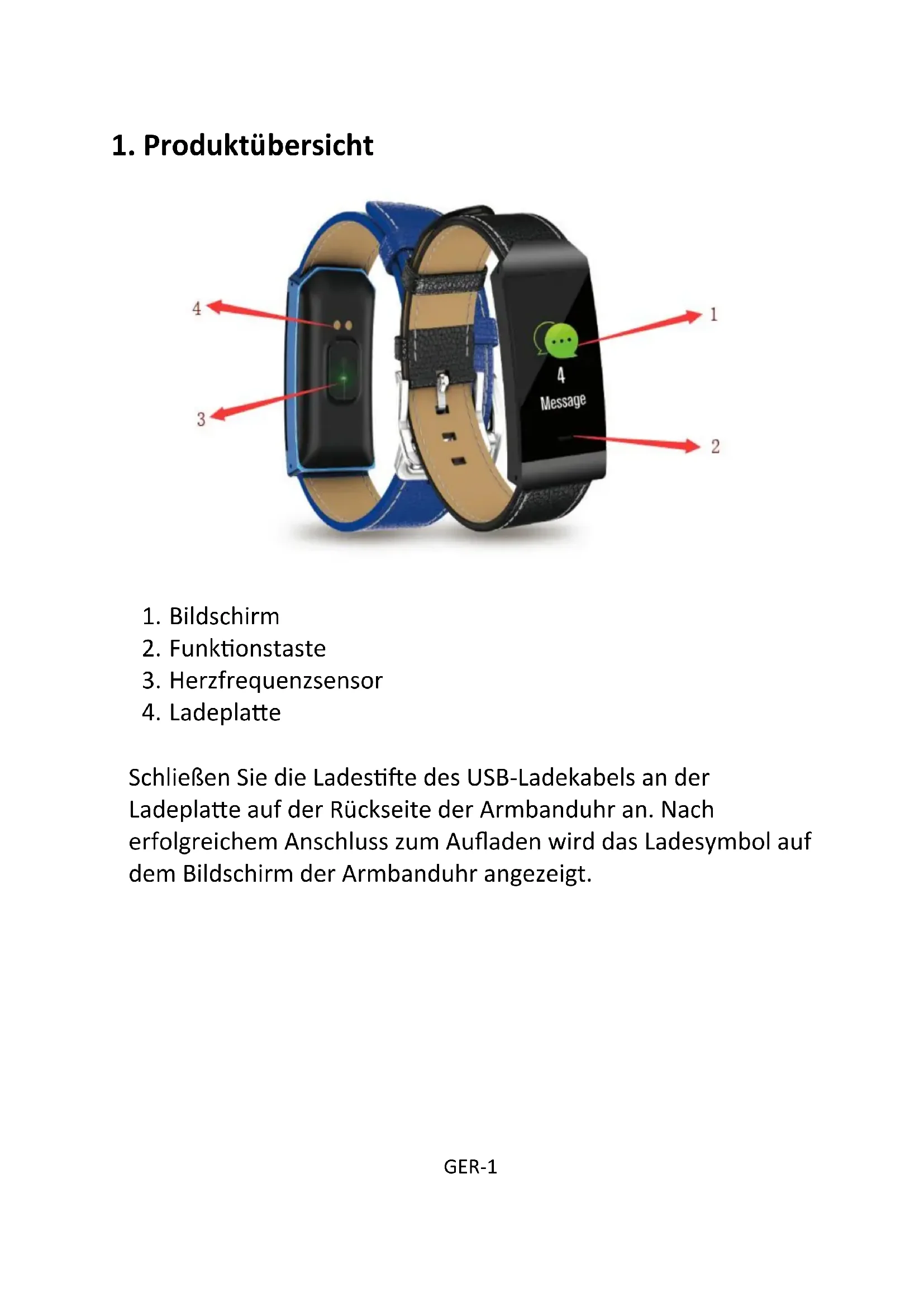 Schließen Sie die Ladestifte des USB-Ladekabels an der Ladeplatte auf der Rückseite der Armbanduhr an. Nach erfolgreichem Anschluss zum Aufladen wird das Ladesymbol auf dem Bildschirm der Armbanduhr angezeigt.GER-2