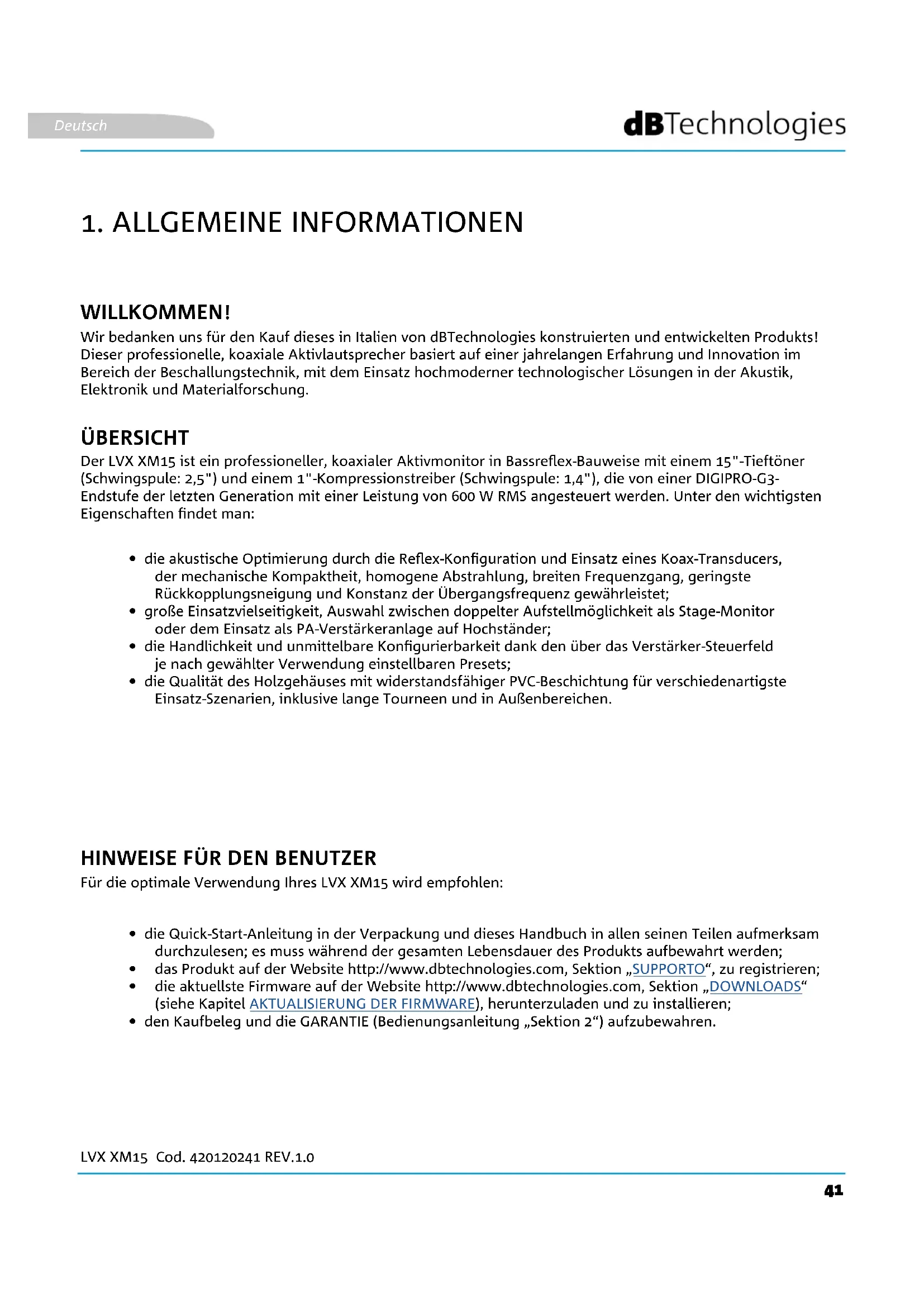Strom und Leistung, insg. zulässig in einem verlinkten System: 14 A - 3200 W max (230 V) / 11 A - 1200 W max (115 V)56 LVX XM15 Cod. 420120241 REV. 1.0 Breite: Tiefe: Höhe: Gewicht: 640 mm 370 mm 460 mm 22,3 kg Handgriffe: Hochständermontage: Ja, 36 mm Integriert ABMESSUNGEN Material: Sperrholz mit PVC-Beschichtung Gitter: Flugfähigkeit: Lackiert / NC-Bearbeitung Nein Deutsch57 LVX XM15 Cod. 420120241 REV.1.0 Mögliche Änderungen der Merkmale, Spezikationen und Optik der Produkte ohne Vorbescheid vorbehalten. Weiterhin behält dBTechnologies sich das Recht vor, Änderungen oder Verbesserungen des Design und der Verarbeitung ohne Änderungs- oder Verbesserungspicht bereits bestehender Produkte vorzunehmen. Deutsch A.E.B. Industriale Srl Via Brodolini, 8 Località Crespellano 40053 VALSAMOGGIA BOLOGNA (ITALIEN) Tel +39 051 969870 Fax +39 051 969725 www.dbtechnologies.com info@dbtechnologies-aeb.com58 LVX XM15 Cod. 420120241 REV.1.0
