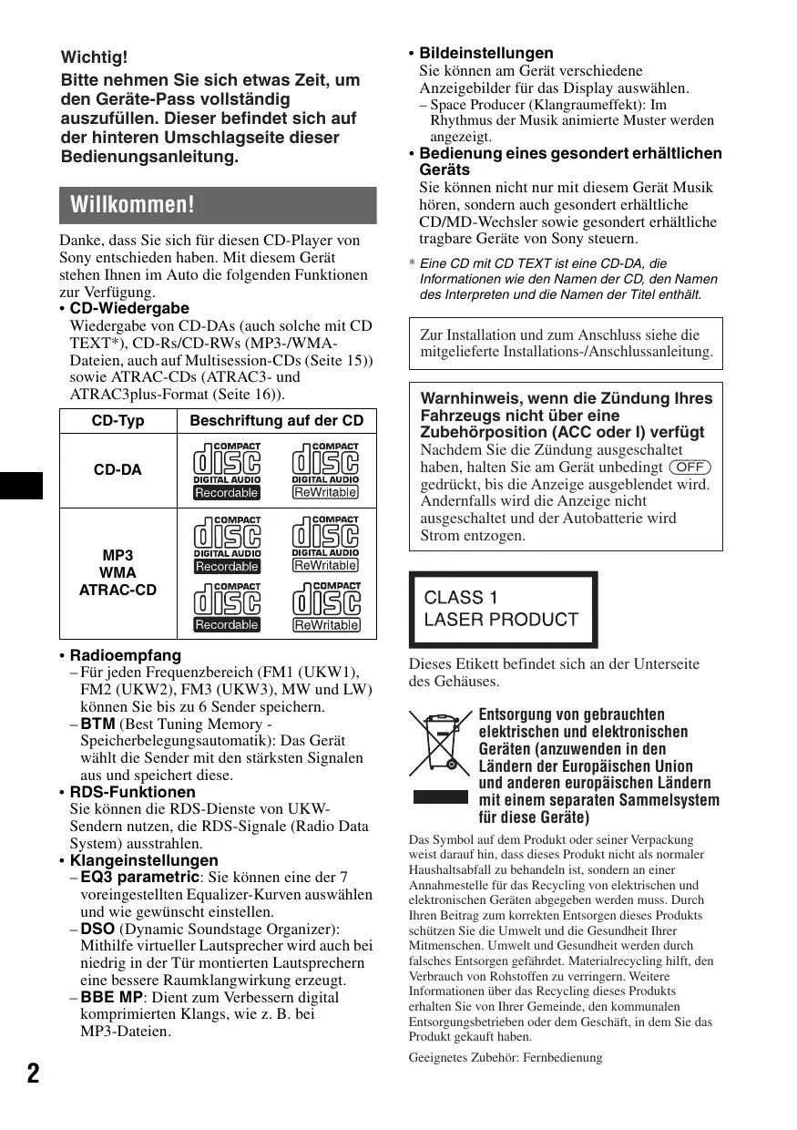 Wichtig! Bitte nehmen Sie sich etwas Zeit, um den Geräte-Pass vollständig auszufüllen. Dieser befindet sich auf der hinteren Umschlagseite dieser Bedienungsanleitung. Willkommen! Danke, dass Sie sich für diesen CD-Player von Sony entschieden haben. Mit diesem Gerät stehen Ihnen im Auto die folgenden Funktionen zur Verfügung.