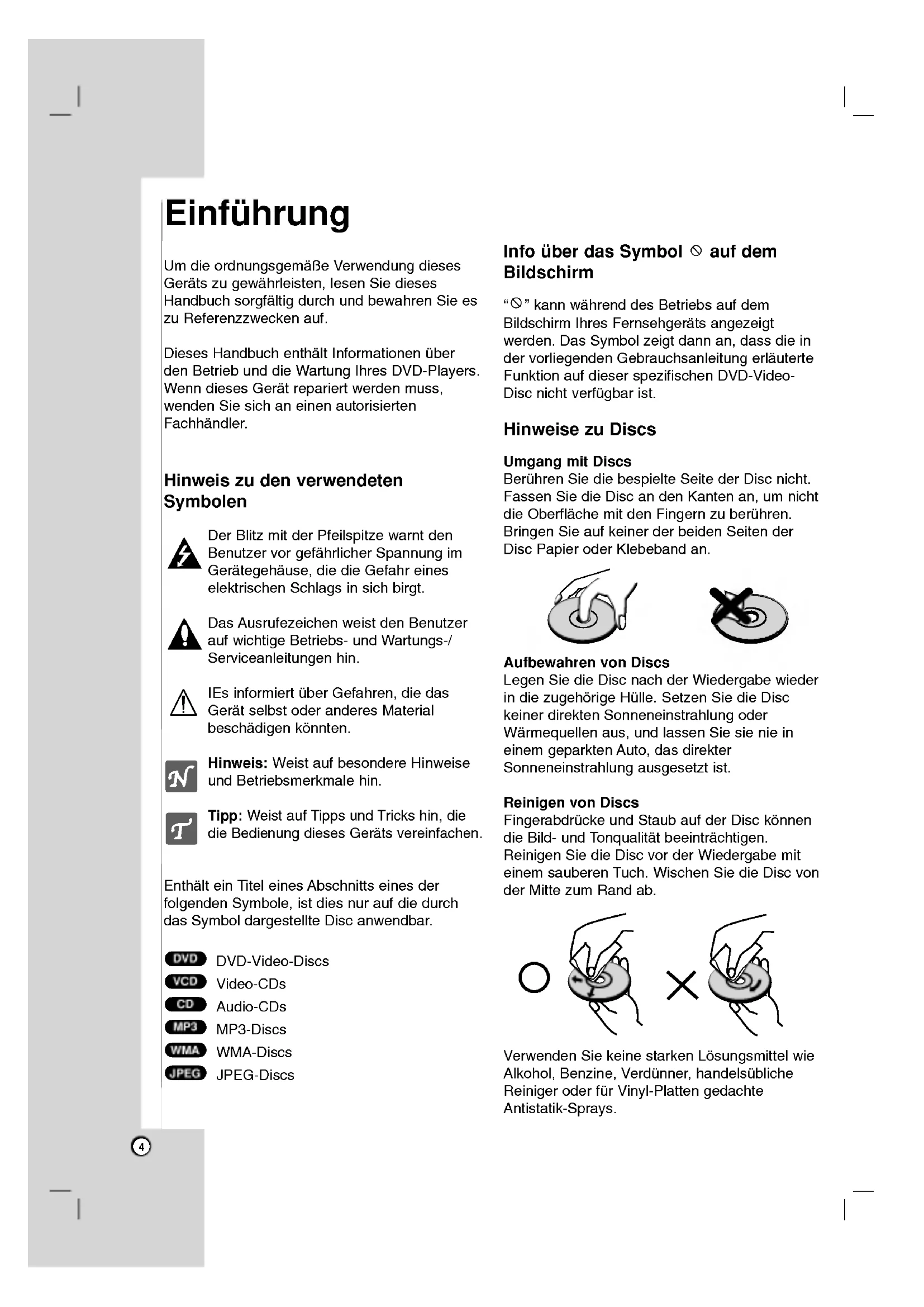Sprachencodes........................26 Landercodes.........................27 TechnischeDaten......................284Umdie ordnungsgemaße Verwendung diesesGeratszu gewahrleisten, lesen SiediesesHandbuch sorgfaltig durchundbewahrenSieeszuReferenzzweckenauf.DiesesHandbuchenthaltInformationenuberdenBetriebunddie Wartung Ihres DVD-Players. WenndiesesGerat repariert werdenmuss,wendenSiesichaneinenautorisiertenFachhandler. Hinweis den verwendeten Symbolen DerBlitzmitder Pfeilspitze warntdenBenutzervor gefahrlicher Spannung Gerategehause, diedieGefahreineselektrischen Schlags insich birgt. DasAusrufezeichenweistdenBenutzerauf wichtige Betriebs-und Wartungs-/ Serviceanleitungen hin.IEsinformiertuber Gefahren, diedasGeratselbstoderanderesMaterial beschadigen konnten.Hinweis:WeistaufbesondereHinweiseundBetriebsmerkmalehin. Tipp: Weistauf Tipps undTricks hin, diedie Bedienung diesesGeratsvereinfachen.EnthalteinTiteleinesAbschnittseinesder folgenden Symbole, istdiesnuraufdiedurchdas Symbol dargestellte Discanwendbar.DVD-Video-DiscsVideo-CDsAudio-CDsMP3-DiscsWMA-DiscsJPEG-Discs Info uber das Symbol auf dem Bildschirm