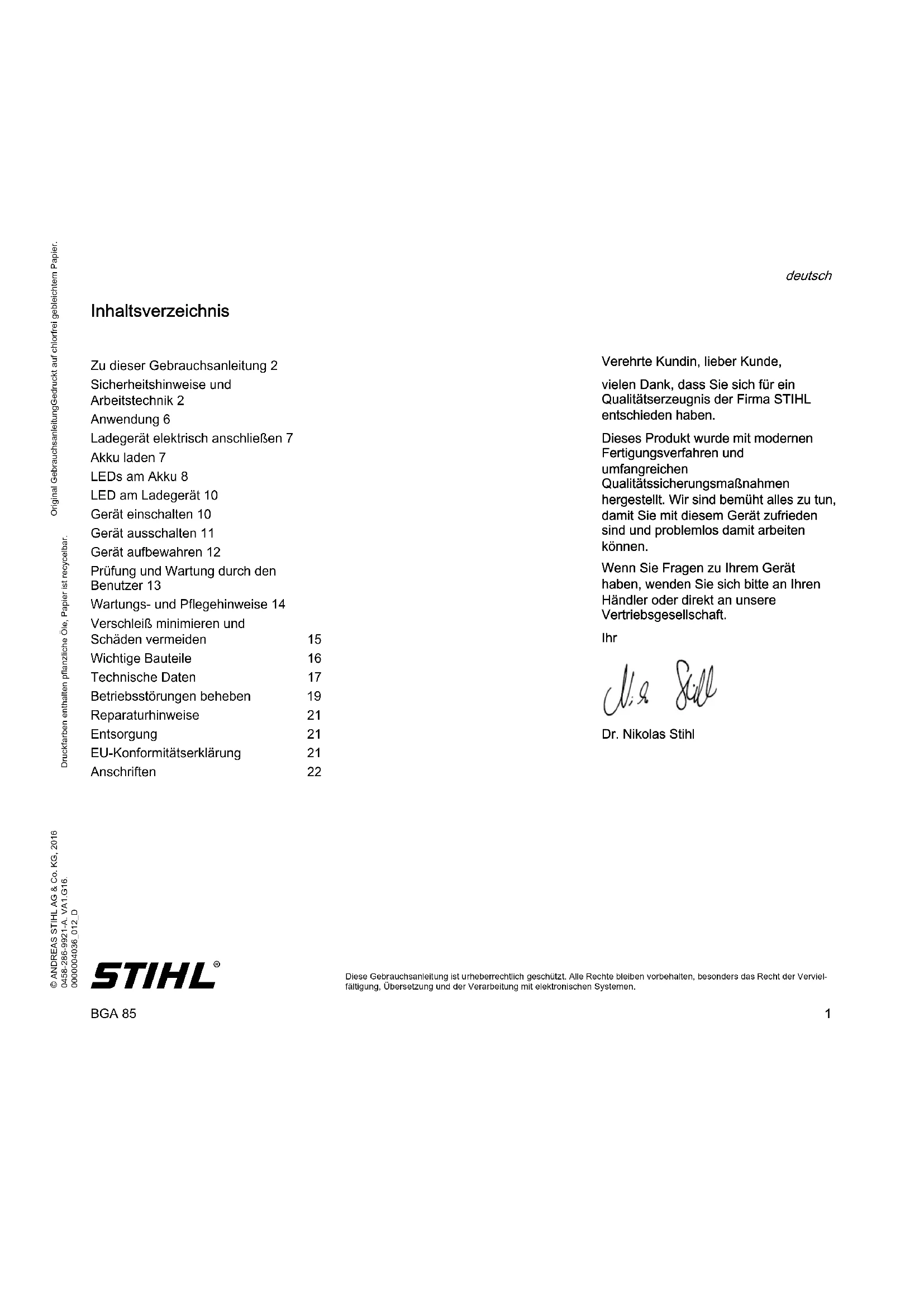 Diese Gebrauchsanleitung ist urheberrechtlich geschützt. Alle Rechte bleiben vorbehalten, besonders das Recht der Verviel- fältigung, Übersetzung und der Verarbeitung mit elektronischen Systemen. Inhaltsverzeichnis Verehrte Kundin, lieber Kunde, vielen Dank, dass Sie sich für ein Qualitätserzeugnis der Firma STIHL entschieden haben. Dieses Produkt wurde mit modernen Fertigungsverfahren und umfangreichen Qualitätssicherungsmaßnahmen hergestellt. Wir sind bemüht alles zu tun, damit Sie mit diesem Gerät zufrieden sind und problemlos damit arbeiten können. Wenn Sie Fragen zu Ihrem Gerät haben, wenden Sie sich bitte an Ihren Händler oder direkt an unsere Vertriebsgesellschaft. Ihr Dr. Nikolas Stihl Zu dieser Gebrauchsanleitung 2 Sicherheitshinweise und Arbeitstechnik 2 Anwendung 6 Ladegerät elektrisch anschließen 7 Akku laden 7 LEDs am Akku 8 LED am Ladegerät 10 Gerät einschalten 10 Gerät ausschalten 11 Gerät aufbewahren 12 Prüfung und Wartung durch den Benutzer 13 Wartungs- und Pflegehinweise 14 Verschleiß minimieren und Schäden vermeiden 15 Wichtige Bauteile 16 Technische Daten 17 Betriebsstörungen beheben 19 Reparaturhinweise 21 Entsorgung 21 EU-Konformitätserklärung 21 Anschriften 22BGA 85 deutsch