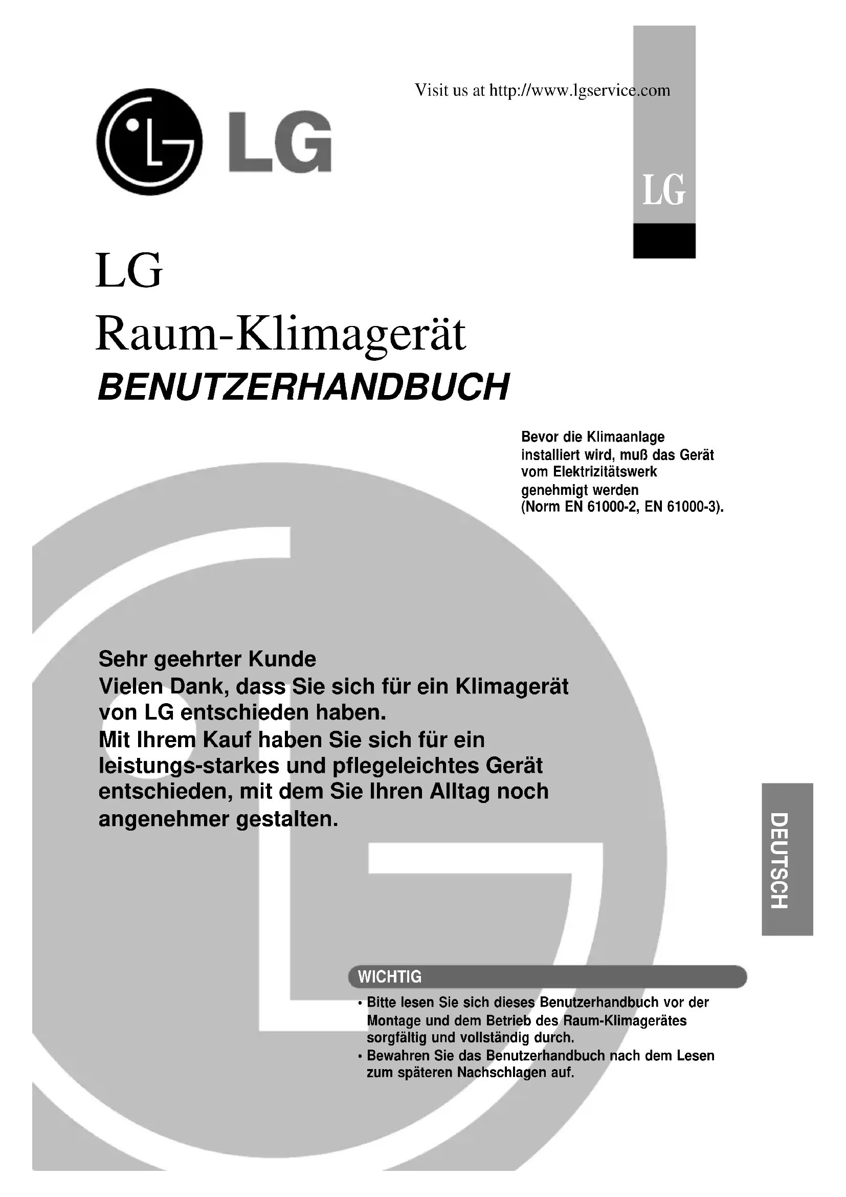 Visit us at http://www.lgservice.com WICHTIG• Bitte lesen Sie sich dieses Benutzerhandbuch vor der Montage und dem Betrieb des Raum-Klimagerätes sorgfältig und vollständig durch.• Bewahren Sie das Benutzerhandbuch nach dem Lesen zum späteren Nachschlagen auf.Bevor die Klimaanlage installiert wird, muß das Gerät vom Elektrizitätswerk genehmigt werden (Norm EN 61000-2, EN 61000-3). Sehr geehrter Kunde Vielen Dank, dass Sie sich für ein Klimagerät von LG entschieden haben. Mit Ihrem Kauf haben Sie sich für ein leistungs-starkes und pflegeleichtes Gerät entschieden, mit dem Sie Ihren Alltag noch angenehmer gestalten.2 Raum-Klimagerät Raum-Klimagerät - Benutzerhandbuch INHALTSVERZEICHNIS