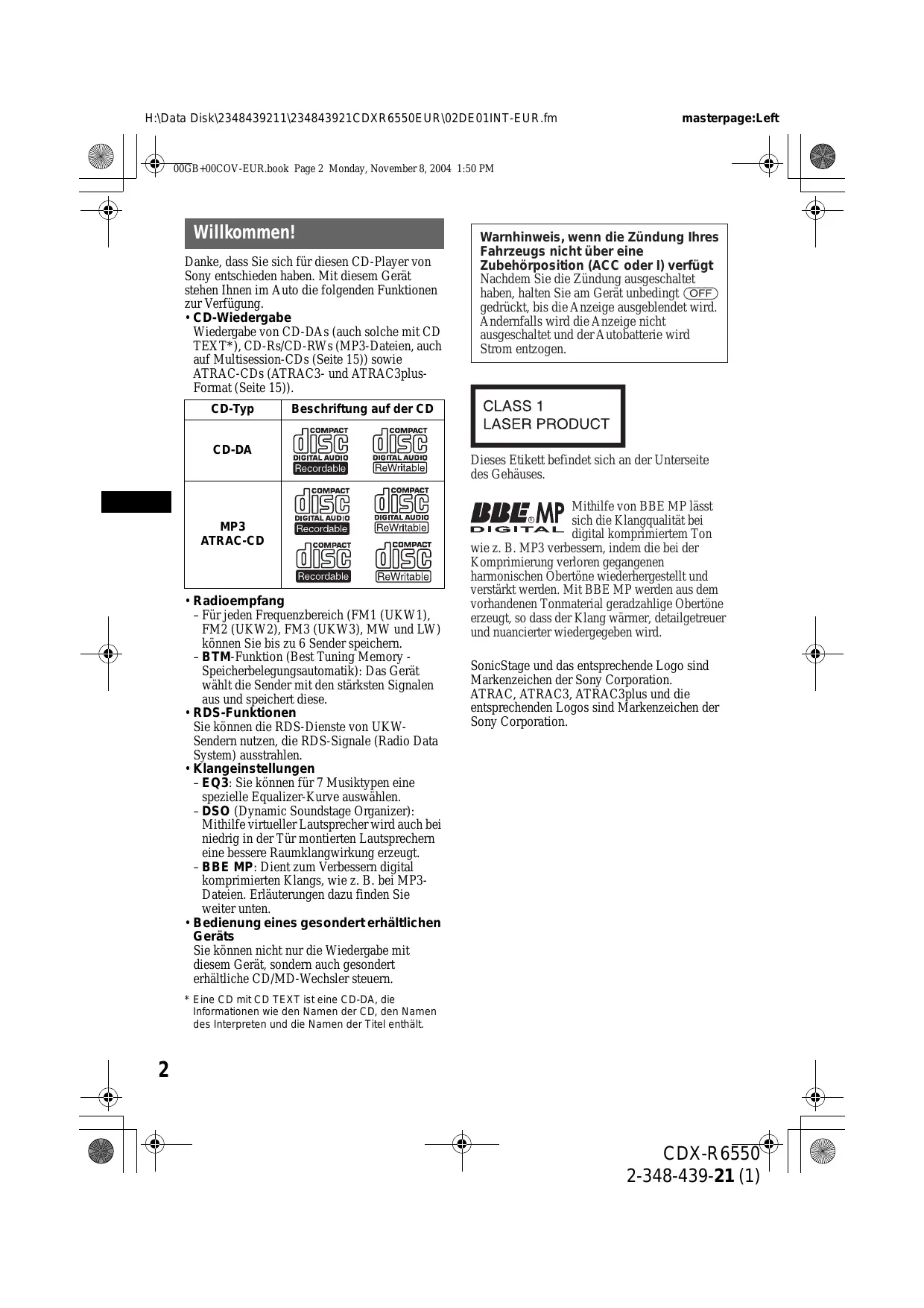 CDX-R6550 2-348-439-21 (1) H:\Data Disk\2348439211\234843921CDXR6550EUR\02DE01INT-EUR.fm masterpage:Left 00GB+00COV-EUR.book Page 2 Monday, November 8, 2004 1:50 PM Willkommen! Danke, dass Sie sich für diesen CD-Player von Sony entschieden haben. Mit diesem Gerät stehen Ihnen im Auto die folgenden Funktionen zur Verfügung.