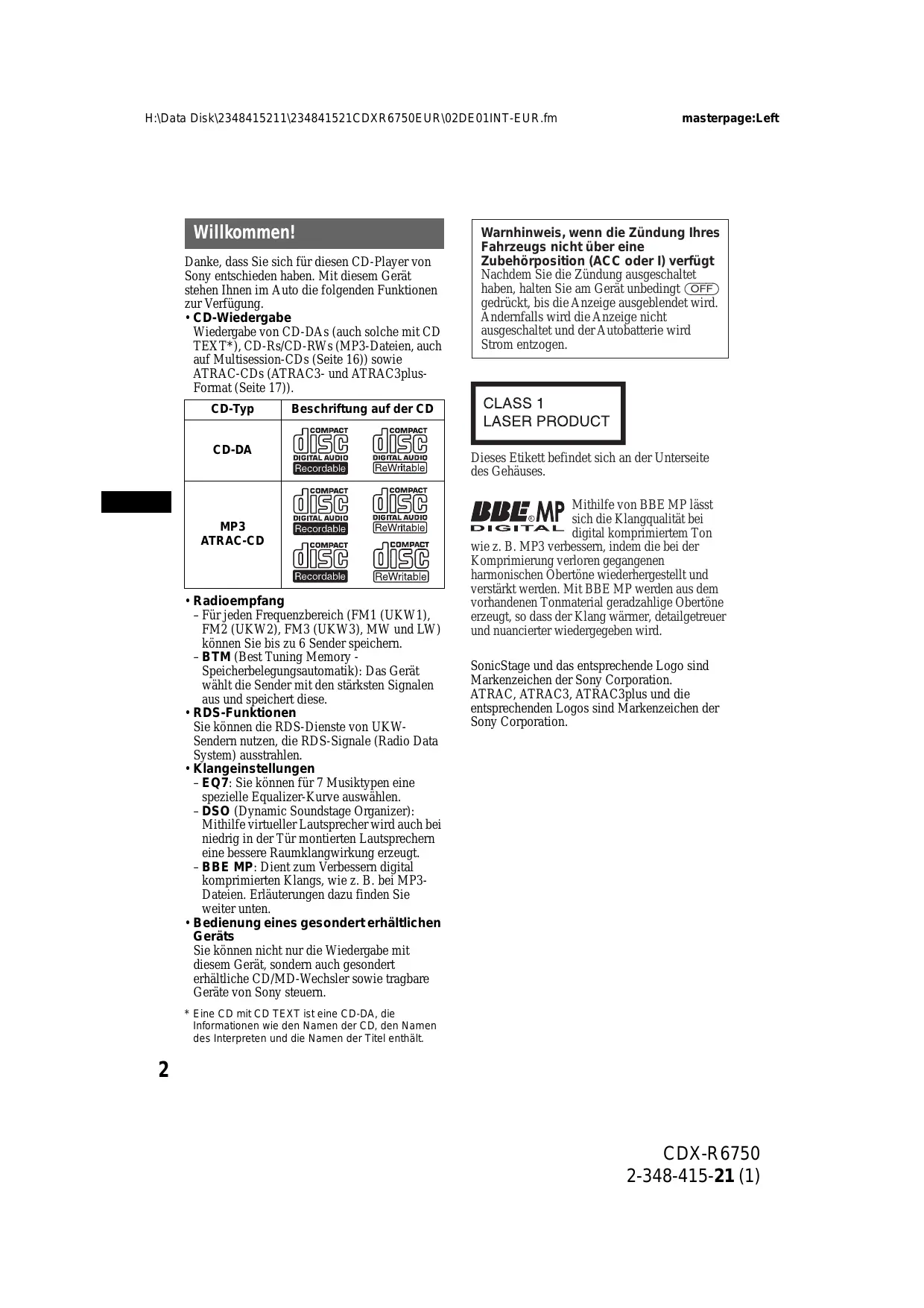 - CD-Wiedergabe Wiedergabe von CD-DAs (auch solche mit CD TEXT*), CD-Rs/CD-RWs (MP3-Dateien, auch auf Multisession-CDs (Seite 16)) sowie ATRAC-CDs (ATRAC3- und ATRAC3plusFormat (Seite 17)). CD-Typ masterpage:Left Warnhinweis, wenn die Zündung Ihres Fahrzeugs nicht über eine Zubehörposition (ACC oder I) verfügt Nachdem Sie die Zündung ausgeschaltet haben, halten Sie am Gerät unbedingt (OFF) gedrückt, bis die Anzeige ausgeblendet wird. Andernfalls wird die Anzeige nicht ausgeschaltet und der Autobatterie wird Strom entzogen. Beschriftung auf der CD CD-DA Dieses Etikett befindet sich an der Unterseite des Gehäuses. Mithilfe von BBE MP lässt sich die Klangqualität bei digital komprimiertem Ton wie z. B. MP3 verbessern, indem die bei der Komprimierung verloren gegangenen harmonischen Obertöne wiederhergestellt und verstärkt werden. Mit BBE MP werden aus dem vorhandenen Tonmaterial geradzahlige Obertöne erzeugt, so dass der Klang wärmer, detailgetreuer und nuancierter wiedergegeben wird.