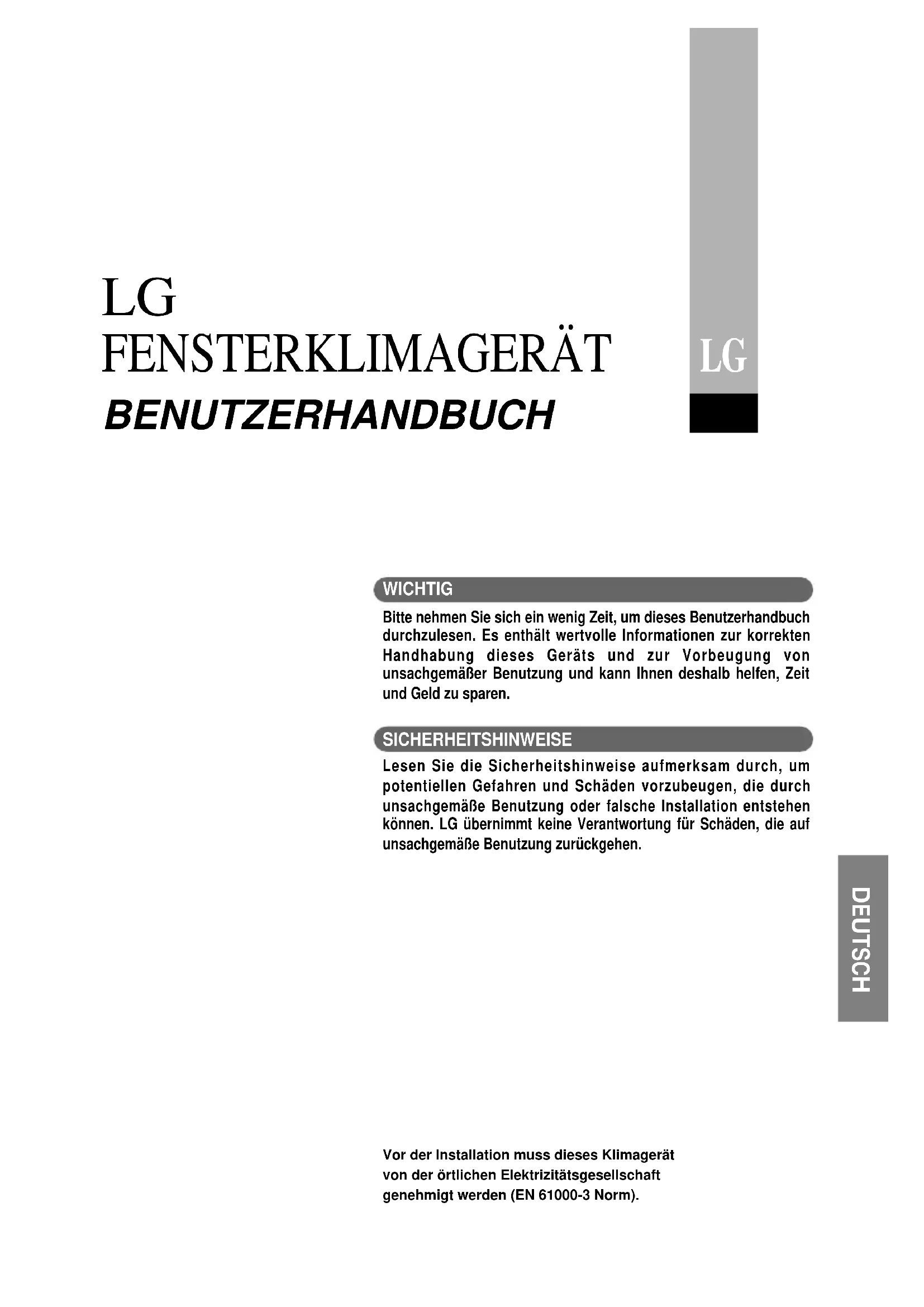 WICHTIG Bitte nehmen Sie sich ein wenig Zeit, um dieses Benutzerhandbuchdurchzulesen. Es enthält wertvolle Informationen zur korrektenHandhabung dieses Geräts und zur Vorbeugung vonunsachgemäßer Benutzung und kann Ihnen deshalb helfen, Zeitund Geld zu sparen. SICHERHEITSHINWEISE Lesen Sie die Sicherheitshinweise aufmerksam durch, umpotentiellen Gefahren und Schäden vorzubeugen, die durchunsachgemäße Benutzung oder falsche Installation entstehenkönnen. LG übernimmt keine Verantwortung für Schäden, die aufunsachgemäße Benutzung zurückgehen.Vor der Installation muss dieses Klimagerätvon der örtlichen Elektrizitätsgesellschaftgenehmigt werden (EN 61000-3 Norm).Zur Erinnerung L esen Sie dieses Handbuch Vorsicht