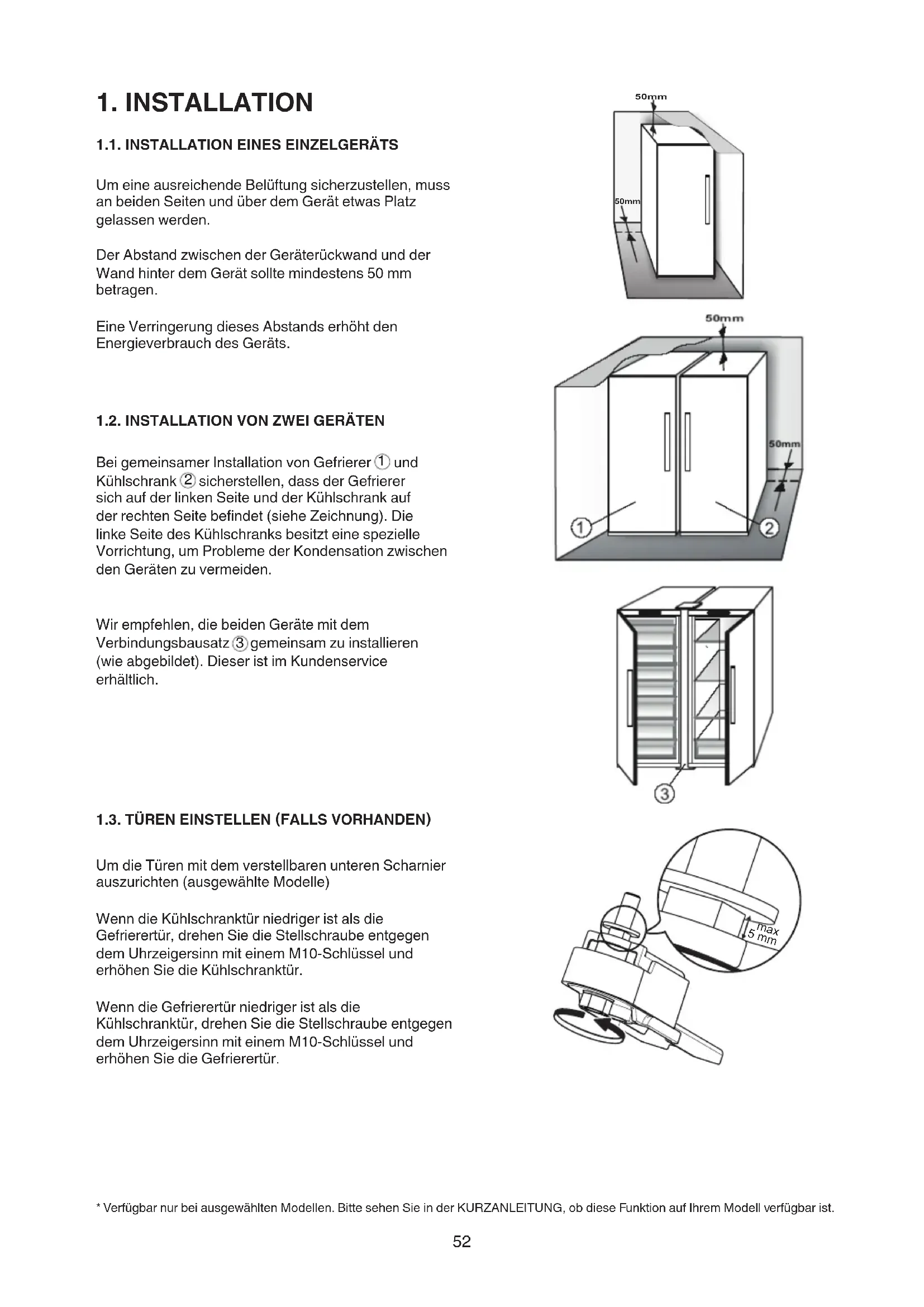 gemeinsam zu installieren (wieabgebildet).DieseristimKundenservice erhältlich. 1.3. TÜREN EINSTELLEN (FALLS VORHANDEN) UmdieTürenmitdemverstellbarenunterenScharnier auszurichten(ausgewählteModelle) WenndieKühlschranktürniedrigeristalsdie Gefrierertür,drehenSiedieStellschraubeentgegen demUhrzeigersinnmiteinemM10-Schlüsselund erhöhenSiedieKühlschranktür. WenndieGefrierertürniedrigeristalsdie Kühlschranktür,drehenSiedieStellschraubeentgegen demUhrzeigersinnmiteinemM10-Schlüsselund erhöhenSiedieGefrierertür. *VerfügbarnurbeiausgewähltenModellen.BittesehenSieinderKURZANLEITUNG,obdieseFunktionaufIhremModellverfügbarist. 50mm 50mm 5 mm max53
