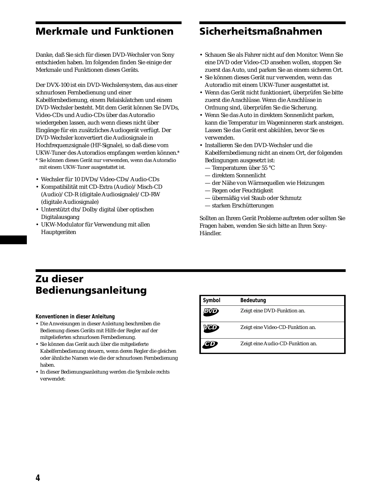 Merkmale und Funktionen Sicherheitsmaßnahmen Danke, daß Sie sich für diesen DVD-Wechsler von Sony entschieden haben. Im folgenden finden Sie einige der Merkmale und Funktionen dieses Geräts.