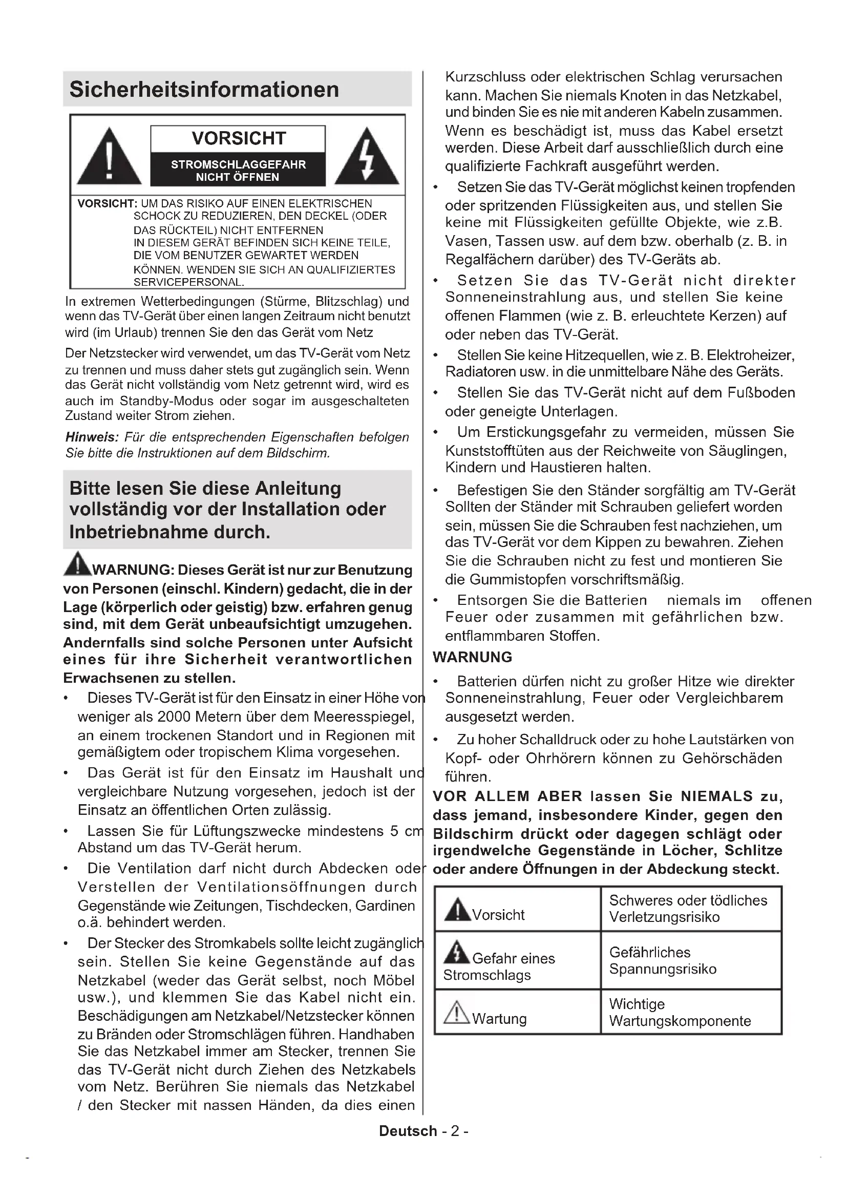 - Informationen zur Entsorgung Deutsch - 2 - Sicherheitsinformationen VORSICHT STROMSCHLAGGEFAHRNICHT ÖFFNENVORSICHT: UM DAS RISIKO AUF EINEN ELEKTRISCHEN SCHOCK ZU REDUZIEREN, DEN DECKEL (ODER DAS RÜCKTEIL) NICHT ENTFERNEN IN DIESEM GERÄT BEFINDEN SICH KEINE TEILE, DIE VOM BENUTZER GEWARTET WERDEN KÖNNEN. WENDEN SIE SICH AN QUALIFIZIERTES SERVICEPERSONAL.Hinweis: Für die entsprechenden Eigenschaften befolgen Sie bitte die Instruktionen auf dem Bildschirm.In extremen Wetterbedingungen (Stürme, Blitzschlag) und wenn das TV-Gerät über einen langen Zeitraum nicht benutzt wird (im Urlaub) trennen Sie den das Gerät vom NetzDer Netzstecker wird verwendet, um das TV-Gerät vom Netz zu trennen und muss daher stets gut zugänglich sein. Wenn das Gerät nicht vollständig vom Netz getrennt wird, wird es auch im Standby-Modus oder sogar im ausgeschalteten Zustand weiter Strom ziehen. Bitte lesen Sie diese Anleitung vollständig vor der Installation oder Inbetriebnahme durch. WARNUNG: Dieses Gerät ist nur zur Benutzung von Personen (einschl. Kindern) gedacht, die in der Lage (körperlich oder geistig) bzw. erfahren genug sind, mit dem Gerät unbeaufsichtigt umzugehen. Andernfalls sind solche Personen unter Aufsicht eines für ihre Sicherheit verantwortlichen Erwachsenen zu stellen. p. 44