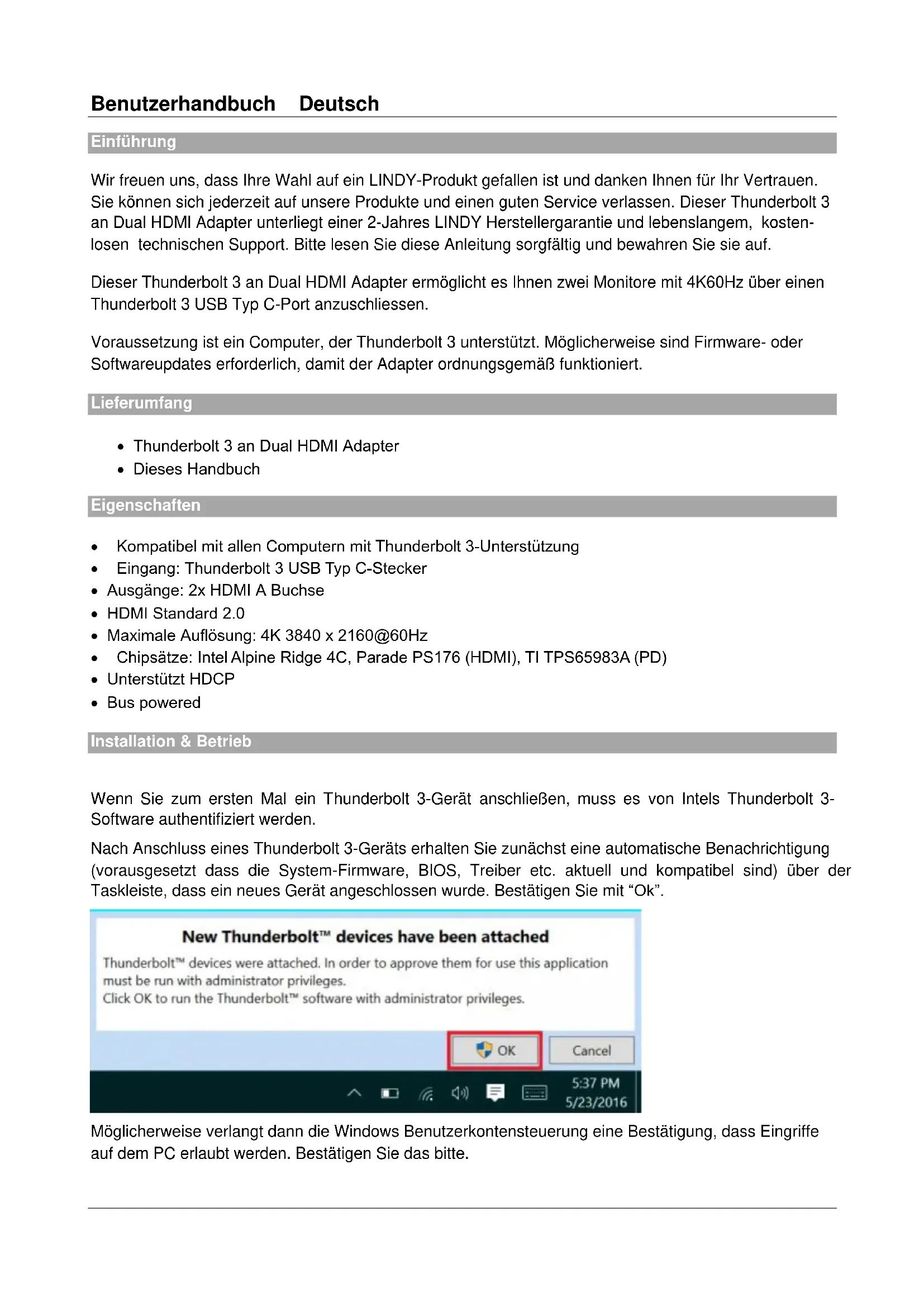 configured in Display Settings as usual.Benutzerhandbuch Deutsch Einführung Wir freuen uns, dass Ihre Wahl auf ein LINDY-Produkt gefallen ist und danken Ihnen für Ihr Vertrauen. Sie können sich jederzeit auf unsere Produkte und einen guten Service verlassen. Dieser Thunderbolt 3 an Dual HDMI Adapter unterliegt einer 2-Jahres LINDY Herstellergarantie und lebenslangem, kosten- losen technischen Support. Bitte lesen Sie diese Anleitung sorgfältig und bewahren Sie sie auf. Dieser Thunderbolt 3 an Dual HDMI Adapter ermöglicht es Ihnen zwei Monitore mit 4K60Hz über einen Thunderbolt 3 USB Typ C-Port anzuschliessen. Voraussetzung ist ein Computer, der Thunderbolt 3 unterstützt. Möglicherweise sind Firmware- oder Softwareupdates erforderlich, damit der Adapter ordnungsgemäß funktioniert. Lieferumfang Thunderbolt 3 an Dual HDMI Adapter Dieses Handbuch Eigenschaften Kompatibel mit allen Computern mit Thunderbolt 3-Unterstützung Eingang: Thunderbolt 3 USB Typ C-Stecker Ausgänge: 2x HDMI A Buchse HDMI Standard 2.0 Maximale Auflösung: 4K 3840 x 2160@60Hz Chipsätze: Intel Alpine Ridge 4C, Parade PS176 (HDMI), TI TPS65983A (PD) Unterstützt HDCP Bus powered Installation & Betrieb Wenn Sie zum ersten Mal ein Thunderbolt 3-Gerät anschließen, muss es von Intels Thunderbolt 3- Software authentifiziert werden. Nach Anschluss eines Thunderbolt 3-Geräts erhalten Sie zunächst eine automatische Benachrichtigung (vorausgesetzt dass die System-Firmware, BIOS, Treiber etc. aktuell und kompatibel sind) über der Taskleiste, dass ein neues Gerät angeschlossen wurde. Bestätigen Sie mit “Ok”. Möglicherweise verlangt dann die Windows Benutzerkontensteuerung eine Bestätigung, dass Eingriffe auf dem PC erlaubt werden. Bestätigen Sie das bitte.Benutzerhandbuch Deutsch Anschließend wird sich ein Fenster öffnen, in dem Sie das Thunderbolt 3-Gerät genehmigen können. Klicken Sie dann auf den Pfeil in der Dropdown-Liste und wählen Sie “Always Connect / Immer Verbinden”. Bestätigen Sie mit „Ok”. Identifizieren der Firmware Um die Firmwareversion Ihres Systems herauszufinden, müssen Sie sich zunächst vergewissern, dass Sie die neueste Thunderboltsoftware haben. Diese können Sie in der Regel von der Herstellerwebsite herunterladen. Nach der Installation öffnen Sie die Software indem Sie im Startmenü nach “Thunderbolt“ suchen: Nach dem Öffnen finden Sie das Programm in der Taskleiste. Klicken Sie auf den Pfeil in der Taskleiste, dann klicken Sie mit der rechten Maustaste auf das Thunderbolt-Icon und wählen „Settings / Einstellungen“: Hier können Sie nun Details über die Thunderboltsoftware und Informationen über den Controller finden. Leider stehen diese Firmewareinformationen nicht zur Verfügung, wenn das Thunderboltgerät nicht angeschlossen wurde.Benutzerhandbuch Deutsch Dual Display-Installation