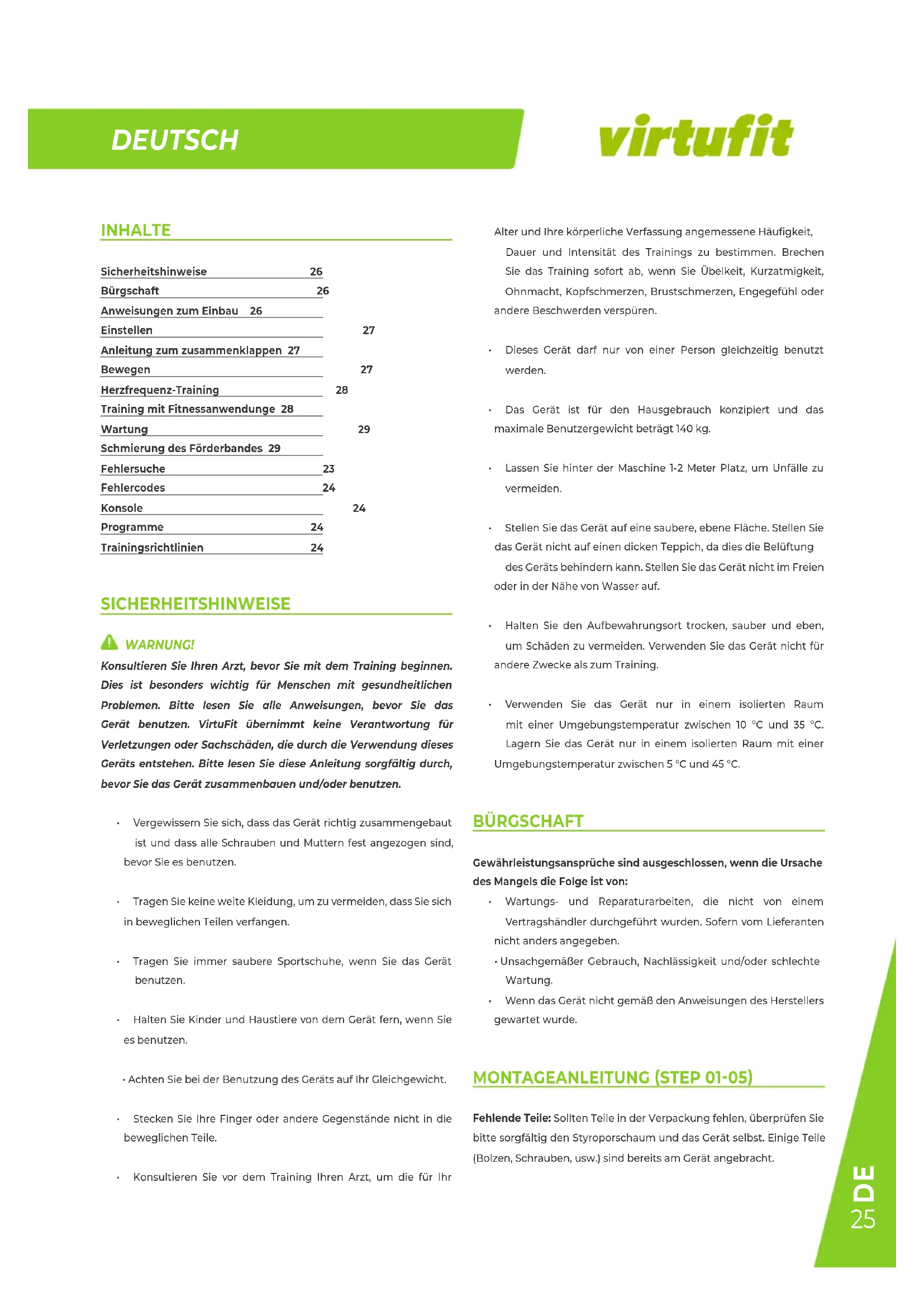 INHALTE Sicherheitshinweise 26 Bürgschaft 26 Anweisungen zum Einbau 26 Einstellen 27 Anleitung zum zusammenklappen 27 Bewegen 27 Herzfrequenz-Training 28 Training mit Fitnessanwendunge 28 Wartung 29 Schmierung des Förderbandes 29 Fehlersuche 23 Fehlercodes 24 Konsole 24 Programme 24 Trainingsrichtlinien 24 SICHERHEITSHINWEISE WARNUNG! Konsultieren Sie Ihren Arzt, bevor Sie mit dem Training beginnen. Dies ist besonders wichtig für Menschen mit gesundheitlichen Problemen. Bitte lesen Sie alle Anweisungen, bevor Sie das Gerät benutzen. VirtuFit übernimmt keine Verantwortung für Verletzungen oder Sachschäden, die durch die Verwendung dieses Geräts entstehen. Bitte lesen Sie diese Anleitung sorgfältig durch, bevor Sie das Gerät zusammenbauen und/oder benutzen.