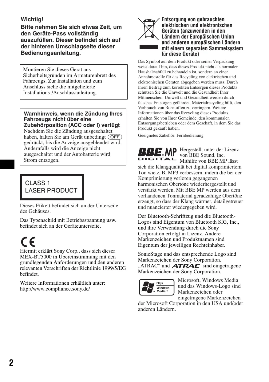 Hiermit erklärt Sony Corp., dass sich dieser MEX-BT5000 in Übereinstimmung mit den grundlegenden Anforderungen und den anderen relevanten Vorschriften der Richtlinie 1999/5/EG befindet. Weitere Informationen erhältlich unter: http://www.compliance.sony.de/