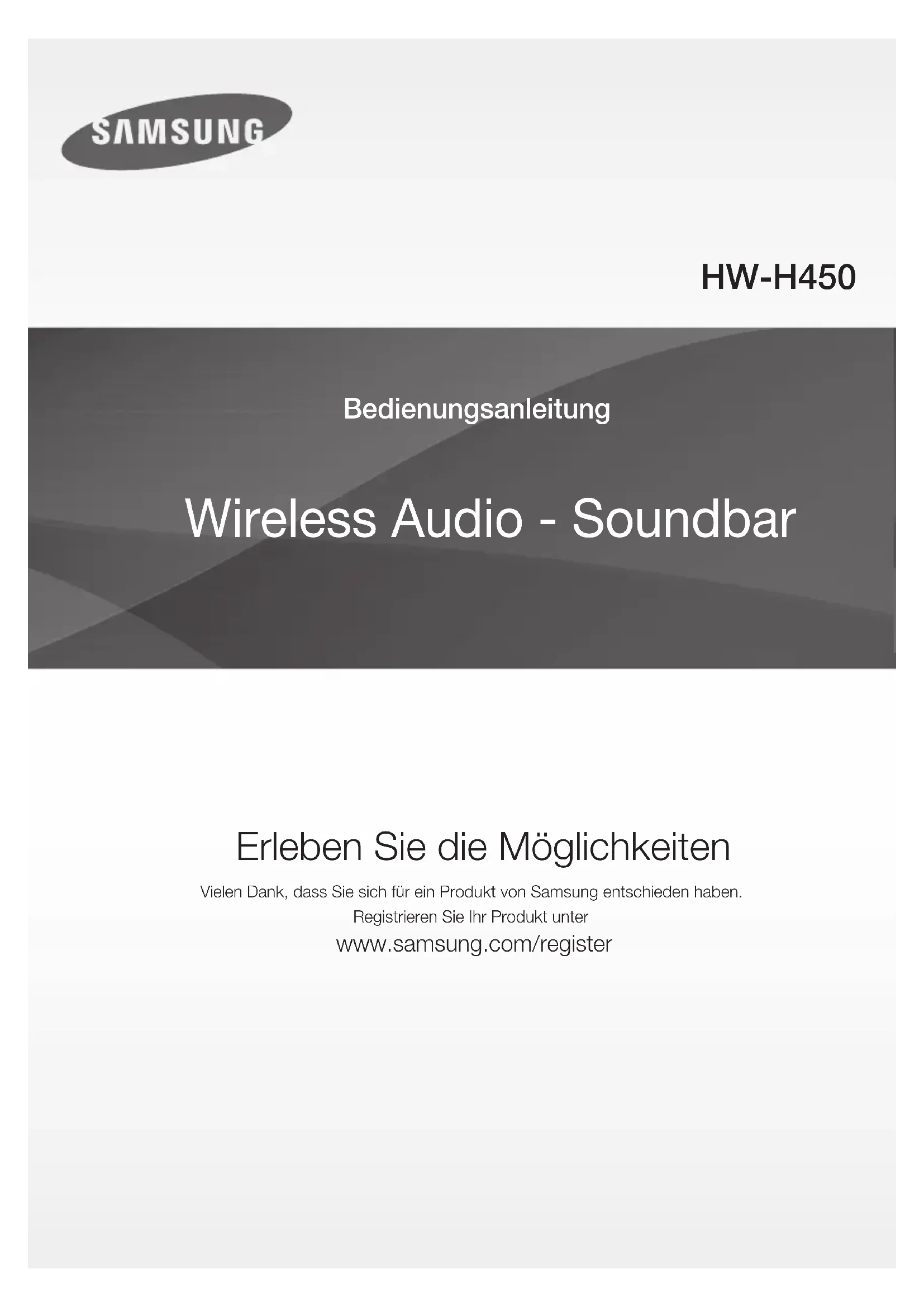 SICHERHEITSINFORMATIONEN 3 Hinweise zur sicherheit 4 Hinweise 6 ERSTE SCHRITTE 6 Wichtige informationen zum gebrauch der bedienungsanleitung 6 Lieferumfang 7 BESCHREIBUNGEN 7 Oberes/vorderes bedienfeld 8 Rückseite des Geräts 9 FERNBEDIENUNG 9 Tasten und funktionen der fernbedienung 11 ANSCHLÜSSE 11 Montageder wandhalterung 12 Entfernen der wandhalterung 12 Montage der Halterung ohne Zuhilfenahme der Montageanleitung der Wandhalterung 13 Anschluss des kabellosen Subwoofers 15 Anschliessen eines externen geräts mithilfe eines HDMI kabels 16 AnschlieSSen eines externen Geräts mithilfe eines Audiokabels (analog) oder optischen Kabels (digital) 17 FUNKTIONEN 17 Eingangsmodus 17 ARC (HDMI OUT) 18 Bluetooth 20 TV SoundConnect 21 USB 22 Software aktualisierung 23 FEHLERSUCHE 24 ANHANG 24 Technische daten ● Die Abbildungen in dieser Anleitung dienen nur als Referenz und können sich vom aktuellen Produkt unterscheiden. ● Es kann eine Gebühr erhoben werden, wenn: (a) Ein Techniker auf Ihre Anfrage bestellt wird und am Gerät kein Defekt vorliegt (z. B. weil Sie diese Bedienungsanleitung nicht gelesen haben). (b) Sie das Gerät in einer Reparaturwerkstatt abgegeben haben und am Gerät kein Defekt vorliegt (z. B. weil Sie diese Bedienungsanleitung nicht gelesen haben). ● Die Höhe dieser Gebühr wird Ihnen mitgeteilt, bevor irgendwelche Arbeiten durchgeführt werden oder der Hausbesuch erfolgt. HW-H450_EUR_GER_141106.indd 5HW-H450_EUR_GER_141106.indd 5 2014-11-06 4:50:062014-11-06 4:50:066 ERSTE SCHRITTE ERSTE SCHRITTE