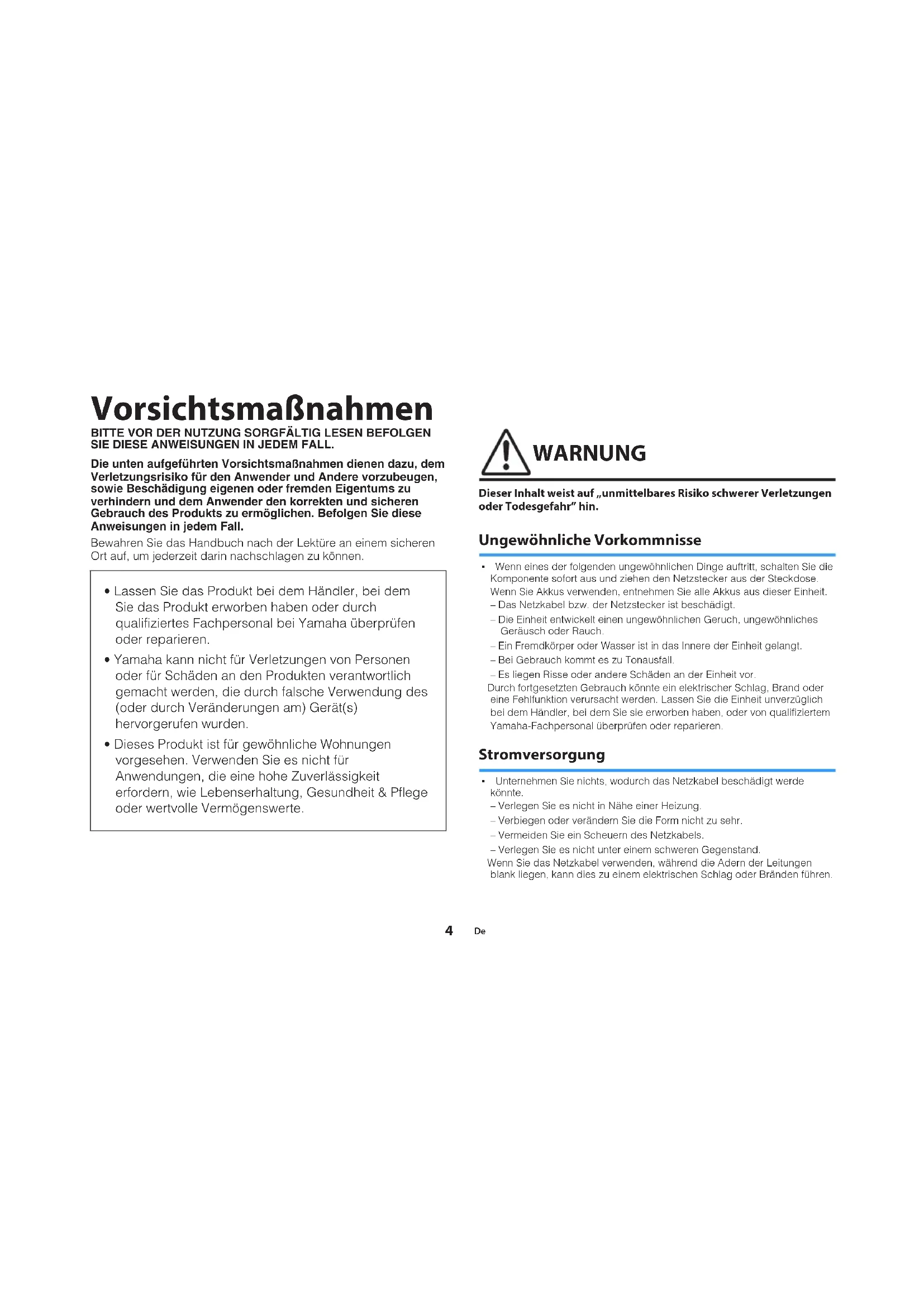 WARNUNG Dieser Inhalt weist auf „unmittelbares Risiko schwerer Verletzungenoder Todesgefahr” hin. Ungewöhnliche Vorkommnisse ƒ Wenn eines der folgenden ungewöhnlichen Dinge auftritt, schalten Sie dieKomponente sofort aus und ziehen den Netzstecker aus der Steckdose.Wenn Sie Akkus verwenden, entnehmen Sie alle Akkus aus dieser Einheit.– Das Netzkabel bzw. der Netzstecker ist beschädigt.– Die Einheit entwickelt einen ungewöhnlichen Geruch, ungewöhnlichesGeräusch oder Rauch.– Ein Fremdkörper oder Wasser ist in das Innere der Einheit gelangt.– Bei Gebrauch kommt es zu Tonausfall.– Es liegen Risse oder andere Schäden an der Einheit vor. Durch fortgesetzten Gebrauch könnte ein elektrischer Schlag, Brand odereine Fehlfunktion verursacht werden. Lassen Sie die Einheit unverzüglichbei dem Händler, bei dem Sie sie erworben haben, oder von qualifiziertemYamaha-Fachpersonal überprüfen oder reparieren. Stromversorgung ƒ Unternehmen Sie nichts, wodurch das Netzkabel beschädigt werdekönnte.– Verlegen Sie es nicht in Nähe einer Heizung.– Verbiegen oder verändern Sie die Form nicht zu sehr.– Vermeiden Sie ein Scheuern des Netzkabels.– Verlegen Sie es nicht unter einem schweren Gegenstand. Wenn Sie das Netzkabel verwenden, während die Adern der Leitungenblank liegen, kann dies zu einem elektrischen Schlag oder Bränden führen.