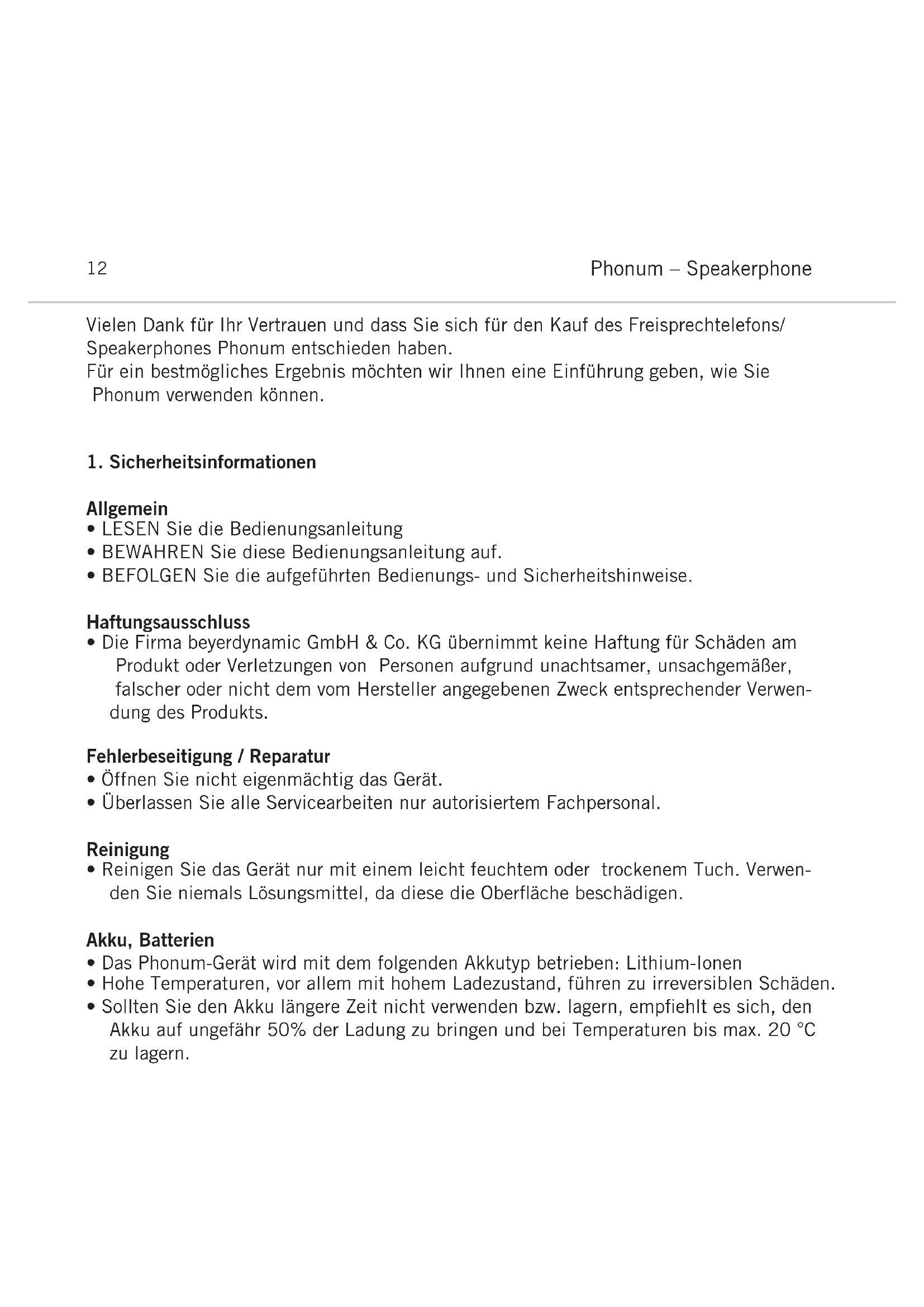 - Sollten Sie den Akku längere Zeit nicht verwenden bzw. lagern, empfiehlt es sich, den Akku auf ungefähr 50% der Ladung zu bringen und bei Temperaturen bis max. 20 °C zu lagern.deutsch Phonum – Speakerphone