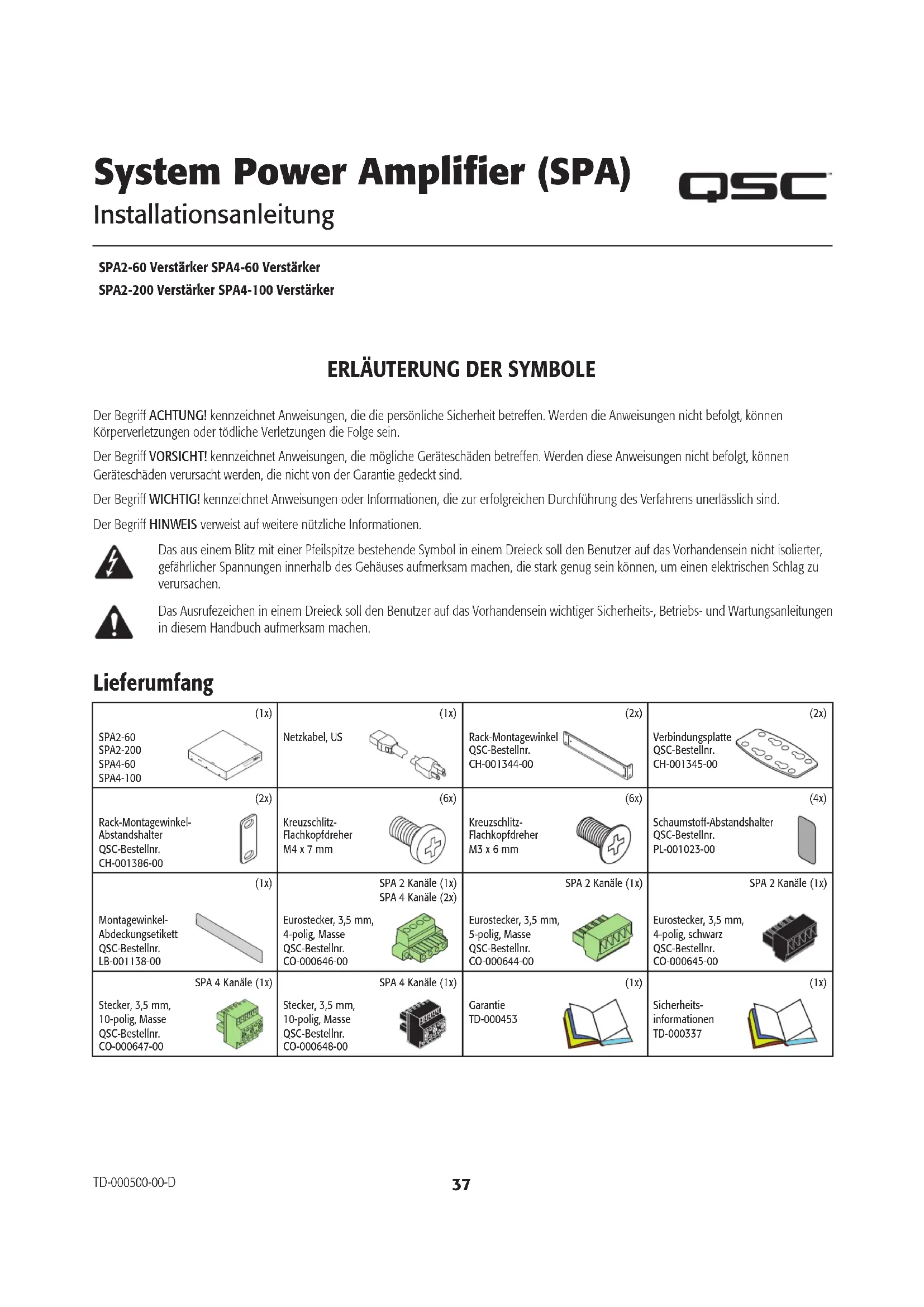 Der Begriff ACHTUNG! kennzeichnet Anweisungen, die die persönliche Sicherheit betreffen. Werden die Anweisungen nicht befolgt, können Körperverletzungen oder tödliche Verletzungen die Folge sein. Der Begriff VORSICHT! kennzeichnet Anweisungen, die mögliche Geräteschäden betreffen. Werden diese Anweisungen nicht befolgt, können Geräteschäden verursacht werden, die nicht von der Garantie gedeckt sind. Der Begriff WICHTIG! kennzeichnet Anweisungen oder Informationen, die zur erfolgreichen Durchführung des Verfahrens unerlässlich sind. Der Begriff HINWEIS verweist auf weitere nützliche Informationen. Das aus einem Blitz mit einer Pfeilspitze bestehende Symbol in einem Dreieck soll den Benutzer auf das Vorhandensein nicht isolierter, gefährlicher Spannungen innerhalb des Gehäuses aufmerksam machen, die stark genug sein können, um einen elektrischen Schlag zu verursachen. Das Ausrufezeichen in einem Dreieck soll den Benutzer auf das Vorhandensein wichtiger Sicherheits-, Betriebs- und Wartungsanleitungen in diesem Handbuch aufmerksam machen. Lieferumfang (1x) SPA2-60 SPA2-200 SPA4-60 SPA4-100 (1x) Netzkabel, US (2x) Rack-Montagewinkel QSC-Bestellnr. CH-001344-00 (2x) Verbindungsplatte QSC-Bestellnr. CH-001345-00 (2x) Rack-Montagewinkel-Abstandshalter QSC-Bestellnr. CH-001386-00 (6x) Kreuzschlitz-Flachkopfdreher M4 x 7 mm (6x) Kreuzschlitz-Flachkopfdreher M3 x 6 mm (4x) Schaumstoff-Abstandshalter QSC-Bestellnr. PL-001023-00 (1x) Montagewinkel-Abdeckungsetikett QSC-Bestellnr. LB-001138-00SPA 2 Kanäle (1x) SPA 4 Kanäle (2x)Eurostecker, 3,5 mm, 4-polig, Masse QSC-Bestellnr. CO-000646-00 SPA 2 Kanäle (1x) Eurostecker, 3,5 mm, 5-polig, Masse QSC-Bestellnr. CO-000644-00 SPA 2 Kanäle (1x) Eurostecker, 3,5 mm, 4-polig, schwarz QSC-Bestellnr. CO-000645-00 SPA 4 Kanäle (1x)Stecker, 3,5 mm, 10-polig, Masse QSC-Bestellnr. CO-000647-00 SPA 4 Kanäle (1x)Stecker, 3,5 mm, 10-polig, Masse QSC-Bestellnr. CO-000648-00 (1x) Garantie TD-000453 (1x) Sicherheits- informationen TD-000337 TD-000500-00-D38 TD-000500-00-D