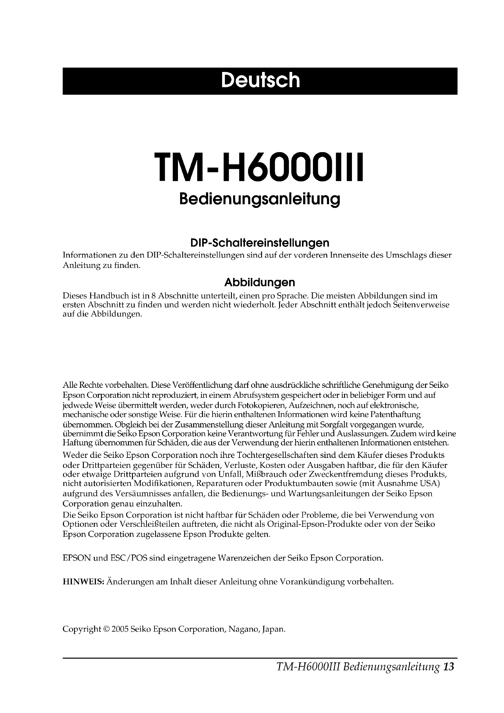 Endorsement: 1.1 × 2.42 mm {0.04 × 0.10"} Character sets 95 alphanumeric, 37 international characters 128 × 11 (slip: 12) pages extended graphic characters Print speed Receipt: 63, Slip: 5.14, Endorsement: 1.9 (lines per second) Paper dimensions Receipt: Thermal roll paper 79.5 ± 0.5 × 83 mm {3.1 ± 0.02 × 3.3"} Slip/endorsement: 70 ~148 × 150 ~ 210 mm {2.8 ~ 5.8 × 5.9 ~ 8.3"} (W × L) Paper thickness Slip (single-ply): 0.09 ~ 0.2 mm {0.0035 ~ 0.0079"} Endorsement: 0.09 ~ 0.2 mm {0.0035 ~ 0.0079"} Copy capability Receipt/Endorsement: Single-ply Slip: 1 original + 3 copies Inked ribbon Slip: ERC-32(P) Endorsement: ERC-41(P) Ribbon life Slip: 6 million characters Endorsement: 1 million characters Interface (compatible) RS-232C/Bi-directional parallel/RS-485 (dealer option) Data buffer Selectable for 45 bytes or 4 KB using DIP switch D.K.D. function 2 drives Power supply +24 VDC ± 10%12 TM-H6000III User’s Manual English Current consumption Slip: Approximately 1.7 A (mean) Receipt: Approximately 1.8 A (mean) Temperature Operating: 5 to 45°C {41 to 113°F} Storage: −10 to 50°C {14 to 122°F} Humidity 10 to 90% without condensation Reliability Receipt: MTBF: 360,000 hours, MCBF: 72 million lines Slip: MTBF: 180,000 hours, MCBF: 18 million lines Overall dimensions 185 × 186 × 298 mm {7.28 × 7.32 × 11.73"} (H × W × D) Mass Approximately 5.3 kg {11.7 lb}TM-H6000III Bedienungsanleitung 13 English Deutsch TM-H6000III Bedienungsanleitung DIP-Schaltereinstellungen Informationen zu den DIP-Schaltereinstellungen sind auf der vorderen Innenseite des Umschlags dieser Anleitung zu finden. Abbildungen Dieses Handbuch ist in 8 Abschnitte unterteilt, einen pro Sprache. Die meisten Abbildungen sind im ersten Abschnitt zu finden und werden nicht wiederholt. Jeder Abschnitt enthält jedoch Seitenverweise auf die Abbildungen. Alle Rechte vorbehalten. Diese Veröffentlichung darf ohne ausdrückliche schriftliche Genehmigung der Seiko Epson Corporation nicht reproduziert, in einem Abrufsystem gespeichert oder in beliebiger Form und auf jedwede Weise übermittelt werden, weder durch Fotokopieren, Aufzeichnen, noch auf elektronische, mechanische oder sonstige Weise. Für die hierin enthaltenen Informationen wird keine Patenthaftung übernommen. Obgleich bei der Zusammenstellung dieser Anleitung mit Sorgfalt vorgegangen wurde, übernimmt die Seiko Epson Corporation keine Verantwortung für Fehler und Auslassungen. Zudem wird keine Haftung übernommen für Schäden, die aus der Verwendung der hierin enthaltenen Informationen entstehen. Weder die Seiko Epson Corporation noch ihre Tochtergesellschaften sind dem Käufer dieses Produkts oder Drittparteien gegenüber für Schäden, Verluste, Kosten oder Ausgaben haftbar, die für den Käufer oder etwaige Drittparteien aufgrund von Unfall, Mißbrauch oder Zweckentfremdung dieses Produkts, nicht autorisierten Modifikationen, Reparaturen oder Produktumbauten sowie (mit Ausnahme USA) aufgrund des Versäumnisses anfallen, die Bedienungs- und Wartungsanleitungen der Seiko Epson Corporation genau einzuhalten. Die Seiko Epson Corporation ist nicht haftbar für Schäden oder Probleme, die bei Verwendung von Optionen oder Verschleißteilen auftreten, die nicht als Original-Epson-Produkte oder von der Seiko Epson Corporation zugelassene Epson Produkte gelten.EPSON und ESC/POS sind eingetragene Warenzeichen der Seiko Epson Corporation. HINWEIS: Änderungen am Inhalt dieser Anleitung ohne Vorankündigung vorbehalten. Copyright © 2005 Seiko Epson Corporation, Nagano, Japan.14 TM-H6000III Bedienungsanleitung English Geltende EMC- und Sicherheitsnormen Produktname: TM-H6000IIITypenname: M147G Die folgenden Normen gelten nur für entsprechend gekennzeichnete Drucker. (Die EMC-Prüfung erfolgt anhand der EPSON Stromversorgung.) Europa: CE-PlaketteSicherheit: EN 60950Nordamerika: EMI: FCC / ICES-003 Klasse ASicherheit: UL 1950 / CSA C22.2 No. 950Japan: EMI: VCCI Klasse AOzeanien: EMC: AS/NZS CISPR22 Klasse B WARNUNG Die EMC-Normen für dieses Gerät werden ungültig, wenn ein nicht isoliertes Drucker-Schnittstellenkabel an den Drucker angeschlossen wird. Bitte beachten Sie, daß durch Änderungen oder Modifikationen, die nicht ausdrücklich von der SEIKO EPSON Corporation genehmigt wurden, die Bedienung des Geräts unter Umständen unzulässig wird. CE-Plakette Der Drucker entspricht den folgenden Direktiven and Normen:Direktive 89/336/EEC EN 55022 Klasse BEN 55024 IEC 61000-4-2 IEC 61000-4-3 IEC 61000-4-4 IEC 61000-4-5 IEC 61000-4-6 IEC 61000-4-8IEC 61000-4-11 GERÄUSCHPEGEL Gemäß der Dritten Verordnung zum Gerätesicherheitsgesetz (Maschinenlärminformations- Verordnung-3. GSGV) ist der arbeitsplatzbezogene Geräusch-Emissionswert kleiner als 70 dB(A) (basierend auf ISO 7779). Sicherheitsvorkehrungen Dieser Abschnitt enthält wichtige Informationen, die beachtet werden müssen, damit dieses Produkt sicher und effektiv funktioniert. Bitte lesen Sie diese Informationen sorgfältig durch, und bewahren Sie sie leicht erreichbar auf. WARNUNG: Schalten Sie das Gerät bei Rauchentwicklung, Abgabe eines eigenartigen Geruchs oder ungewöhnlichen Geräuschs sofort aus. Bei weiterer Verwendung besteht Feuergefahr. Ziehen Sie den Netzstecker des Gerätes sofort aus der Netzsteckdose und benachrichtigen Sie Ihren Händler oder ein SEIKO EPSON Service Center. Versuchen Sie keinesfalls das Gerät selbst zu reparieren. Falsch durchgeführte Reparaturarbeiten können Gefahren mit sich bringen. Das Produkt keineswegs auseinandernehmen oder umbauen. Nach unbefugten Eingriffen in dieses Produkt sind Verletzungs- und Feuergefahr nicht auszuschließen. Verwenden Sie nur das für dieses Produkt spezifizierte Netzteil. Beim Anschluss an das falsche Netzteil besteht Brandgefahr.TM-H6000III Bedienungsanleitung 15 English Keine Fremdkörper in das Gerät fallen lassen. Beim Eindringen von Fremdkörpern besteht Feuergefahr. Falls Wasser oder sonstige Flüssigkeiten in das Gerät gelangen, sofo