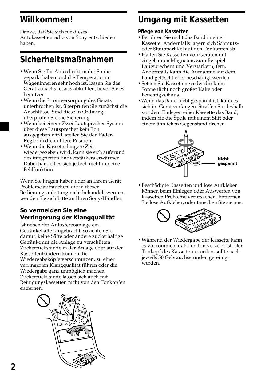 Willkommen! Umgang mit Kassetten Danke, daß Sie sich für dieses Autokassettenradio von Sony entschieden haben. Pflege von Kassetten