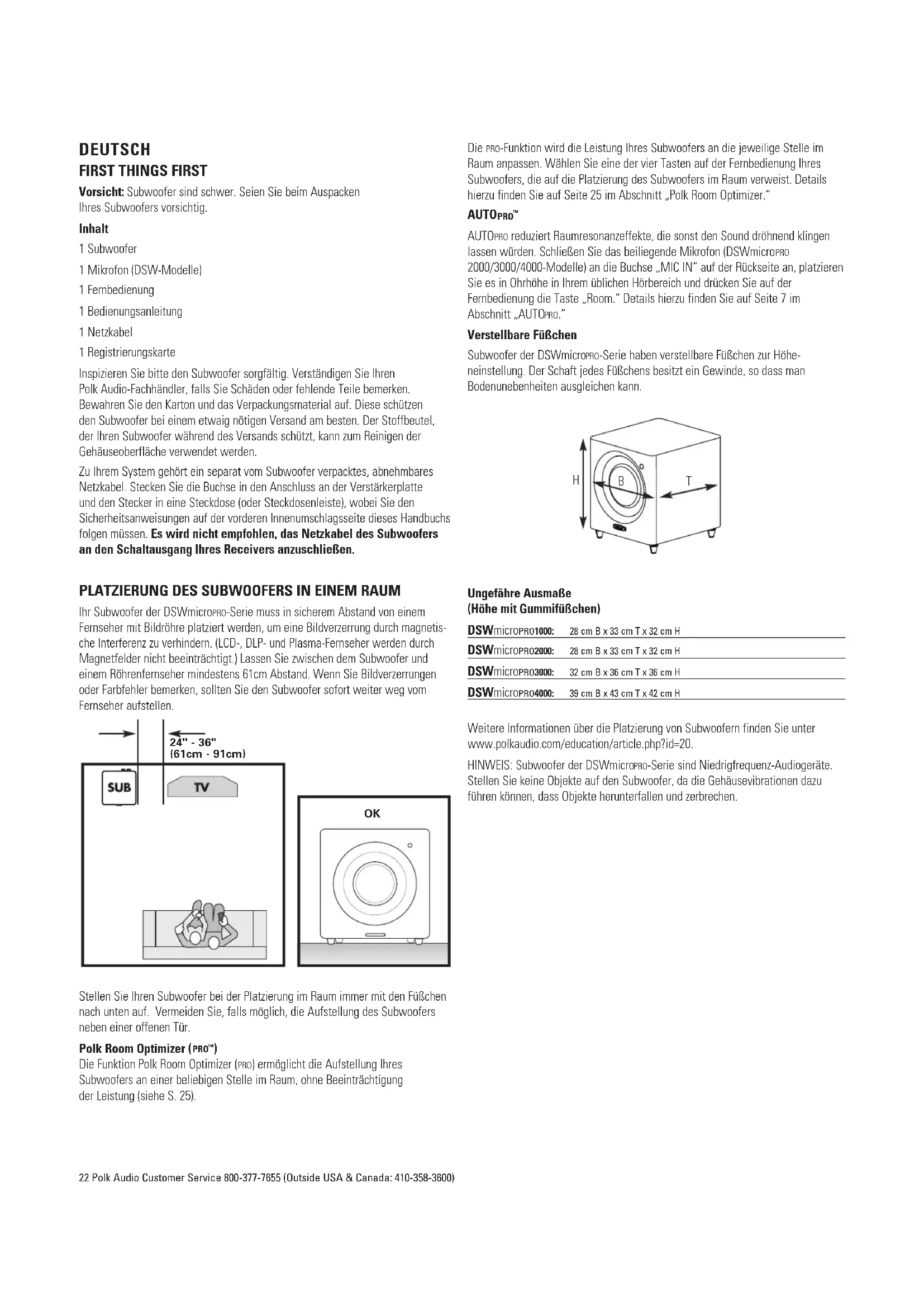 Ihr Subwoofer der DSWmicroPRO-Serie muss in sicherem Abstand von einem Fernseher mit Bildröhre platziert werden, um eine Bildverzerrung durch magnetis- che Interferenz zu verhindern. (LCD-, DLP- und Plasma-Fernseher werden durch Magnetfelder nicht beeinträchtigt.) Lassen Sie zwischen dem Subwoofer und einem Röhrenfernseher mindestens 61cm Abstand. Wenn Sie Bildverzerrungen oder Farbfehler bemerken, sollten Sie den Subwoofer sofort weiter weg vom Fernseher aufstellen. Stellen Sie Ihren Subwoofer bei der Platzierung im Raum immer mit den Füßchen nach unten auf. Vermeiden Sie, falls möglich, die Aufstellung des Subwoofers neben einer offenen Tür. Polk Room Optimizer ( PRO