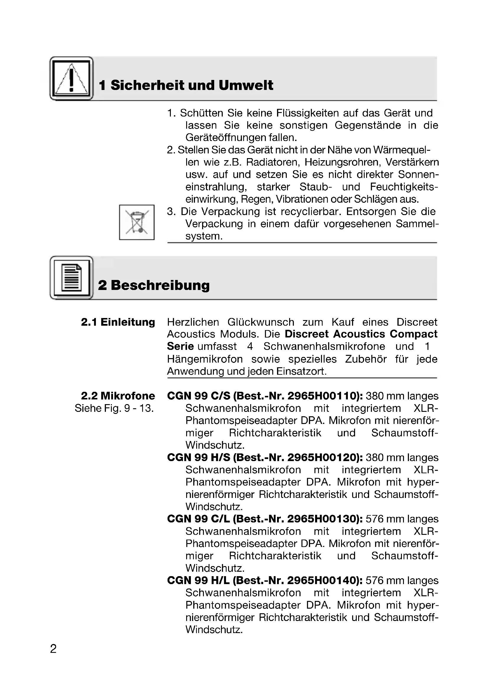 Verpackung in einem dafür vorgesehenen Sammel- system. Herzlichen Glückwunsch zum Kauf eines Discreet Acoustics Moduls. Die Discreet Acoustics Compact Serie umfasst 4 Schwanenhalsmikrofone und 1 Hängemikrofon sowie spezielles Zubehör für jede Anwendung und jeden Einsatzort. CGN 99 C/S (Best.-Nr. 2965H00110): 380 mm langes Schwanenhalsmikrofon mit integriertem XLR- Phantomspeiseadapter DPA. Mikrofon mit nierenför- miger Richtcharakteristik und Schaumstoff- Windschutz. CGN 99 H/S (Best.-Nr. 2965H00120): 380 mm langes Schwanenhalsmikrofon mit integriertem XLR- Phantomspeiseadapter DPA. Mikrofon mit hyper- nierenförmiger Richtcharakteristik und Schaumstoff- Windschutz. CGN 99 C/L (Best.-Nr. 2965H00130): 576 mm langes Schwanenhalsmikrofon mit integriertem XLR- Phantomspeiseadapter DPA. Mikrofon mit nierenför- miger Richtcharakteristik und Schaumstoff- Windschutz. CGN 99 H/L (Best.-Nr. 2965H00140): 576 mm langes Schwanenhalsmikrofon mit integriertem XLR- Phantomspeiseadapter DPA. Mikrofon mit hyper- nierenförmiger Richtcharakteristik und Schaumstoff- Windschutz. 2 Beschreibung 4457_09_AKG_BDA_GN-Compact_ps 10.09.2009 11:52 Uhr Seite 23 2 Beschreibung Siehe Fig. 14.