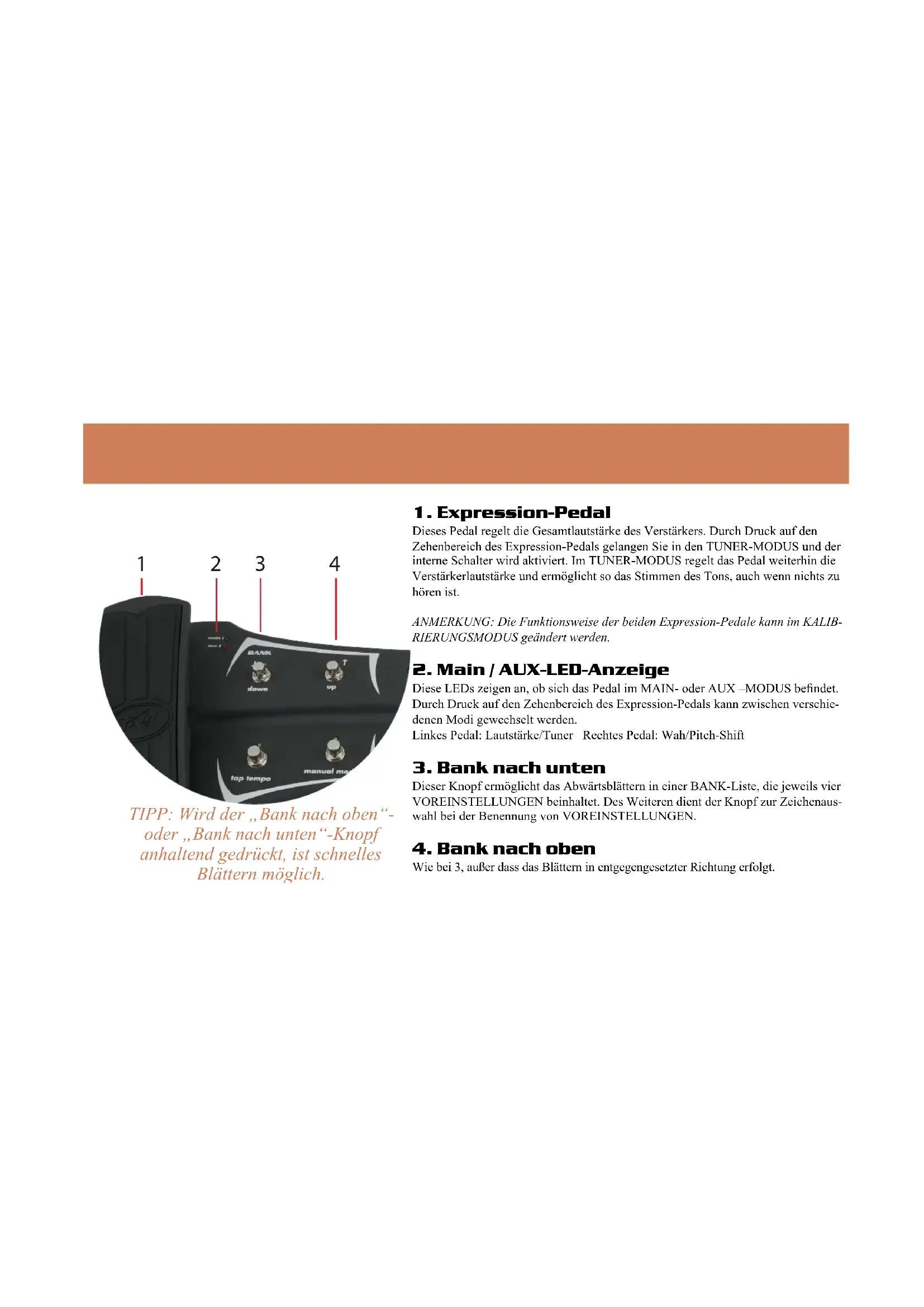 LOOPER -Steuerung 6. Rec / PlayHiermit warden Sie Stunden verbringen! Soll ein Loop zur späteren Wiedergabe aufgenommen werden, muss einfach nur gespielt werden. Zum START des Loops wird dieser Knopf gedrückt und der Verstärker zeichnet das Loop auf. Zum STOPPEN(STOP) der Aufnahme wird der Knop noch einmal gedrückt. Der Looper stoppt die Aufnahme und beginnt automatisch mit der Wiedergabe.7. Stop/Reset Zum STOPPEN(STOP) eines Loops während der Wiedergabe wird dieser Knopf gedrückt. Durch 3 Sekunden langes Drücken dieses Knopfes wird das aktuelle (mit Knopf 6 aufgenommene und gespeicherte) Loop GELÖSCHT.8. Main/AUX-LED-AnzeigeDiese LEDs zeigen an, ob sich das Pedal im MAIN- oder im AUX-MODUS be-ndet. Durch Druck auf den Zehenbereich des Expression-Pedals kann zwischen verschiedenen Modi gewechselt werden. Main zeigt Wah an, Aux zeigt Pitch-Shift an.9. Expression-PedalIst dieses Pedal aktiviert, regelt es ein Universal-Wah. Das Wah wird durch Druck auf den Zehenbereich des Fußschalters aktiviert. Ist Pitch-Shift am Ver-stärker ausgewählt, regelt dieses Pedal den Pitch des Signals.