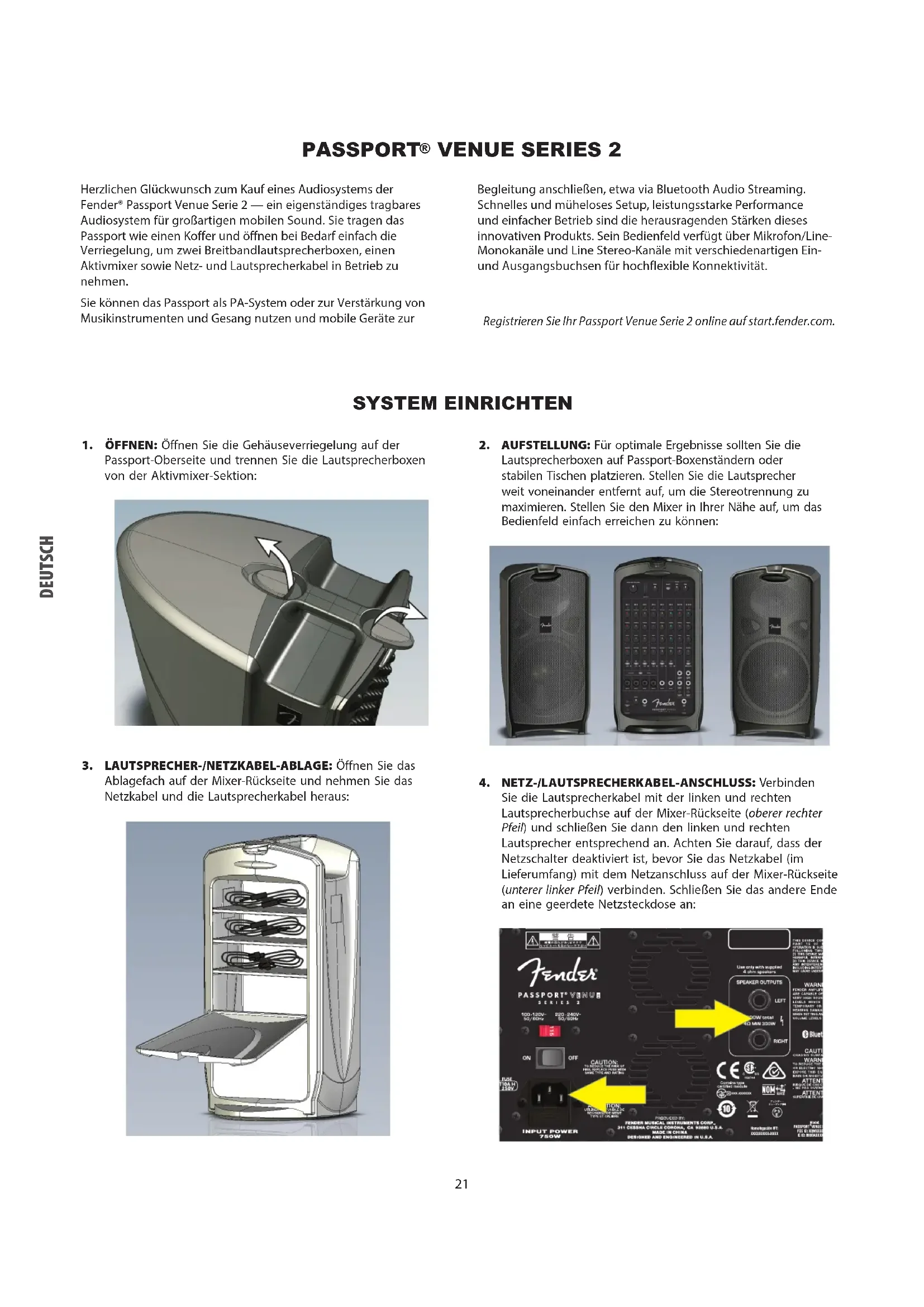 FUSIBILE T10A H, 250V TIPO DI AMPLIFICATORE Classe D ALTOPARLANTI Due woofer da 10", due driver HF da 1,2" DIMENSIONI E PESO Larghezza: 73,6 cm Altezza: 58,4 cm Profondità: 27,9 cm Peso: 19,96 kg Le specifiche dei prodotti possono variare senza preavviso.DEUTSCH SYSTEM EINRICHTEN Herzlichen Glückwunsch zum Kauf eines Audiosystems der Fender® Passport Venue Serie 2 — ein eigenständiges tragbares Audiosystem für großartigen mobilen Sound. Sie tragen das Passport wie einen Koffer und öffnen bei Bedarf einfach die Verriegelung, um zwei Breitbandlautsprecherboxen, einen Aktivmixer sowie Netz- und Lautsprecherkabel in Betrieb zu nehmen. Sie können das Passport als PA-System oder zur Verstärkung von Musikinstrumenten und Gesang nutzen und mobile Geräte zur Begleitung anschließen, etwa via Bluetooth Audio Streaming. Schnelles und müheloses Setup, leistungsstarke Performance und einfacher Betrieb sind die herausragenden Stärken dieses innovativen Produkts. Sein Bedienfeld verfügt über Mikrofon/Line- Monokanäle und Line Stereo-Kanäle mit verschiedenartigen Ein- und Ausgangsbuchsen für hochflexible Konnektivität. Registrieren Sie Ihr Passport Venue Serie 2 online auf start.fender.com. PASSPORT