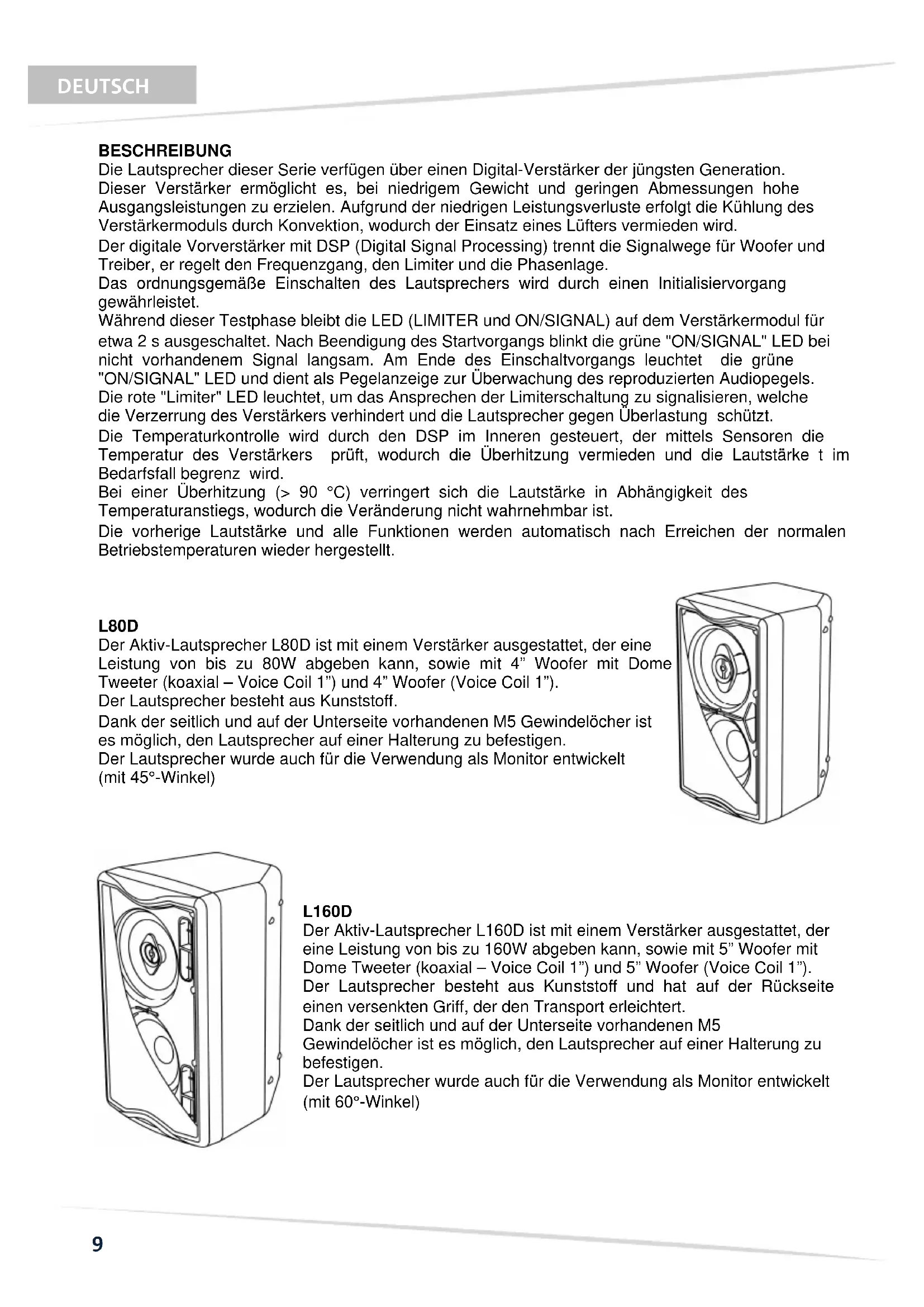 L160D Der Aktiv-Lautsprecher L160D ist mit einem Verstärker ausgestattet, der eine Leistung von bis zu 160W abgeben kann, sowie mit 5” Woofer mit Dome Tweeter (koaxial – Voice Coil 1”) und 5” Woofer (Voice Coil 1”). Der Lautsprecher besteht aus Kunststoff und hat auf der Rückseite einen versenkten Griff, der den Transport erleichtert. Dank der seitlich und auf der Unterseite vorhandenen M5 Gewindelöcher ist es möglich, den Lautsprecher auf einer Halterung zu befestigen. Der Lautsprecher wurde auch für die Verwendung als Monitor entwickelt (mit 60°-Winkel)10