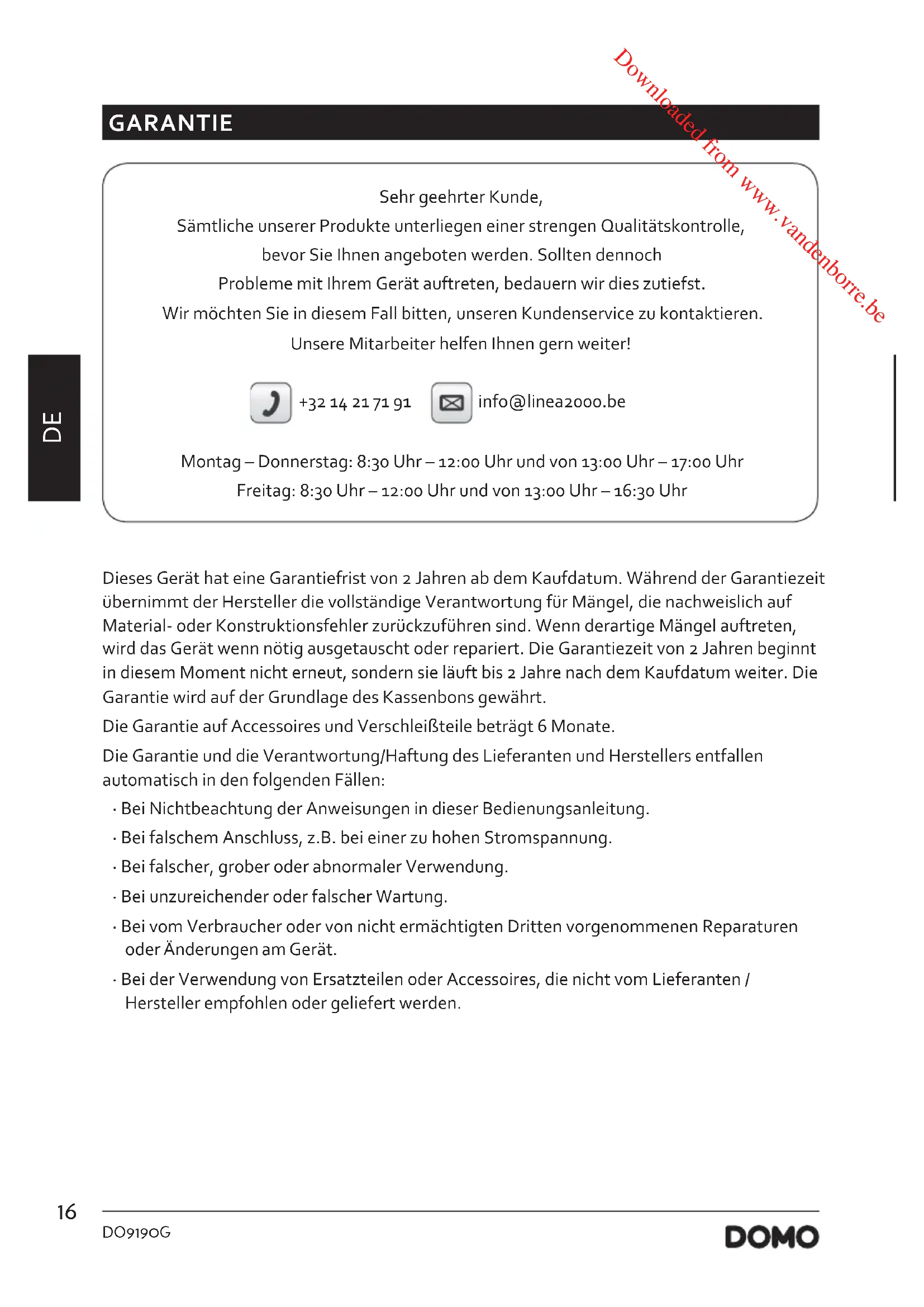 - Bei der Verwendung von Ersatzteilen oder Accessoires, die nicht vom Lieferanten / Hersteller empfohlen oder geliefert werden. Downloaded from www.vandenborre.be17 DO9190G www.domo-elektro.be