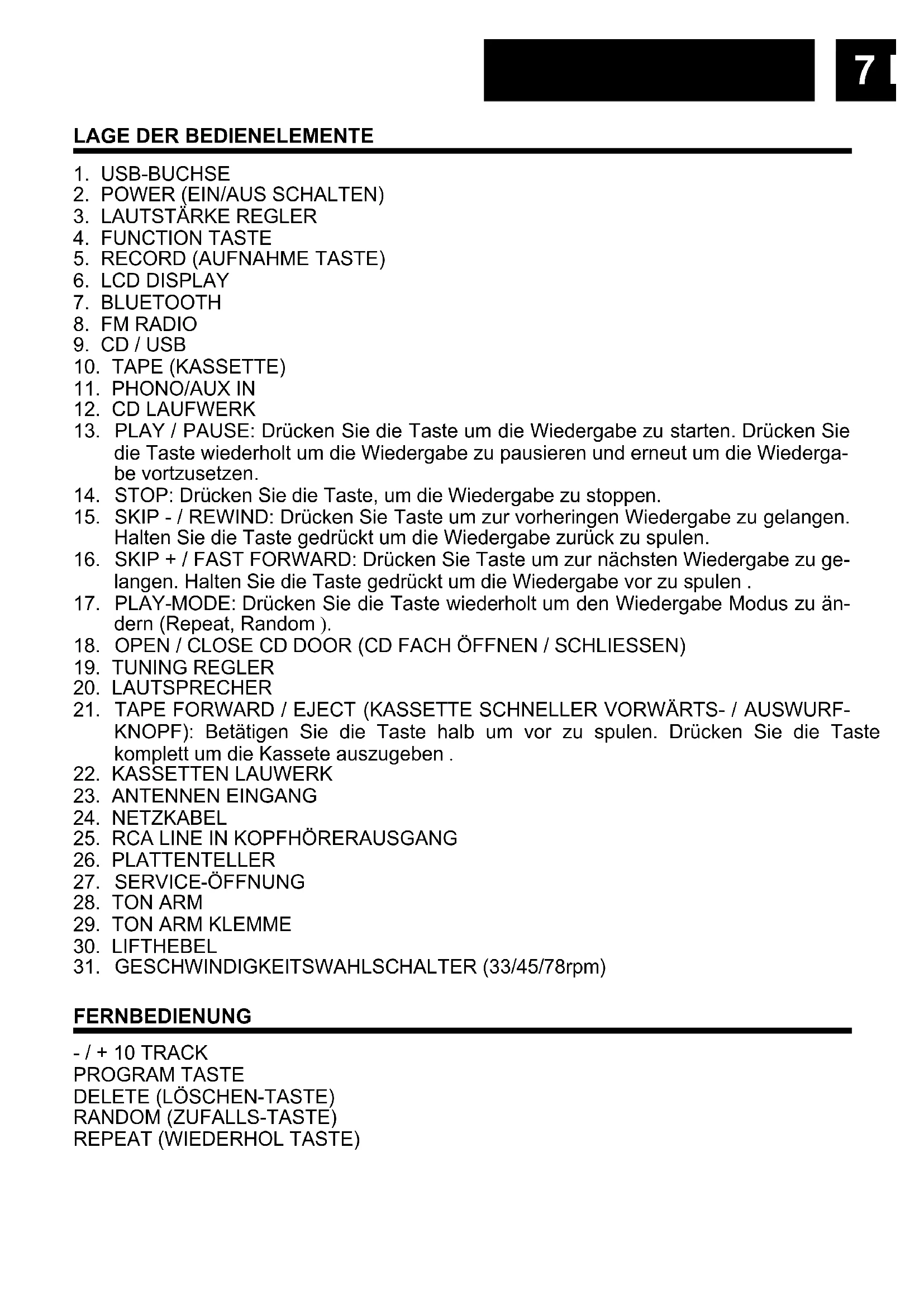 genden Kapiteln); Verändern Sie die Lautstärke mit dem [LAUTSTÄRKE REGLER] (3) um die Lautstär- ke an Ihr hörempfinden an zu passen; Halten Sie die [POWER] Taste (2) gedrückt, um das Gerät aus zu schalten. Hinweise: Wenn kein Ton ausgegeben wird, schaltet sich das Gerät nach 10 Minuten automatisch aus9 Deutsch RADIO MODUS Drücken Sie die [FM] Taste (8); Um den gewünschten Radiosender auszuwählen, Drehen Sie den [TUNING RE- GLER] (19). Hinweis: Richten Sie die Antenne (23) für einen besseren FM Empfang aus. SCHALLPLATTEN MODUS Hinweis: Wenn Sie den Schallplatten Betrieb zum ersten Mal verwenden, schrauben Sie die [TRANSPORTSCHRAUBE] (27) an der oberen rechten Seite des Drehtellers im Uhrzeigersinn rein. Drücken Sie die [PHONO] Taste (11); Legen Sie eine Schallplatte auf den Plattenteller auf. Platzieren Sie den Adapter, wenn eine 45er Aufzeichnungen mit 45 U / Min wiedergegen werden soll; Stellen Sie den [GESCHWINDIGKEITSWAHLSCHALTER] (31) entsprechend der Aufzeichnung auf 33, 45 oder 78 U / min; Lösen Sie die [TONARMKLEMME] (29) und entfernen Sie den Schutzkappe vom Tonnadelkopf; Heben Sie den [TONARM] (28) mit dem [LIFTHEBEL] (30) an; Bewege den [TONARM] (28) an den Anfang der Aufnahme; Setzen Sie den [TONARM] (28) mit dem [LIFTHEBEL] (30) ab; Wenn die Wiedergabe beendet ist, kehrt der [TONARM] (28) automatisch zur Ton- armablage zurück und die [PLATTENTELLER] (26) hört auf, sich zu drehen. Um die Wiedergabe manuell anzuhalten, heben Sie den [TONARM] (33) von der Schallplatte und legen ihn auf der Tonarmablage ab. Hinweis: Stoppen oder drehen Sie den [PLATTENTELLER] (26) nicht manuell. Wenn das Gerät bewegt bzw. Transportiert wird : Sichern Sie den [TONARM] (28) mit der [TONARMKLEMME] (29). Setzen Sie die Schutzkappe auf den Tonnadelkopf (auch bei nichtbenuzung). Schrauben Sie die [TRANSPORTSCHRAUBE] (27) gegen den Uhrzeigersinn heraus bis ein Wiederstand zu spüren ist (nicht komplett heraus schrauben).