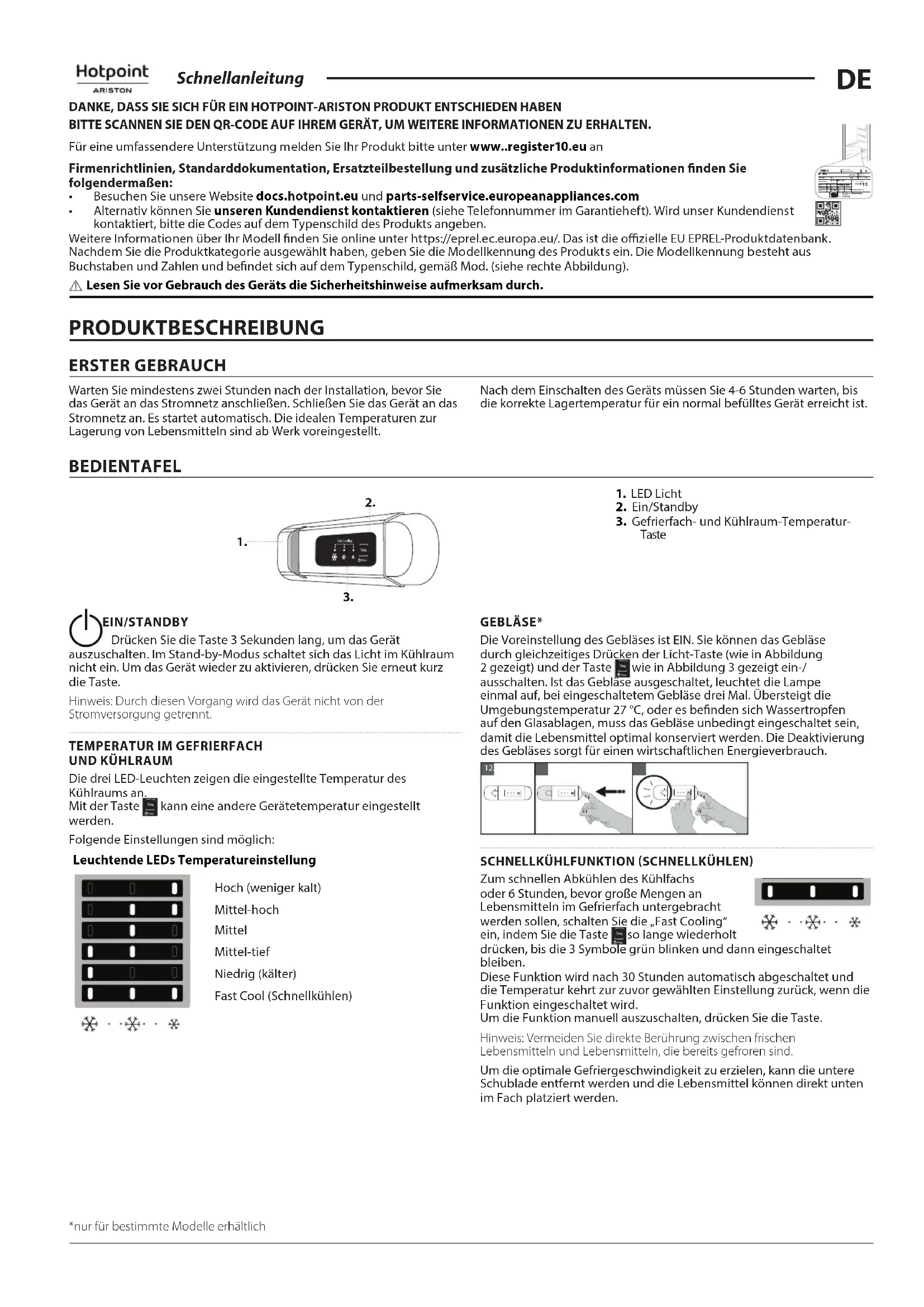 Schnellanleitung DANKE, DASS SIE SICH FÜR EIN HOTPOINT-ARISTON PRODUKT ENTSCHIEDEN HABEN BITTE SCANNEN SIE DEN QR-CODE AUF IHREM GERÄT, UM WEITERE INFORMATIONEN ZU ERHALTEN. Für eine umfassendere Unterstützung melden Sie Ihr Produkt bitte unter www. . register10 . eu an Firmenrichtlinien, Standarddokumentation, Ersatzteilbestellung und zusätzliche Produktinformationen nden Sie folgendermaßen: