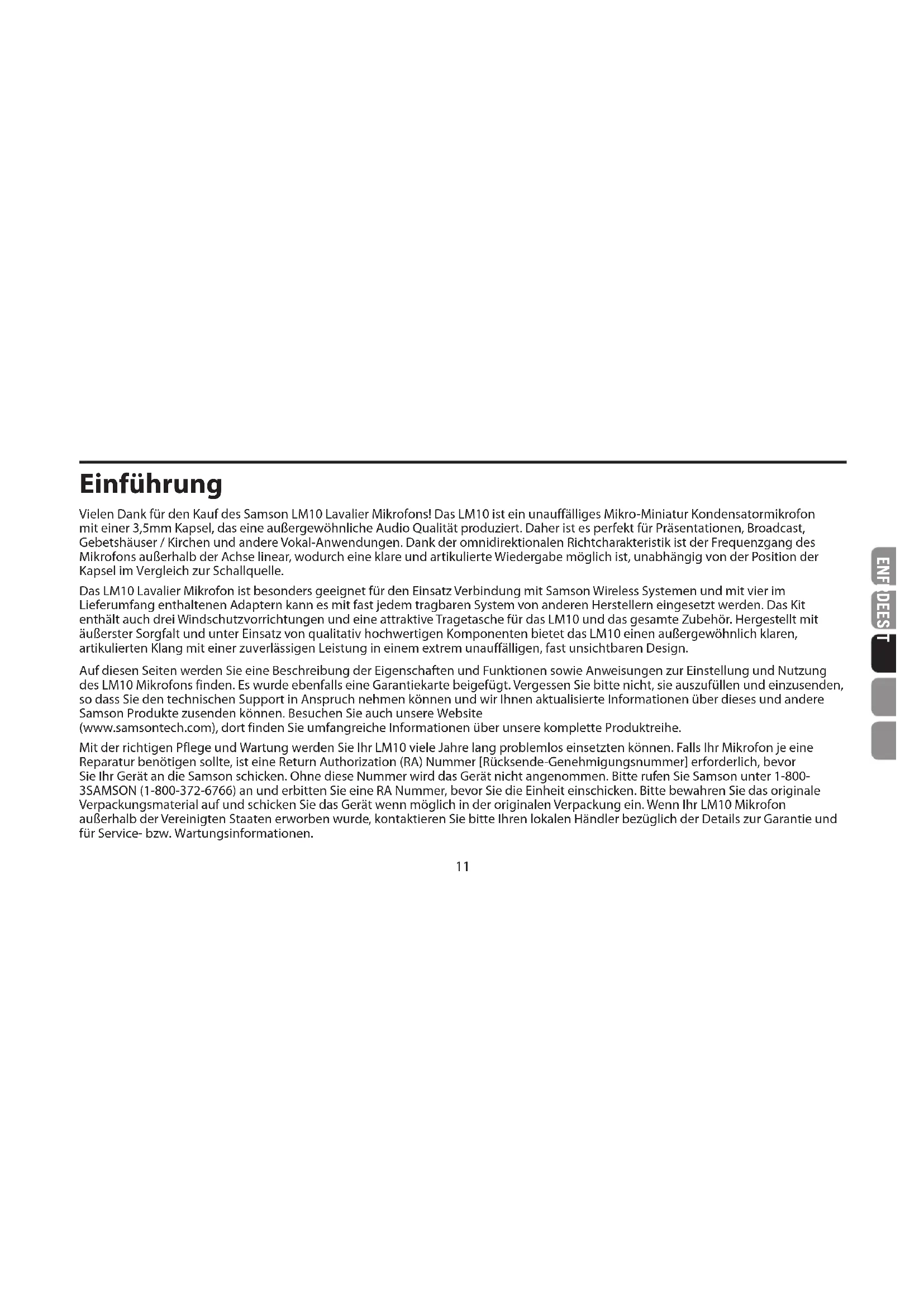 - Pour une utilisation en plein air ou pour atténuer le bruit de souffle, mettez en place l'un des deux paravents fournis d'origine.10 Schéma polaire : Réponse en fréquence Elément: . . . . . . . . . . . . . . .Condensateur à électret au dos Schéma polaire : . . . . . . . . . .omnidirectionnel Réponse en fréquence . . . . . .20/20KHz Sensibilité: . . . . . . . . . . . . .-45 ±3 dB 1V/Pa à 1khz Impédance de sortie:. . . . . . .2 KΩ±30% SPL maxi : . . . . . . . . . . . . . .140dB Tension de fonctionnement: . .1,5-12V= Câble . . . . . . . . . . . . . . . . .Φ1,4 mm x 1,20m Poids . . . . . . . . . . . . . . . . .13 g Dimensions : . . . . . . . . . . . .ø3,5 mm Connecteur de sortie . . . . . . .2,50 m Adaptateurs fournis . . . . . . . .Shure, AT, AKG, Sennheiser Accessoires :. . . . . . . . . . . . .paravent, pince à cravate Ces spécifications sont susceptibles d'être modifiées sans préavis. Caractéristiques techniques11 EN FR DE ES IT Einführung Vielen Dank für den Kauf des Samson LM10 Lavalier Mikrofons! Das LM10 ist ein unauffälliges Mikro-Miniatur Kondensatormikrofon mit einer 3,5mm Kapsel, das eine außergewöhnliche Audio Qualität produziert. Daher ist es perfekt für Präsentationen, Broadcast, Gebetshäuser / Kirchen und andere Vokal-Anwendungen. Dank der omnidirektionalen Richtcharakteristik ist der Frequenzgang des Mikrofons außerhalb der Achse linear, wodurch eine klare und artikulierte Wiedergabe möglich ist, unabhängig von der Position der Kapsel im Vergleich zur Schallquelle. Das LM10 Lavalier Mikrofon ist besonders geeignet für den Einsatz Verbindung mit Samson Wireless Systemen und mit vier im Lieferumfang enthaltenen Adaptern kann es mit fast jedem tragbaren System von anderen Herstellern eingesetzt werden. Das Kit enthält auch drei Windschutzvorrichtungen und eine attraktive Tragetasche für das LM10 und das gesamte Zubehör. Hergestellt mit äußerster Sorgfalt und unter Einsatz von qualitativ hochwertigen Komponenten bietet das LM10 einen außergewöhnlich klaren, artikulierten Klang mit einer zuverlässigen Leistung in einem extrem unauffälligen, fast unsichtbaren Design. Auf diesen Seiten werden Sie eine Beschreibung der Eigenschaften und Funktionen sowie Anweisungen zur Einstellung und Nutzung des LM10 Mikrofons finden. Es wurde ebenfalls eine Garantiekarte beigefügt. Vergessen Sie bitte nicht, sie auszufüllen und einzusenden, so dass Sie den technischen Support in Anspruch nehmen können und wir Ihnen aktualisierte Informationen über dieses und andere Samson Produkte zusenden können. Besuchen Sie auch unsere Website (www.samsontech.com), dort finden Sie umfangreiche Informationen über unsere komplette Produktreihe. Mit der richtigen Pflege und Wartung werden Sie Ihr LM10 viele Jahre lang problemlos einsetzten können. Falls Ihr Mikrofon je eine Reparatur benötigen sollte, ist eine Return Authorization (RA) Nummer [Rücksende-Genehmigungsnummer] erforderlich, bevor Sie Ihr Gerät an die Samson schicken. Ohne diese Nummer wird das Gerät nicht angenommen. Bitte rufen Sie Samson unter 1-800- 3SAMSON (1-800-372-6766) an und erbitten Sie eine RA Nummer, bevor Sie die Einheit einschicken. Bitte bewahren Sie das originale Verpackungsmaterial auf und schicken Sie das Gerät wenn möglich in der originalen Verpackung ein. Wenn Ihr LM10 Mikrofon außerhalb der Vereinigten Staaten erworben wurde, kontaktieren Sie bitte Ihren lokalen Händler bezüglich der Details zur Garantie und für Service- bzw. Wartungsinformationen.12 LM10 Funktionen Das LM10 omnidirektionele Lavalier Mikrofon bietet eine ausgezeichnete Stimmenwiedergabe in einem fast unsichtbaren, flachen Design. Foldend werden die wichtigsten Funktionen und Eigenschaften des LM10 aufgeführt: