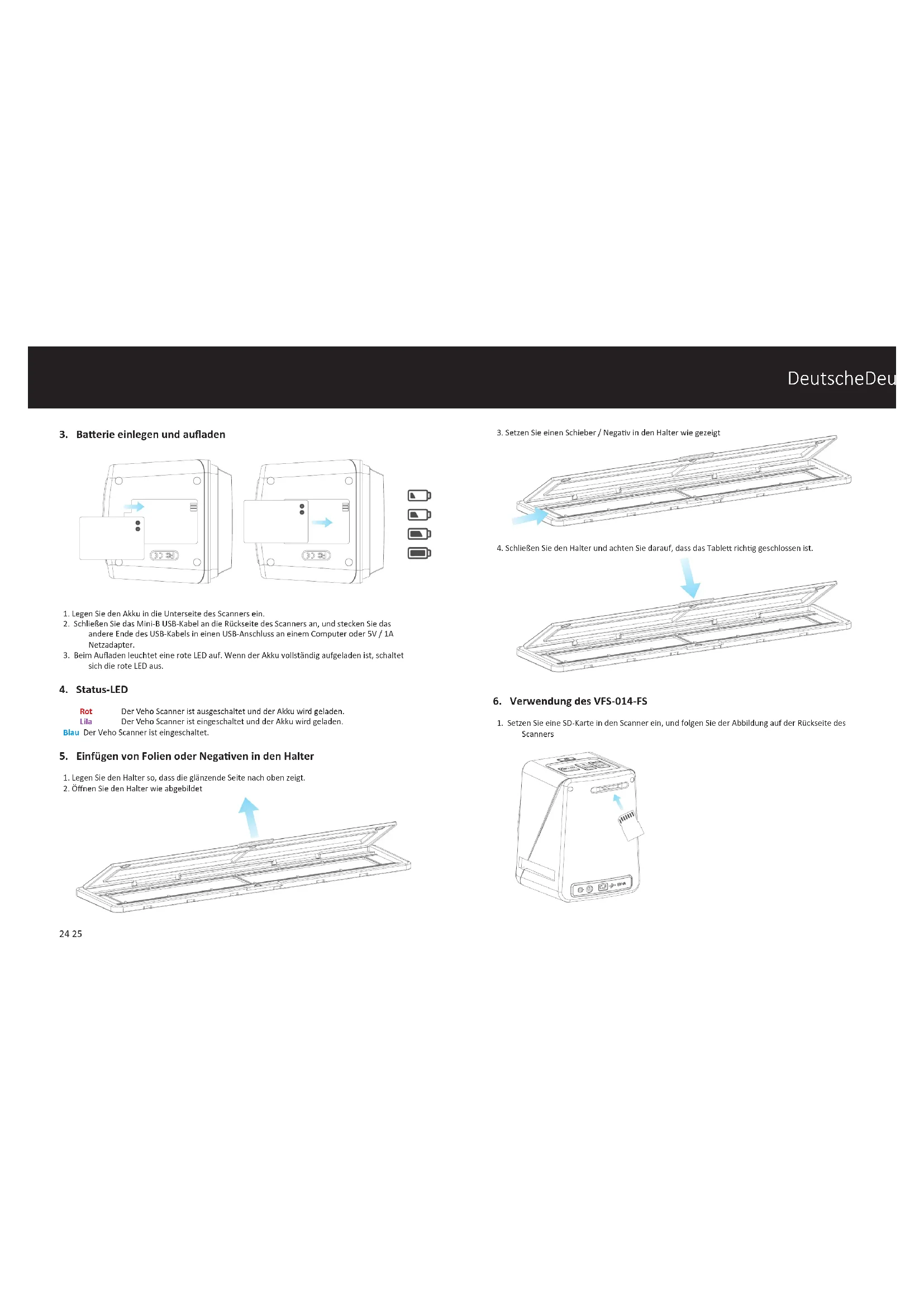 Technische Daten Bildsensor 1 / 2,33" 14 Mega CMOS Sensor Vorschau und Bewertung 2.4" Farb-LCD-Anzeige Objekv Spezikaon F = 4,8, f = 12,95 mm Farbbalance Automasch Belichtungssteuerung Automasche und manuelle Einstellung Unterstützte Filmgröße Auto Cropping 135 Negave & Slide (3: 2) 110 Negav (4: 3) 126 Negav (1: 1) Unterstützter Filmtyp Auto Converng 135 rutschen Farbnegavlm (135, 110 & 126) Black & White Negave Film Fokussierung feste Fokus EV-Einstellung + - 2,0 EV PC-Schnistelle USB 2.0 Bildformat 135 Negave 3: 2-Verhältnis 110 Negaves 4: 3 Verhältnis 126 Negaves 1: 1 Verhältnis Lichtquelle 3 weiße LED Leistung Von USB-Hafen, Li-Ion 3.7V / 1050mAh Baerie, TV-System NTSC und PAL Maße 14,4 (H) x 11,6 (W) x 11,9 (L) cm Icons & Indikatoren System Anforderungen PC-Systemanforderungen ¢ Penum® P4 1.6GHz oder gleichwerg AMD Athlon ¢ Freier USB2.0 Port ¢ 512MB RAM ¢ 500 MB freier Festplaenspeicher ¢ 1024 x 768 Pixel Farbmonitor ¢ CD-ROM-Laufwerk ¢ Windows® XP Service Pack II / Vista™, 32/64 Bits Windows 7 / Windows 8 / Windows 10 Mac Systemanforderungen ¢ PowerPC G5 oder Intel Core Duo Prozessor empfohlen ¢ Freier USB2.0 Port ¢ 768MB RAM ¢ 500 MB freier Festplaenspeicher ¢ 1024 x 768 Farbmonitor ¢ CD-ROM-Laufwerk ¢ Mac 10.5 ~ Up Dieses Symbol auf dem Produkt oder in der Anleitung bedeutet, dass Ihr Elektro- und Elektronikgerät am Ende seiner Lebensdauer getrennt von Ihrem Hausmüll entsorgt werden muss. Es gibt getrennte Sammelsysteme für das Recycling in der EU. Für weitere Informaonen wenden Sie sich bie an die örtliche Behörde oder Ihren Händler, bei dem Sie das Produkt gekau haben. Bevor Sie den VFS-014-SF (Veho Scanner) verwenden, stellen Sie bie sicher, dass Sie die unten beschriebenen Sicherheitsvorkehrungen lesen und verstehen. Achten Sie stets darauf, dass der VFS-014-SF korrekt betrieben wird. Betreiben Sie niemals den VFS-014-SF innerhalb eines Flugzeugs oder irgendwo anders, wo der Betrieb solcher Geräte eingeschränkt ist. Unsachgemäße Verwendung scha das Risiko eines schweren Unfalls. 110 Negavlm Kartensperre 126 Negavlm Wiedergabemodus PC-SD-Kartenauswahl Diashow PC-SD-Karte Link-Verbunden Warte ab TV-Systemauswahl EV Kompensaonsindikator EV-Kompensaon Verfügbare Nummer in SD-Karte nehmen Baerie voll Löschen eines Baerie 2/3 Alles löschen Baerie 1/3 SD-Karte formaeren Akku leer Ja 135 rutschen Nein 135 Negave Filmkarte Fehler B / W 135 Negavlm Karte voll DeutscheDeutsche32 33 Versuchen Sie nicht, den Fall des VFS-014-SF zu önen oder den VFS-014-SF in irgendeiner Weise zu modizieren. Hochspannungs- Innenkomponenten erzeugen das Risiko eines elektrischen Schlags, wenn sie ausgesetzt sind. Wartungs- und Reparaturarbeiten dürfen nur von autorisierten Serviceanbietern durchgeführt werden. Halten Sie den VFS-014-SF von Wasser und anderen Flüssigkeiten fern. Verwenden Sie den VFS-014-SF nicht mit nassen Händen. Benutzen Sie den VFS-014-SF niemals im Regen oder Schnee. Feuchgkeit erzeugt die Gefahr von Feuer und Stromschlag. Halten Sie den VFS-014-SF und sein Zubehör außerhalb der Reichweite von Kindern und Tieren, um Unfälle oder Schäden am VFS-014-SF zu vermeiden. Der VFS-014-SF kann während des Gebrauchs leicht warm werden. Dies ist normal und zeigt keine Störung an. Wenn das Äußere des VFS-014-SF gereinigt werden muss, wischen Sie es mit einem weichen, trockenen Tuch ab. Wenn Sie Rauch oder einen seltsamen Geruch aus dem VFS-014-SF bemerken, schalten Sie das Gerät sofort aus. Nehmen Sie den VFS-014- SF zum nächstgelegenen Service-Center zur Reparatur. Versuchen Sie niemals, den VFS-014-SF selbst zu reparieren. Verwenden Sie nur das empfohlene Netzteil. Die Verwendung von Stromquellen, die nicht ausdrücklich für den VFS-014-SF empfohlen werden, kann zu Überhitzung, Verzerrung des Gerätes, Feuer, Stromschlag oder anderen Gefahren führen. FCC Hinweis Dieses Gerät wurde getestet und entspricht den Grenzwerten für ein Gerät der Klasse B, gemäß Teil 15 der FCC-Besmmungen. Diese Grenzwerte sind so ausgelegt, dass sie einen angemessenen Schutz gegen schädliche Störungen in einer Wohnanlage bieten. Dieses Gerät erzeugt und verwendet Hochfrequenzenergie. Wenn es nicht gemäß den Anweisungen installiert und verwendet wird, kann es zu schädlichen Störungen der Funkkommunikaon kommen. Es besteht jedoch keine Garane, dass bei einer besmmten Installaon keine Störungen aureten. Wenn dieses Gerät schädliche Störungen des Radio- oder Fernsehempfangs verursacht, die durch Einschalten des Gerätes besmmt werden können, wird der Benutzer aufgefordert, die Störung durch einen oder mehrere der folgenden Vorschläge zu beheben.