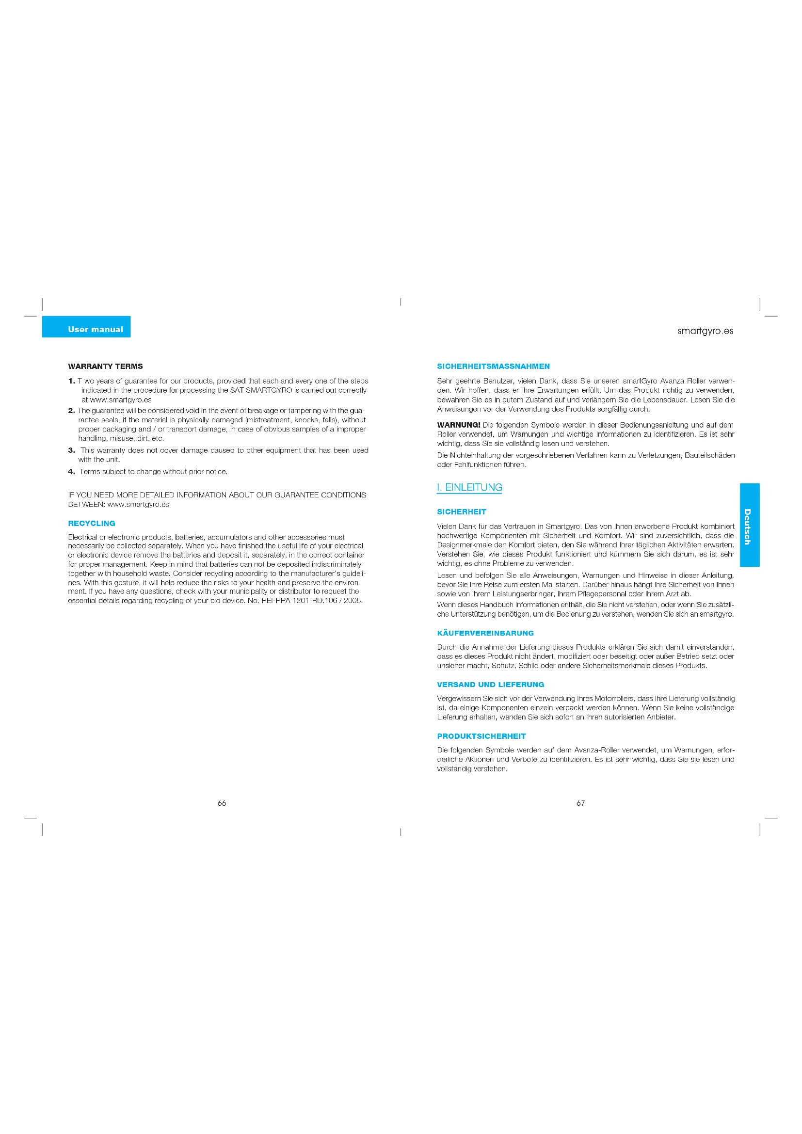 IF YOU NEED MORE DETAILED INFORMATION ABOUT OUR GUARANTEE CONDITIONS BETWEEN: www.smartgyro.es RECYCLING Electrical or electronic products, batteries, accumulators and other accessories must necessarily be collected separately. When you have nished the useful life of your electrical or electronic device remove the batteries and deposit it, separately, in the correct container for proper management. Keep in mind that batteries can not be deposited indiscriminately together with household waste. Consider recycling according to the manufacturer’s guideli- nes. With this gesture, it will help reduce the risks to your health and preserve the environ- ment. If you have any questions, check with your municipality or distributor to request the essential details regarding recycling of your old device. No. REI-RPA 1201-RD.106 / 2008. SICHERHEITSMASSNAHMEN Sehr geehrte Benutzer, vielen Dank, dass Sie unseren smartGyro Avanza Roller verwen- den. Wir hoffen, dass er Ihre Erwartungen erfüllt. Um das Produkt richtig zu verwenden, bewahren Sie es in gutem Zustand auf und verlängern Sie die Lebensdauer. Lesen Sie die Anweisungen vor der Verwendung des Produkts sorgfältig durch. WARNUNG! Die folgenden Symbole werden in dieser Bedienungsanleitung und auf dem Roller verwendet, um Warnungen und wichtige Informationen zu identifizieren. Es ist sehr wichtig, dass Sie sie vollständig lesen und verstehen. Die Nichteinhaltung der vorgeschriebenen Verfahren kann zu Verletzungen, Bauteilschäden oder Fehlfunktionen führen.