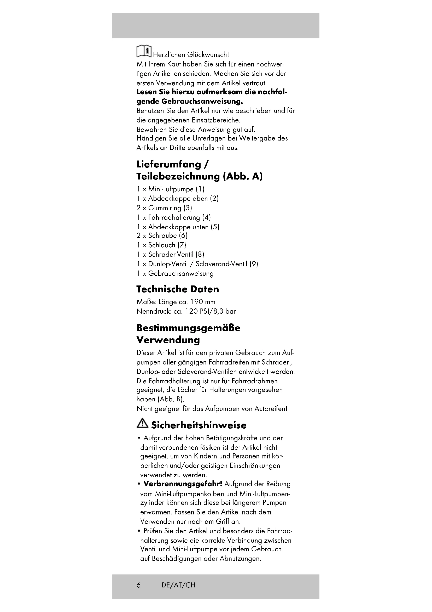 - Prüfen Sie den Artikel und besonders die Fahrrad- halterung sowie die korrekte Verbindung zwischen Ventil und Mini-Luftpumpe vor jedem Gebrauch auf Beschädigungen oder Abnutzungen. DE/AT/CH7DE/AT/CH
